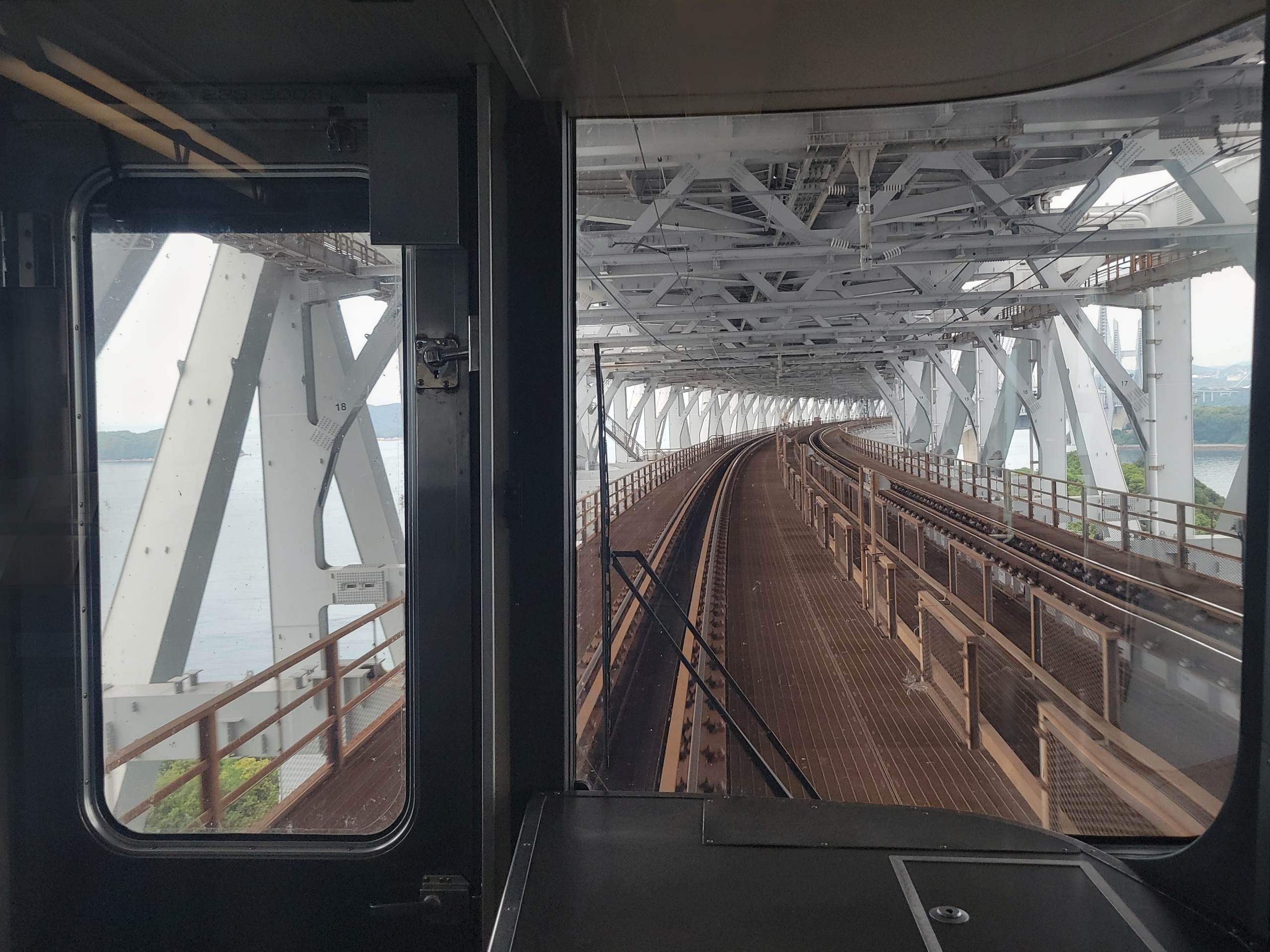 マリンライナー岡山行きの先頭は普通車。前面の眺めが楽しめるよう、運転席と客室の間の窓が大きく取られている。運転士は窓を全開にして風を受けながら運転しており、その様子がなんとも気持ちよさそうで、少し羨ましくなる。