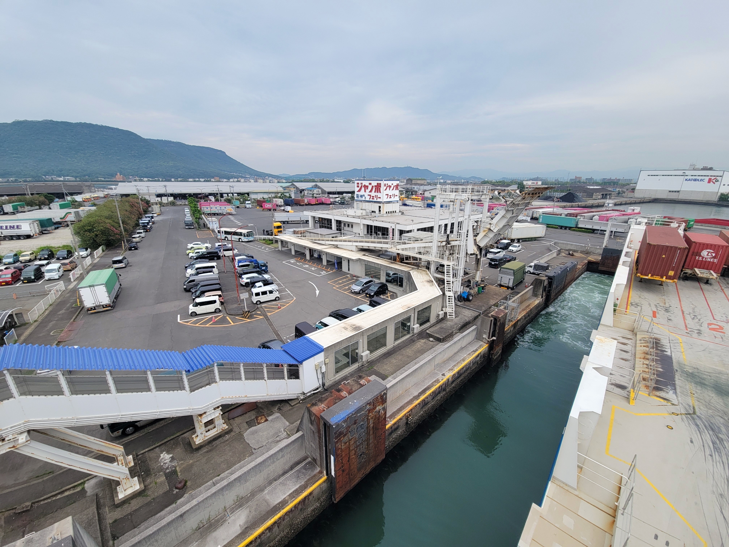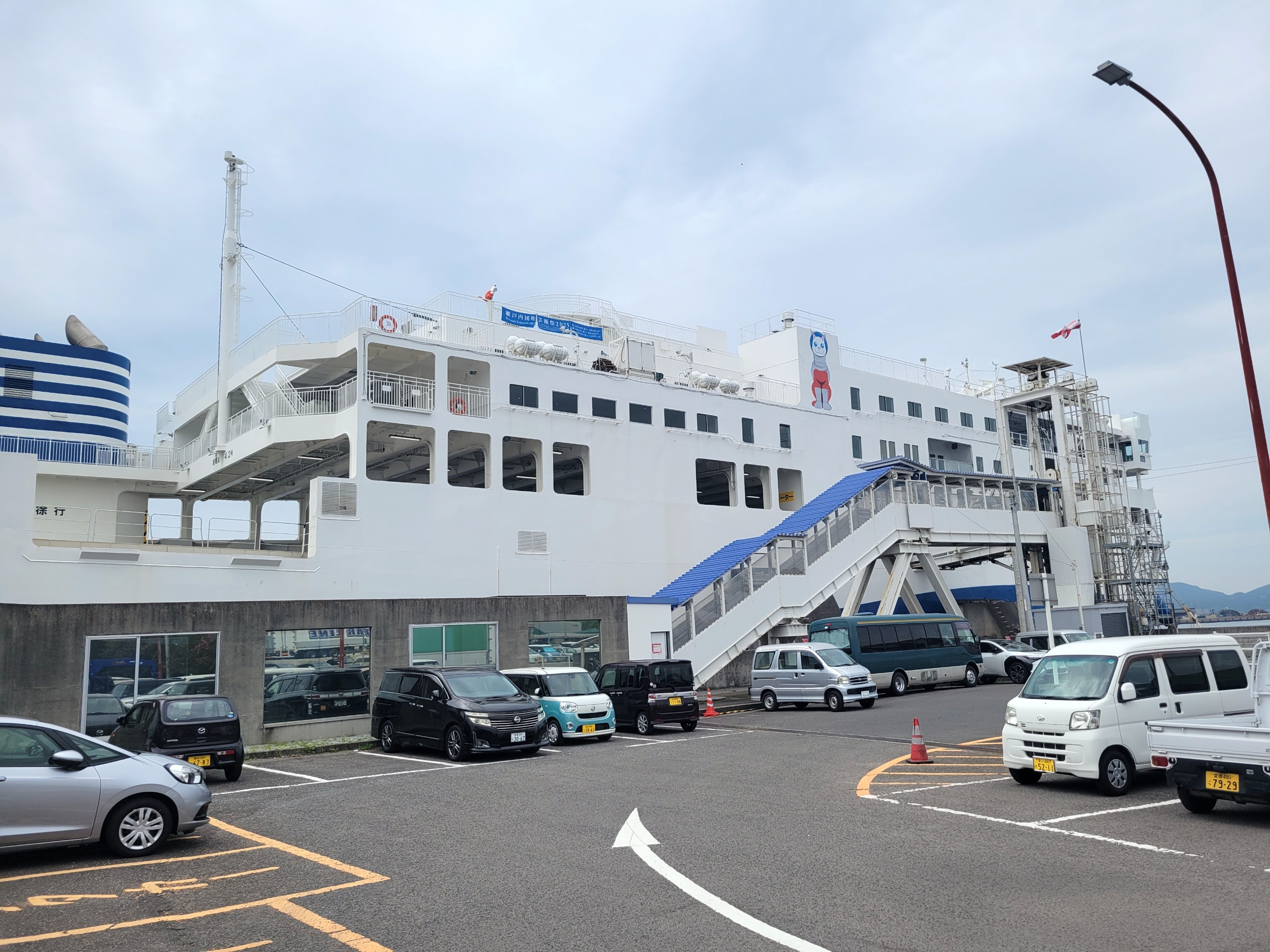 高松駅から10分ほどで、ジャンボフェリーが発着する東ターミナルへ到着。窓側の座席を確保したかったので、少し早めに来て乗船口に並ぶ。