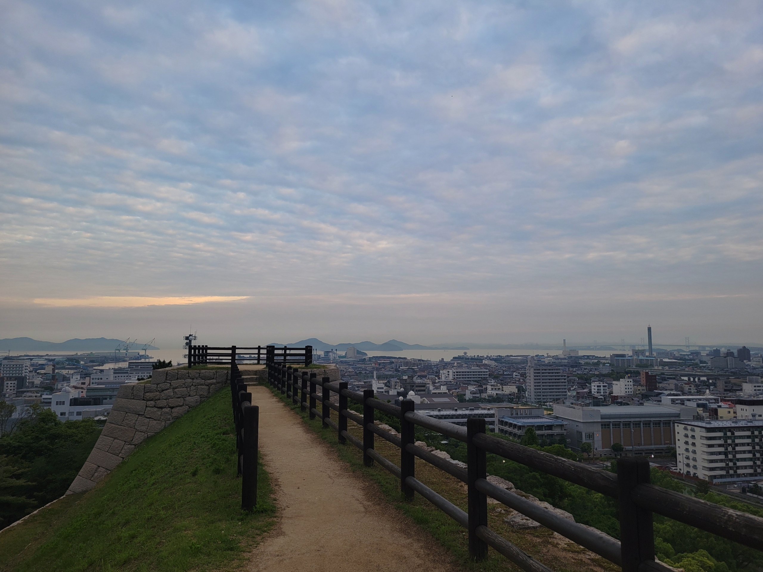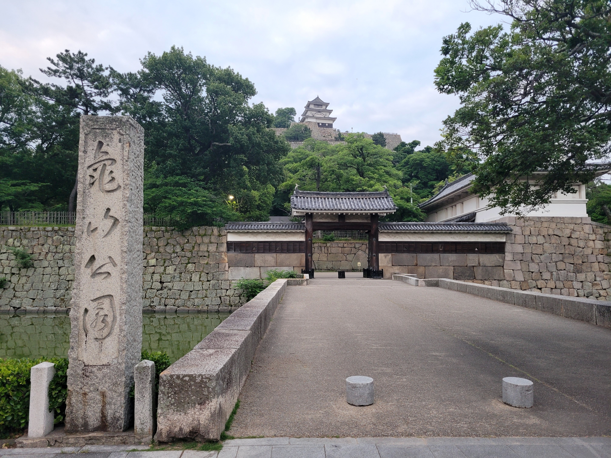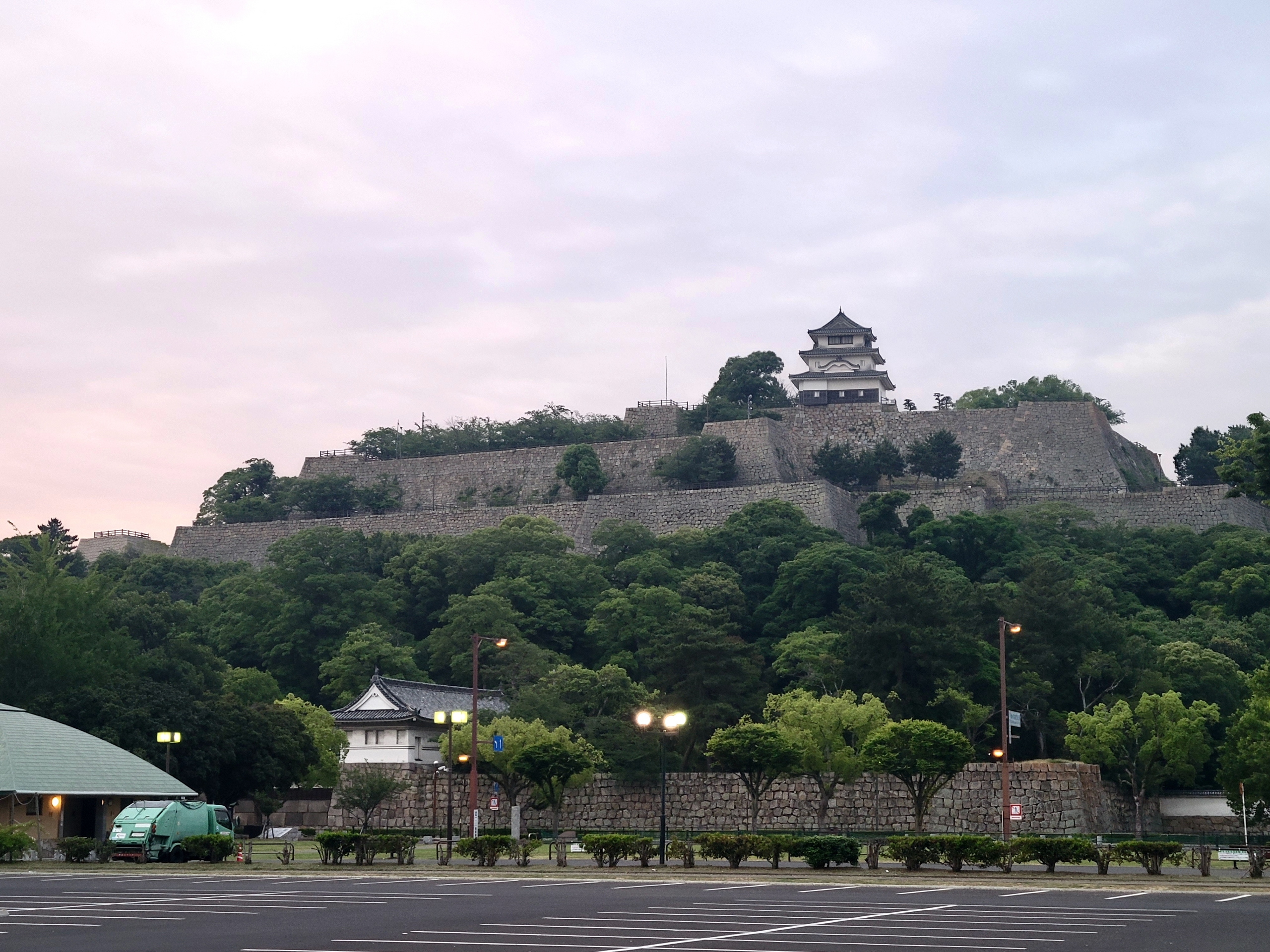 公園の名前は山の名前、亀山が使われているようです。立派な大手一の門をくぐり、見返り坂というまっすぐで長い坂を登ります。宿のシャワーは有料なので、汗をかかないようにゆっくりと登ります。周囲はまだ少し薄暗いけど、散歩している人がわりといました。丸亀は健康的な人が多いのかな。