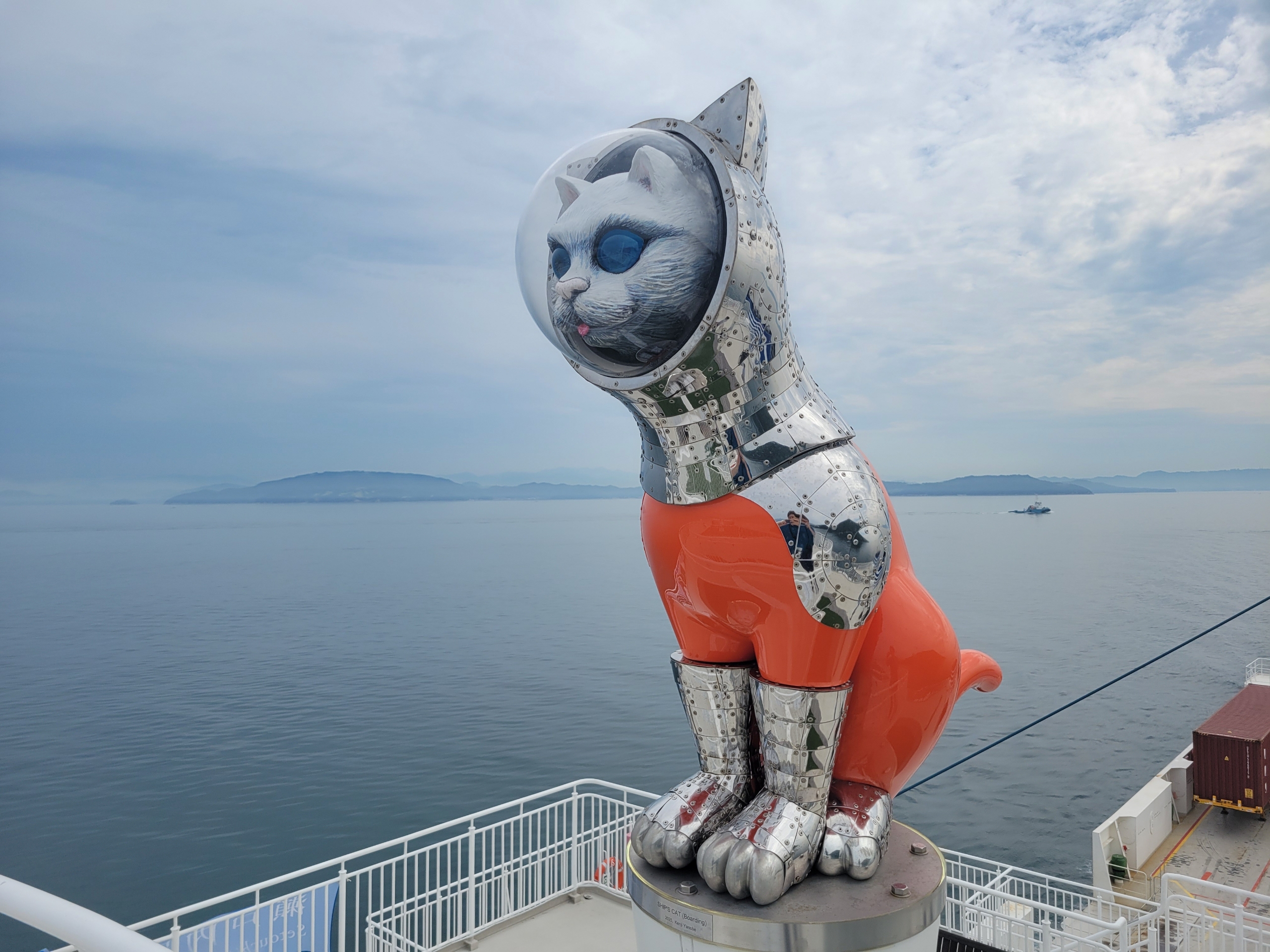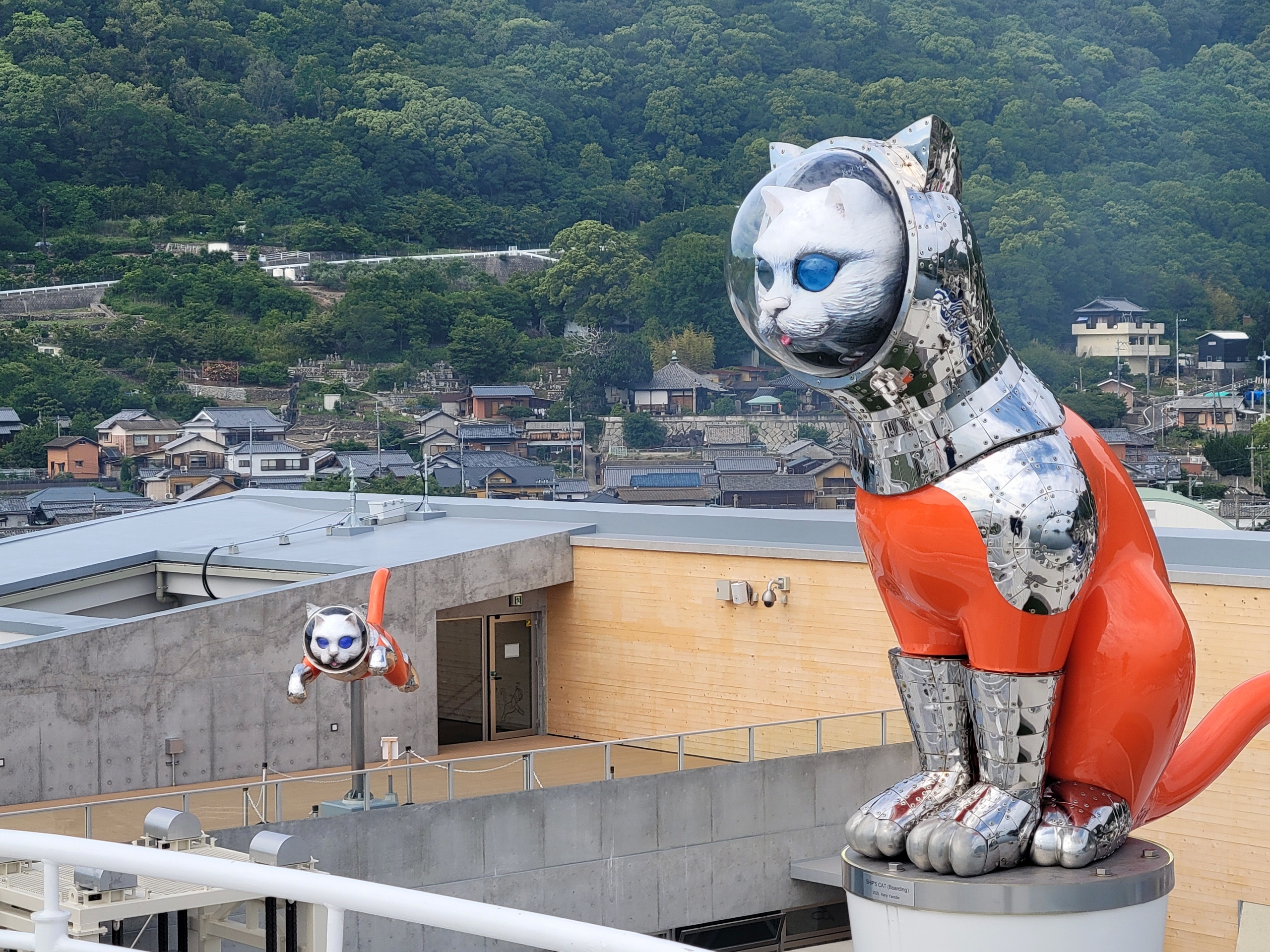 坂手港フェリーターミナルの屋上には、「SHIP’S CAT(Jumping)」が設置されている。船内にいる「Boarding」と対になる作品で、2体でひとつの『Journey of SHIP’S CAT』として構成。瀬戸内国際芸術祭の公式作品「sd63」にあたるものらしい。