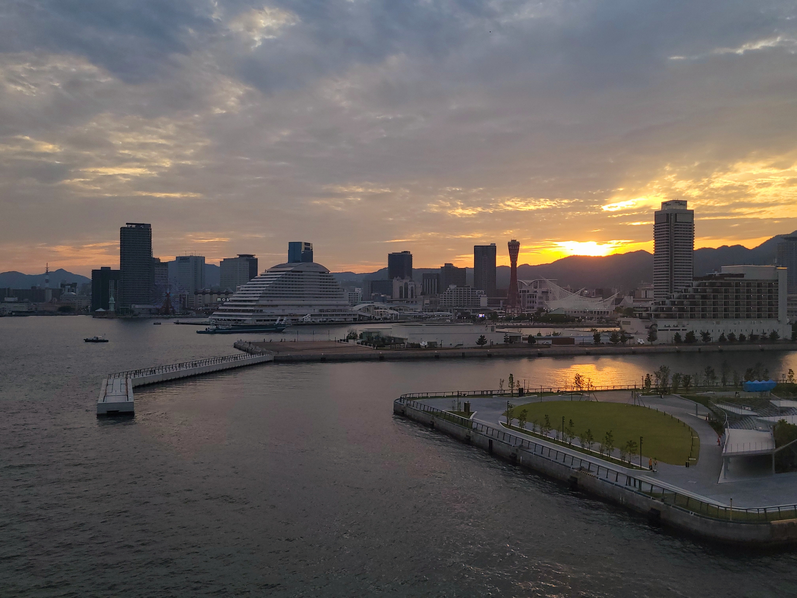 神戸港入港とほぼ同時に太陽は沈んでいきました。ふと隣を見ると、「ジーライオンアリーナ」という新しいホールができている。しばらく神戸に来ていなかったせいか、まったく知らなかった。