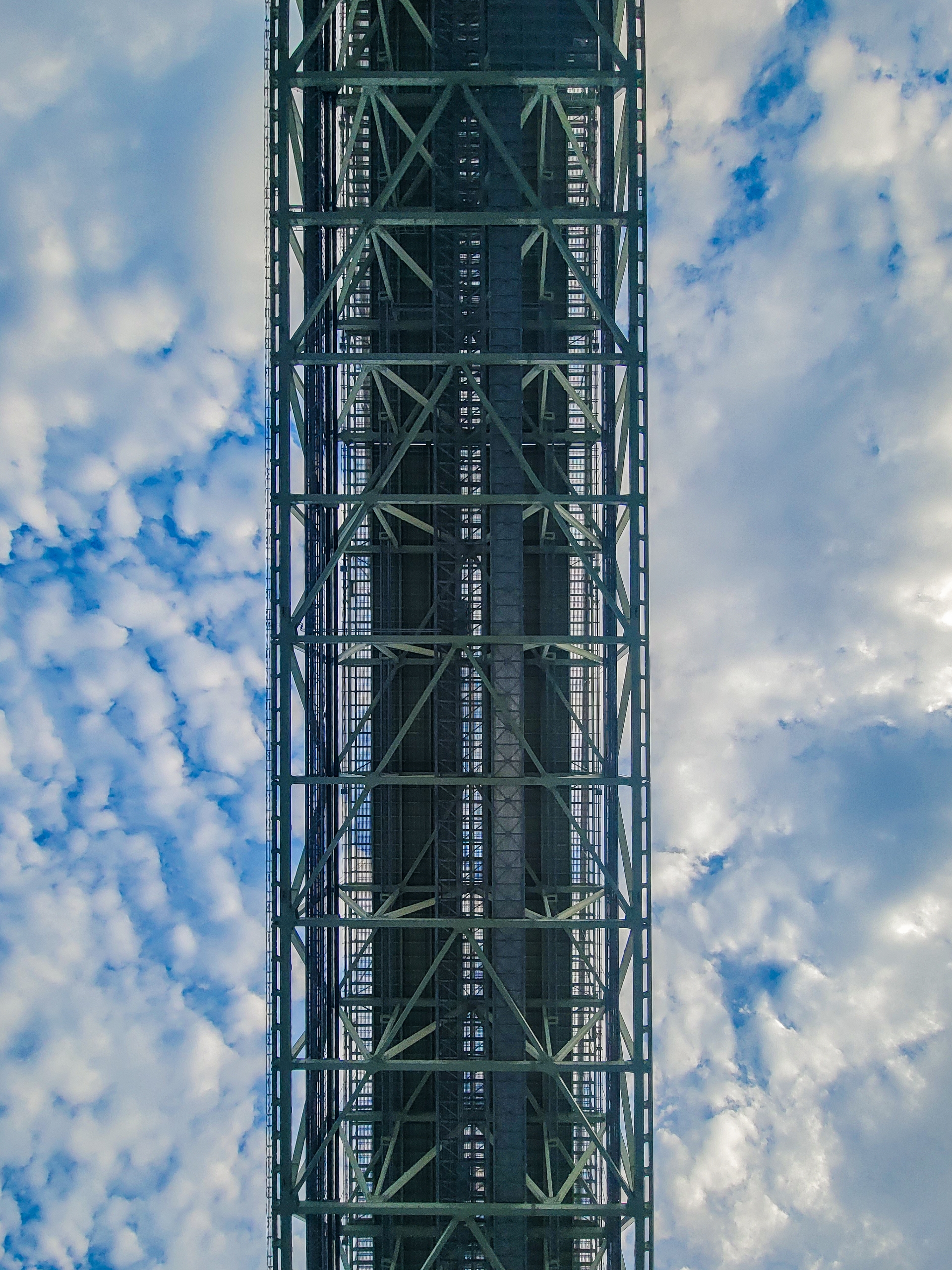 真下から見上げると、想像していたよりも鉄骨が多く、かなり抜けのある構造になっている。強い風を受け流すための設計なのかもしれない。