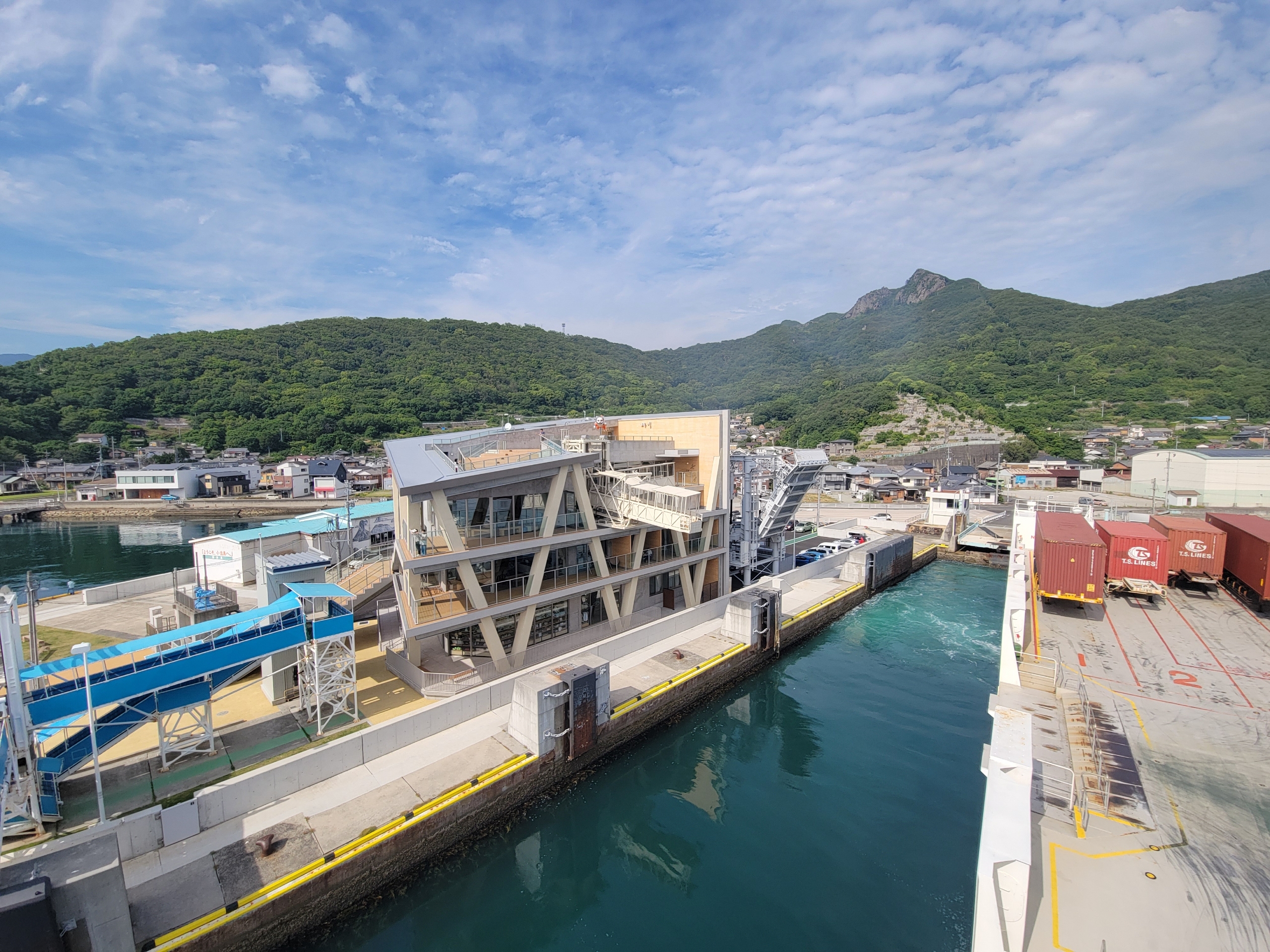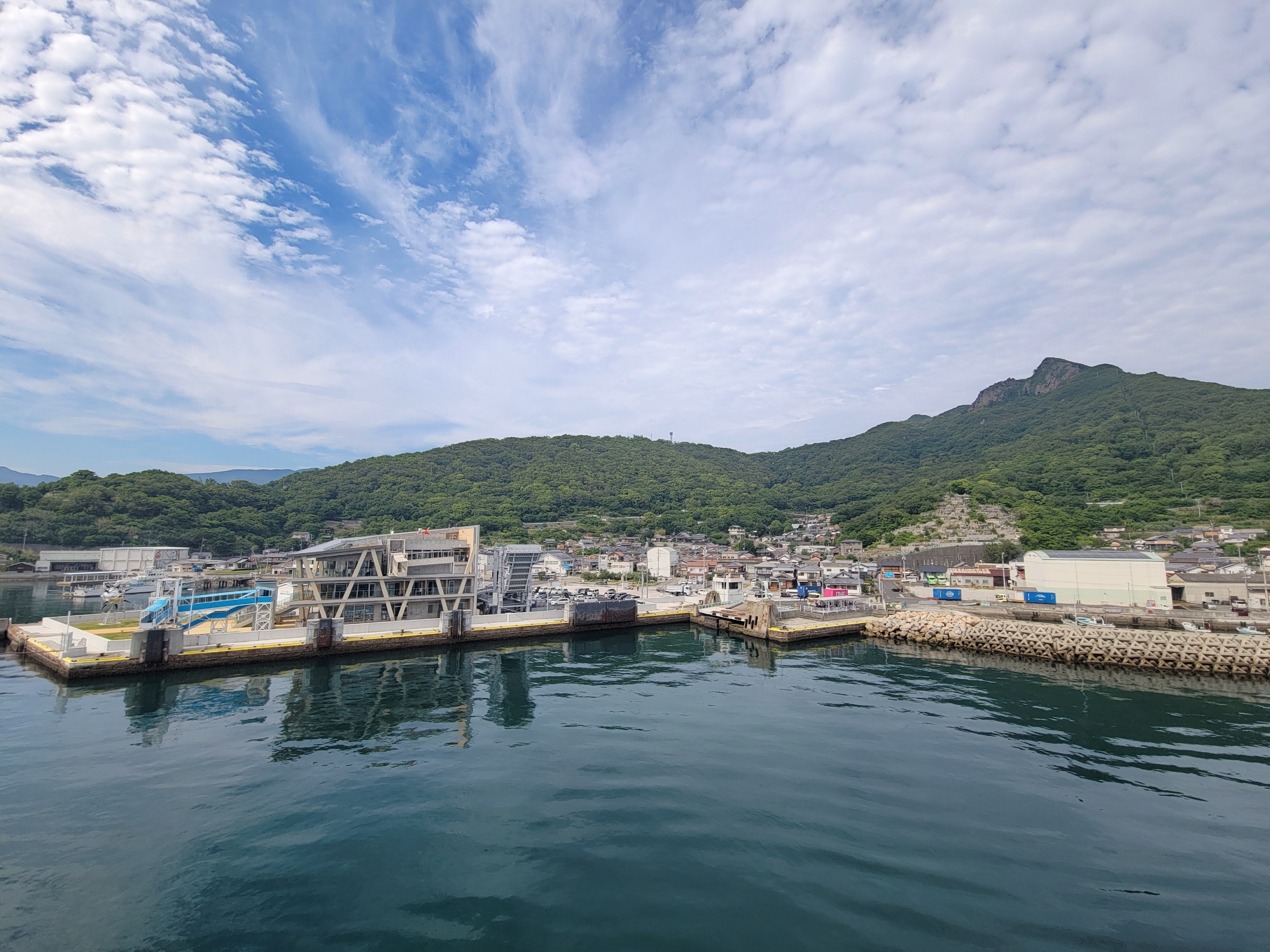 坂手港に入港前に急に青空が広がってきました。坂手港は、小豆島の中では便数が少ないのに、3階建ての立派なフェリーターミナル。見た感じも新しく、かなり豪華な造りだ。瀬戸内国際芸術祭にあわせて2013年に整備されたもの。