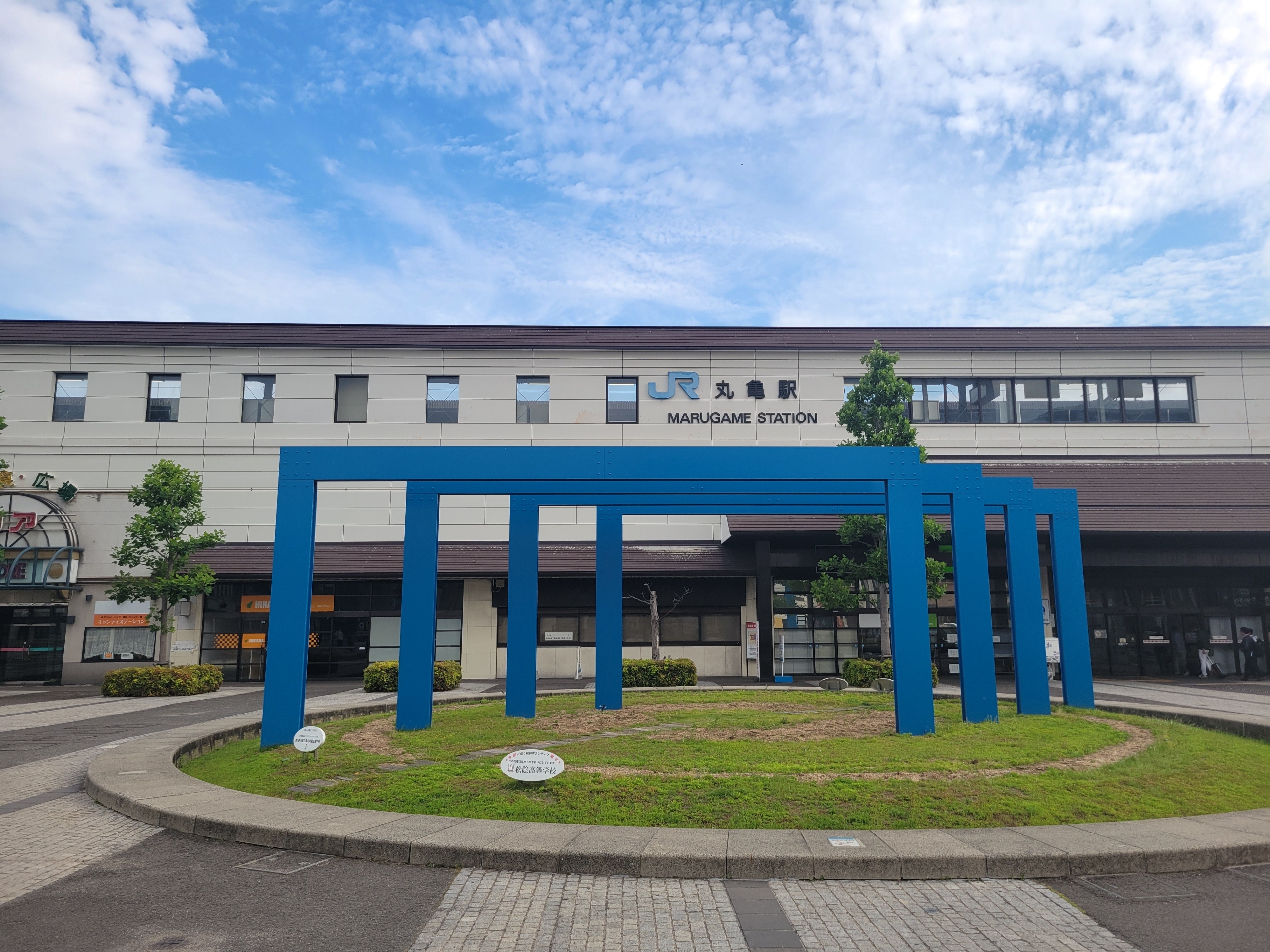 明るい時間帯の丸亀駅。瀬戸大橋の開通前年に高架化、電化されました。毎時1本、特急列車で乗り換えなしで岡山駅、高松駅、松山駅、高知駅へ行けるので、高松駅よりも利便性は高いかもしれないです。
