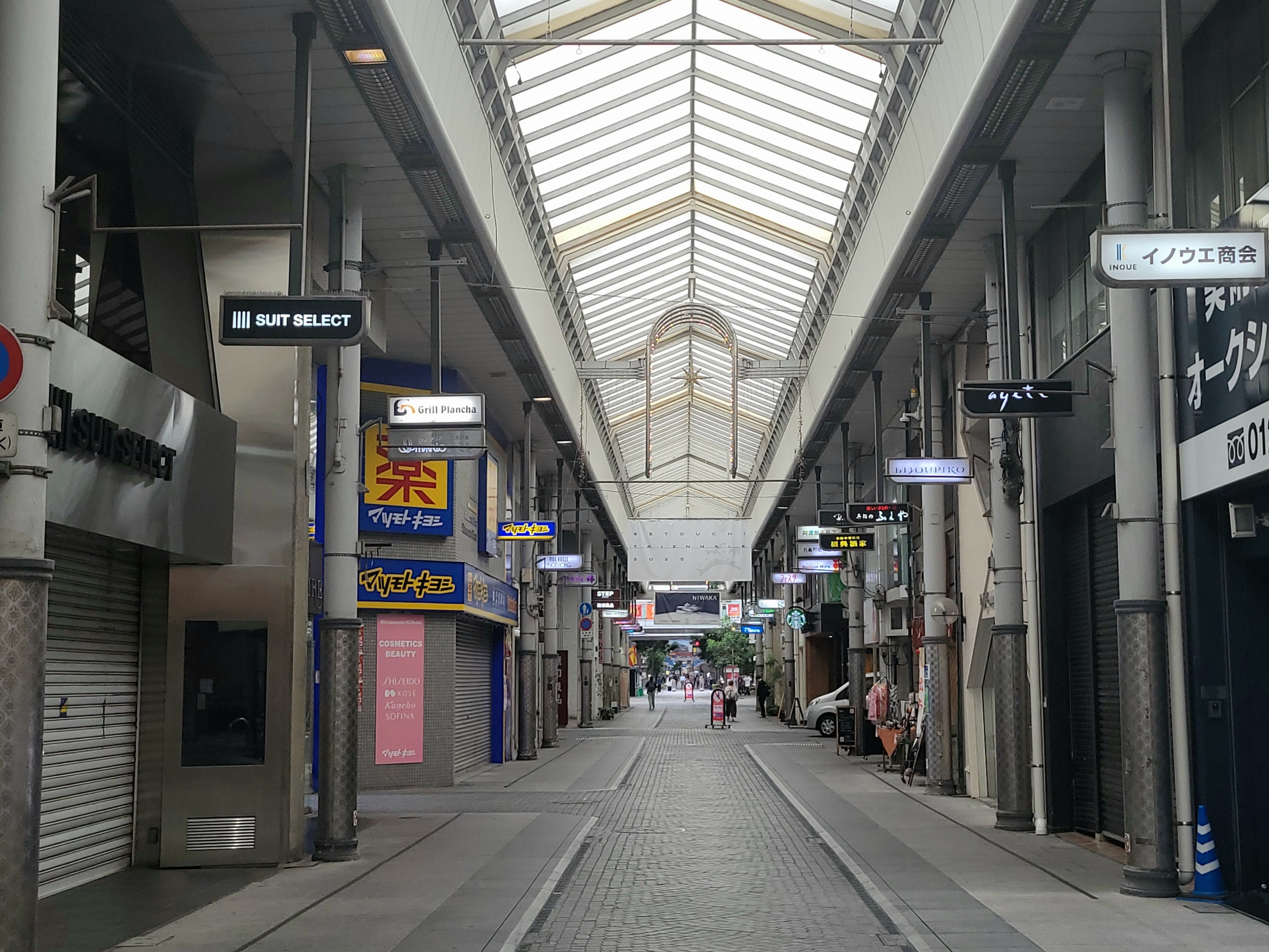 南北約300mも長さのある丸亀市通町商店街。この様子だと早朝だからじゃなくて、昼間もけっこうシャッターしまったままの予感がしますね。