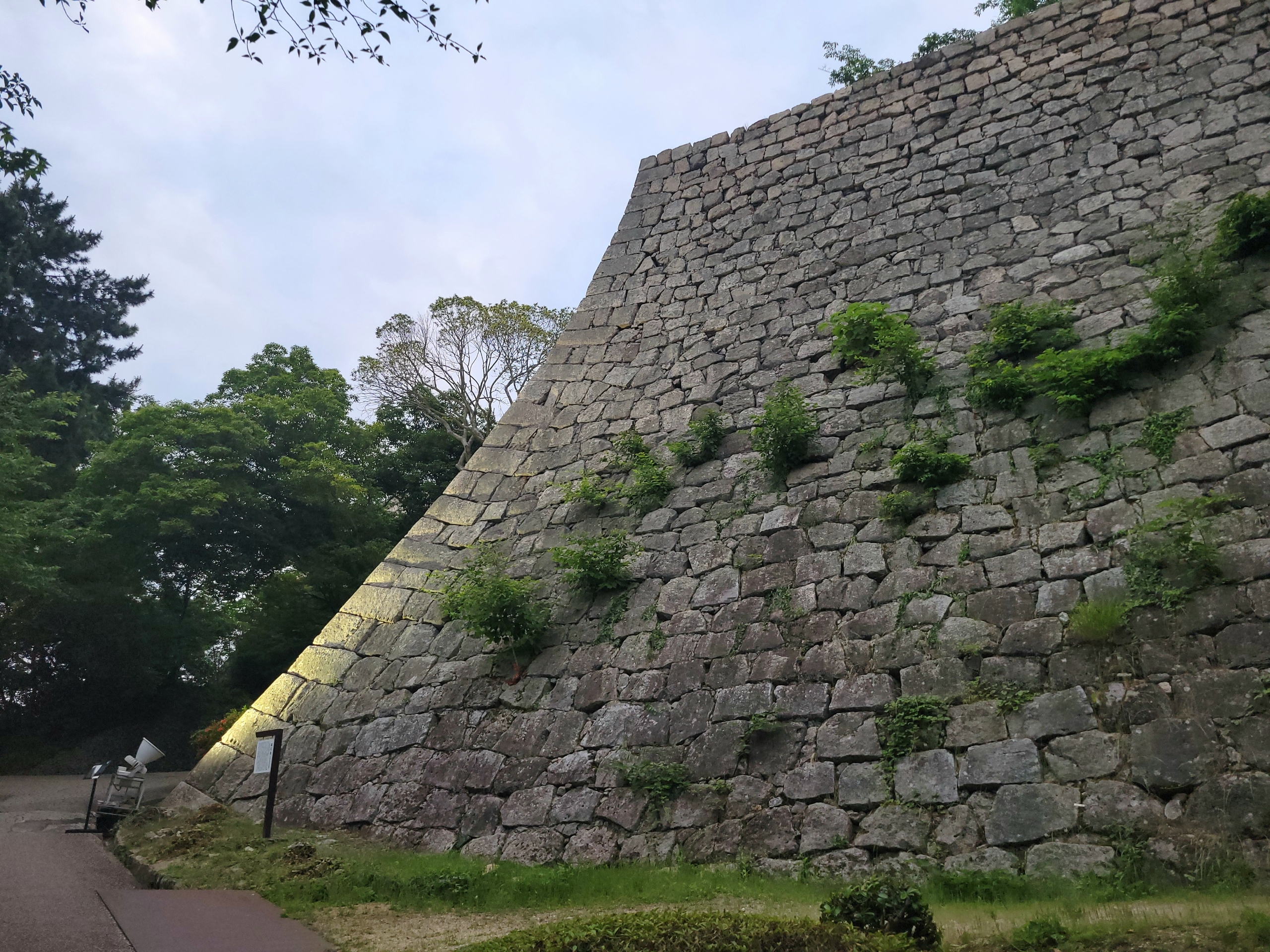 見返り坂を上り切ると、大きな石垣が目にとまります。この三の丸の石垣は丸亀城の中で最も高く20m以上もあるそうです。扇を開いたような緩やかな曲線を描いており、「扇の勾配」と呼ばれているそうです。ちなみにひとつの石垣の高さで日本一なのは、大阪城で33mあります。今見ている高石垣の1.5倍以上の高さがあるというのも驚きです。