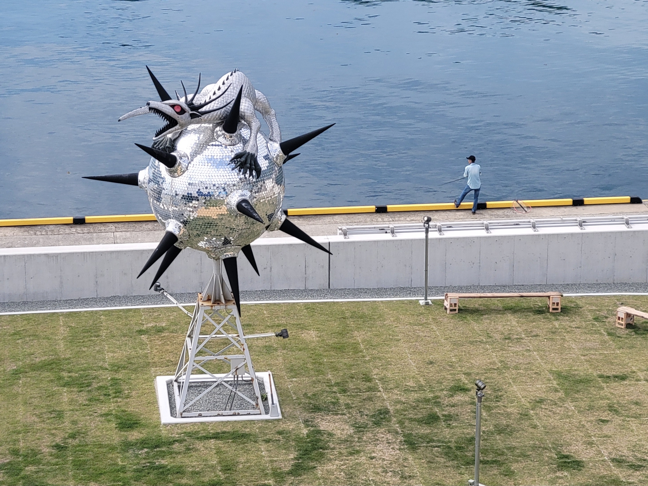 坂手港の堤防に、光る球体のオブジェがある。これも瀬戸内国際芸術祭2025の作品「Star Anger」。球体の中には、水の神である龍が描かれているが、瀬戸内海の自然や海との関わりをテーマにした作品で、龍は水を司る存在として表現されているとのこと。