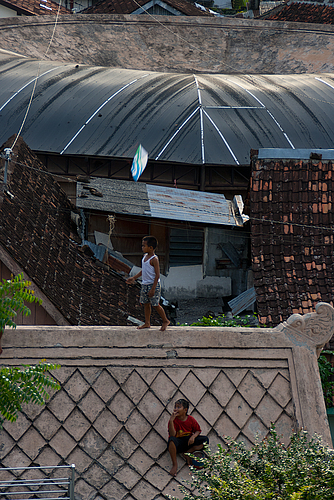 驚いたことに、屋根の上で子供たちが凧を揚げていました。