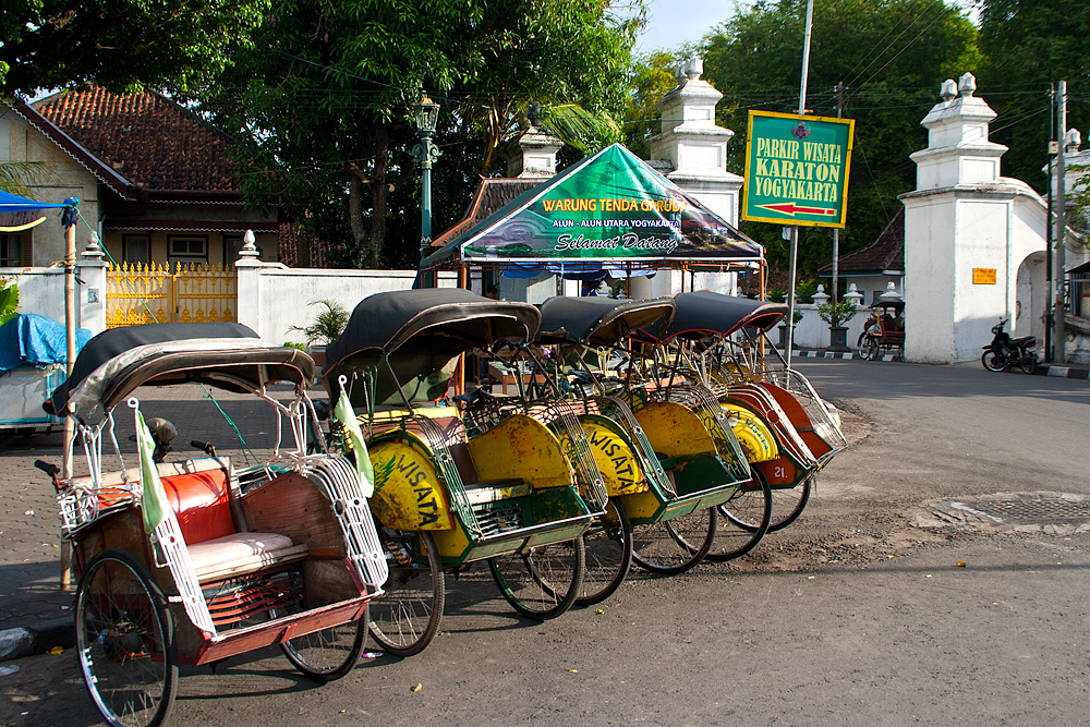 通りには多数のベチャ(人力車)が客待ちをしており、大きな声で客引きをするわけでもなく、どこかマイペースに構えているのが印象的です。