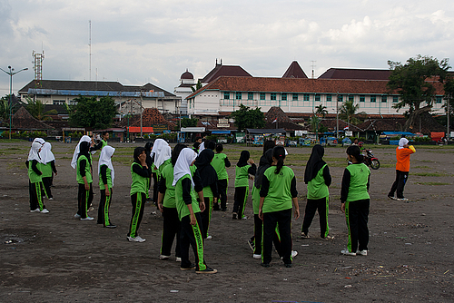 体育の授業らしいのですが、女子学生たちは鮮やかな緑色のジャージに身を包み、頭からスカーフをかぶっています。