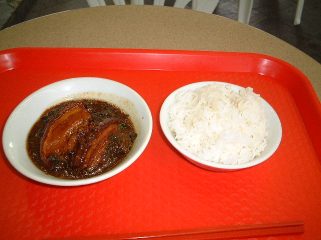 朝食は何にしようかなどと考えているうちに、昨日のブギス・ビレッジのホーカーズに向かっていた。11:00はまだ早いのだろうか?空いている店は半分もないようだ。もちろん食べている人も2~3人。入り口近くの豚の角煮のようなものに、目がとまった。梅菜扣肉(メイチャイコウロウ)。味付けは見た目ほど濃くなく、少し梅のような酸味がするがこれは高菜の漬物らしくこれがさっぱりしてて美味しい。豚のバラ肉は煮込まれていてとてもやらかい。白いご飯がとてもよくあう。ちなみにインディカ米だった。