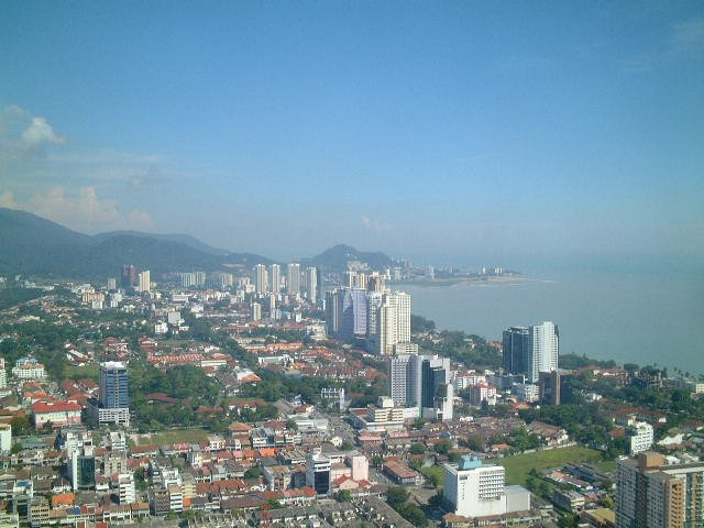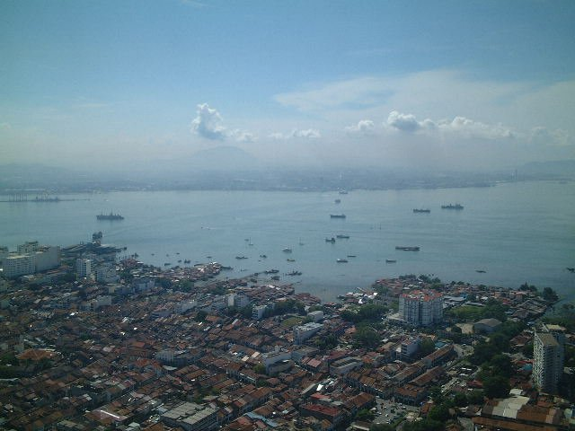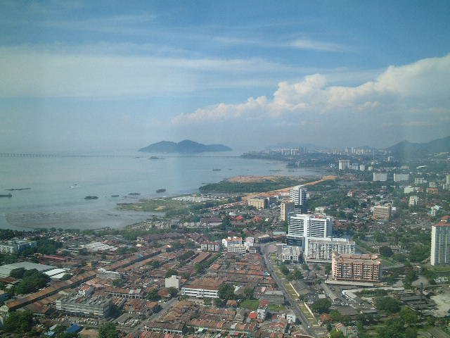 ホテルのチェックインの時間にはまだ時間があるので、コムタタワーにあがることにした。さっきから頻繁に出てくるコムタタワーはジョージタウンでは飛びぬけた65階建てのビルで、街を歩くときの目印にはとても便利。展望ラウンジがあるようで、そこにあがってから、ホテルに行くことにした。受付のおばちゃん?に「コンニチワ」と日本語で声をかけらた。やっぱり日本人と分かるのだろうか?なぜか日本では日本人に見えないとか色々いわれるのだが。エレベーターで58階まで上がっていくと、ジョージタウンの町並みが広がっていた。なるほどかなりの高さでよく景色が見渡せる。まず目に入ったのが、街にある建物の屋根がほとんど茶色いこと。カビのような色にも見えるので、まだまだ古い家が多いのだろうか。またバタワースまでのフェリーが行き交うのがよく見えるが、海はあまり綺麗ではないようで、港の近くには水上家屋も見られる。景色が綺麗な反面、ペナン島の暮らしが少し分かるようで面白かった。