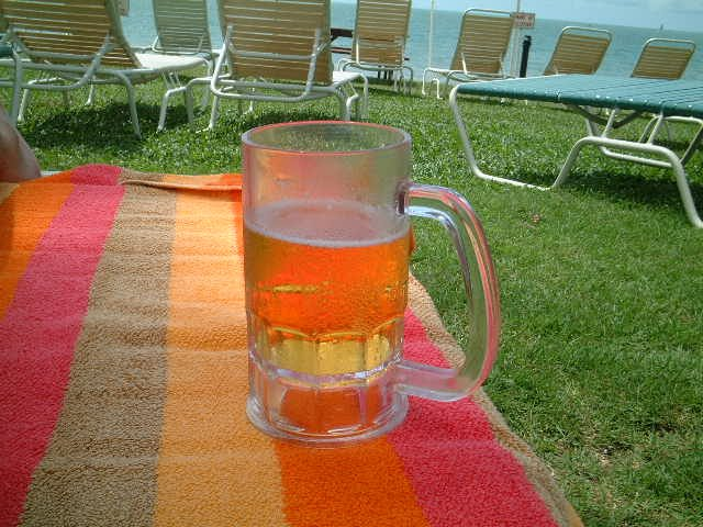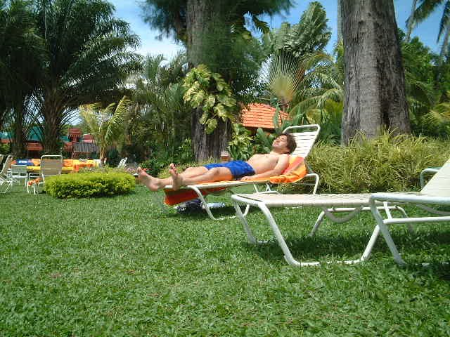カラフルなビーチタオルを借りて、ビーチマットでしばしくつろいだ。するとプールバーのスタッフがやってきて、「何か飲む?」と聞かれたので、迷わず口から「タイガービア!」と出てしまった。すると「カールスバーグなら1本頼むと1本フリーだよ。」と言われたので、これまた迷わず変更。結局1本タダかあ。こういうセールス方法は海外ではわりとあるようだ。おいしい冷たいビールを飲みながら、気持ちい海風を浴びて、裸でくつろぐ。これぞ、まさに最高のリゾートだ。