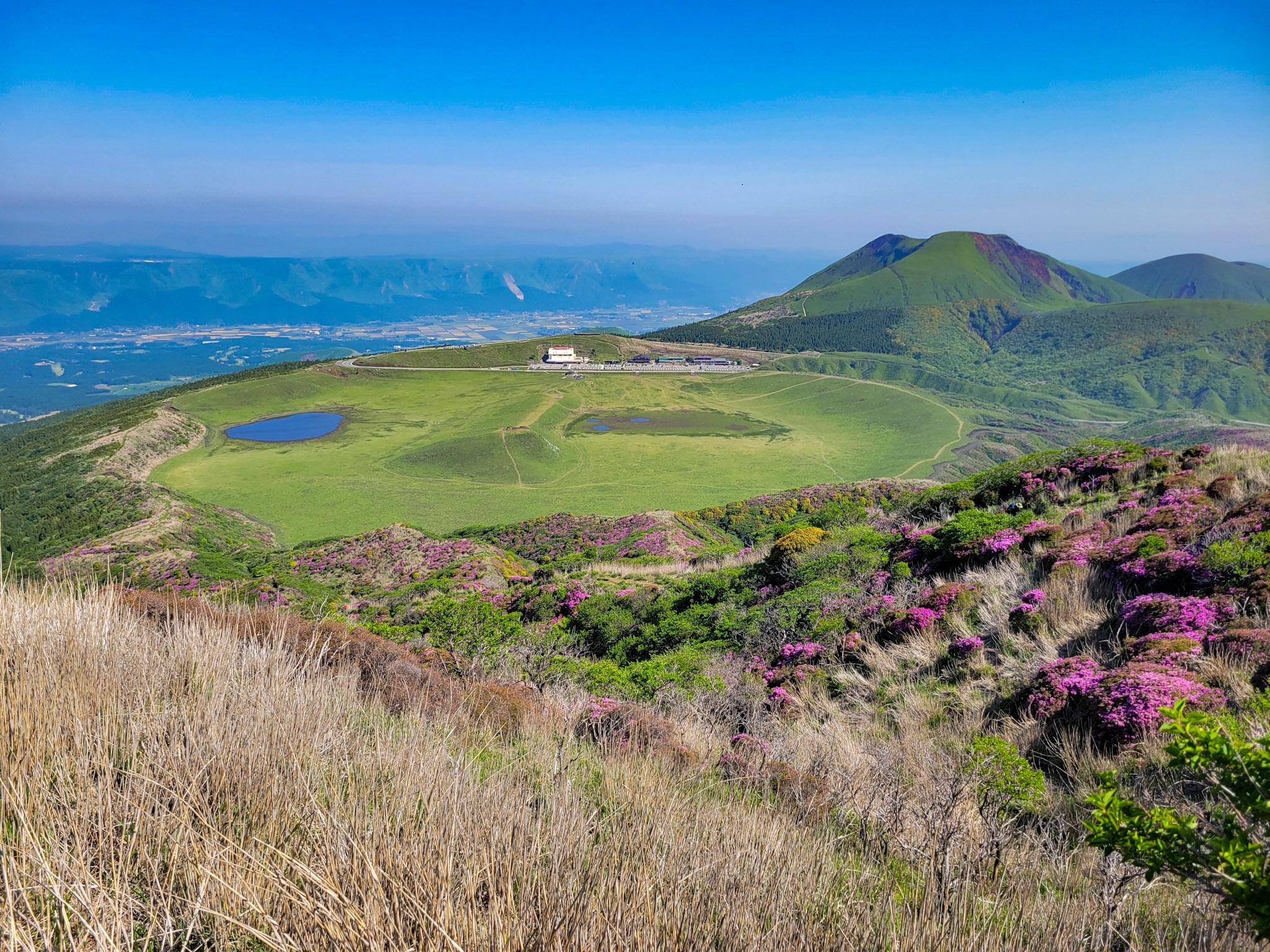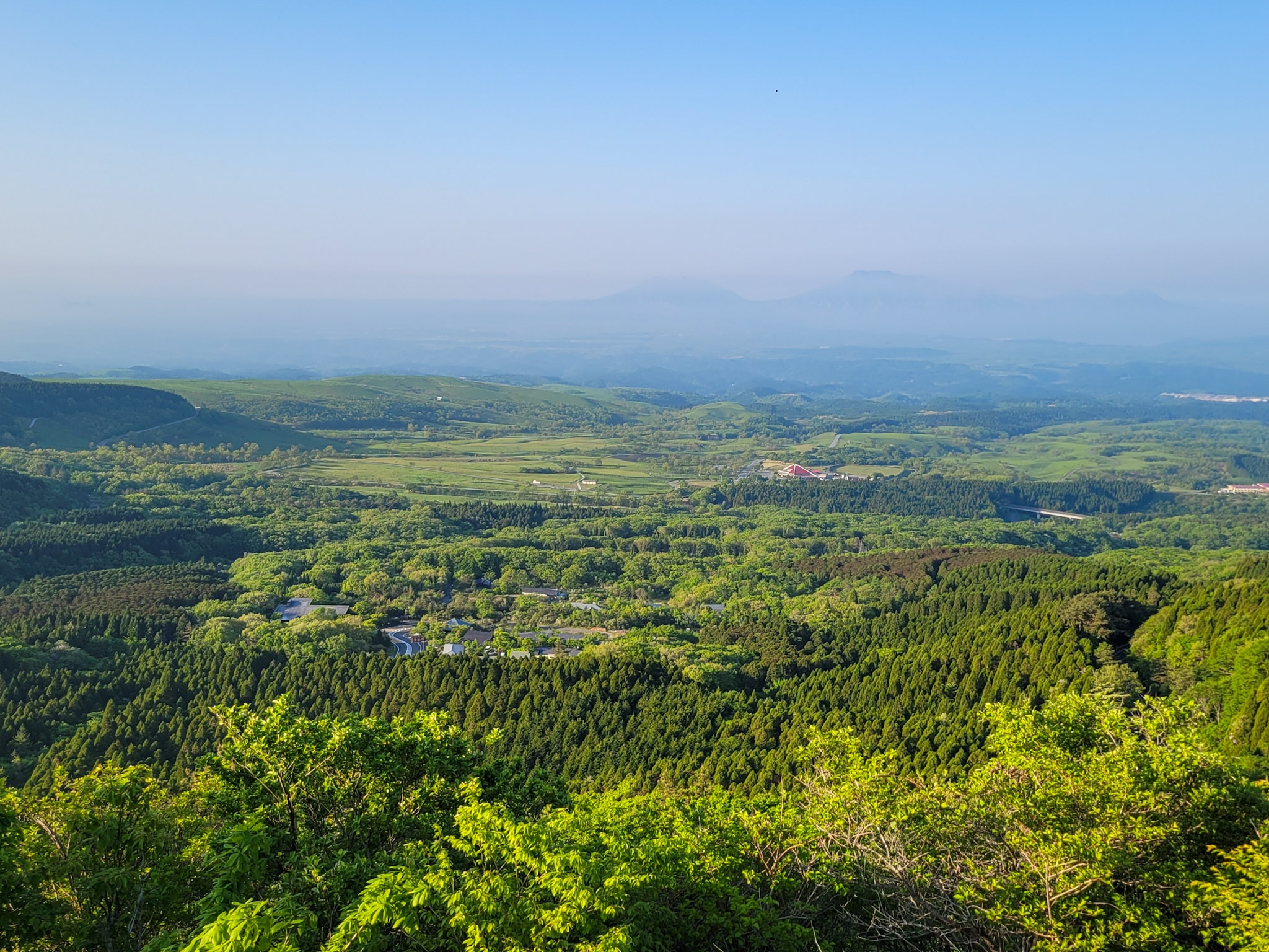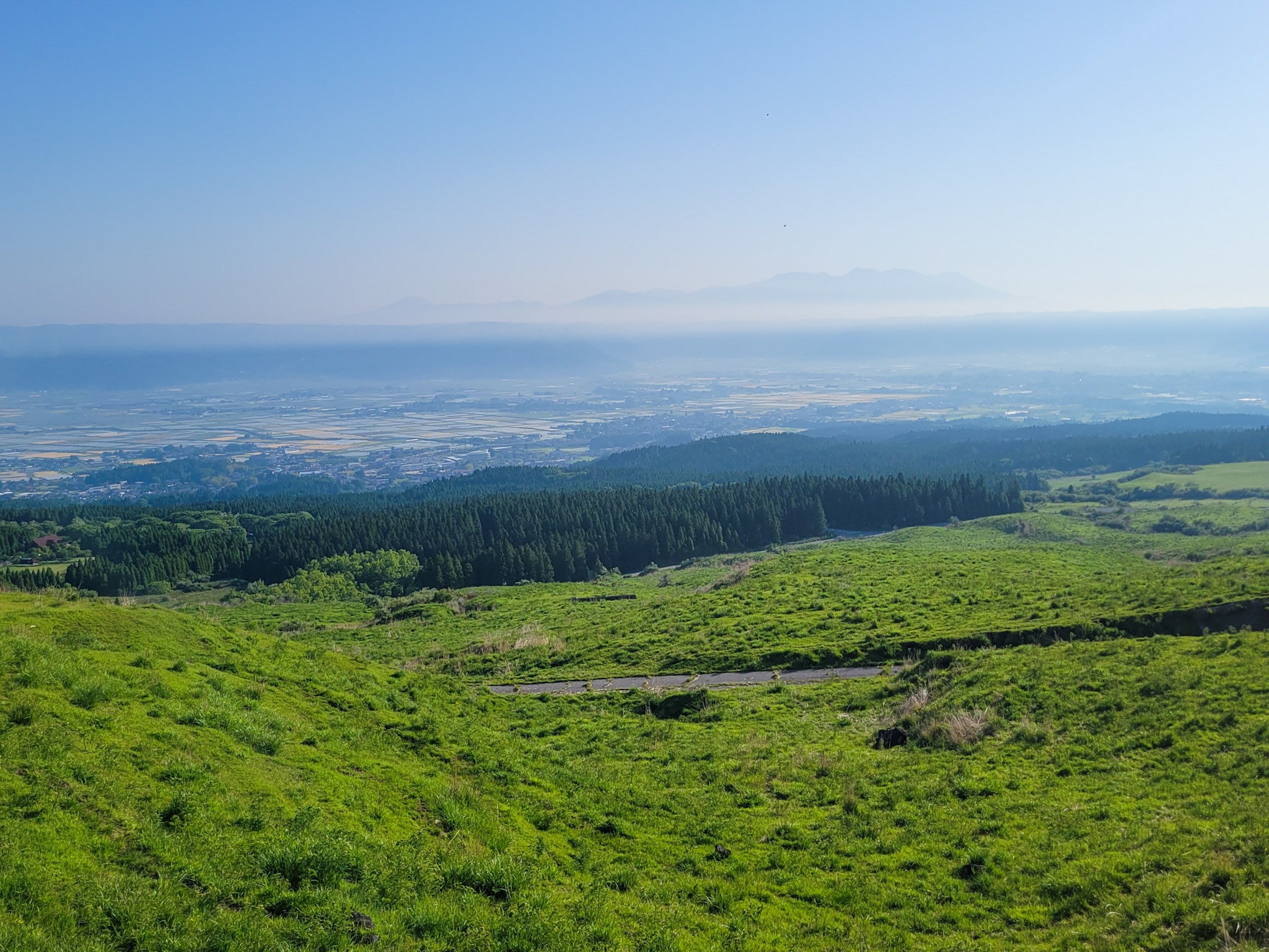 阿蘇カルデラを見下ろしながら、その奥に薄っすらとくじゅう連山が見えます。