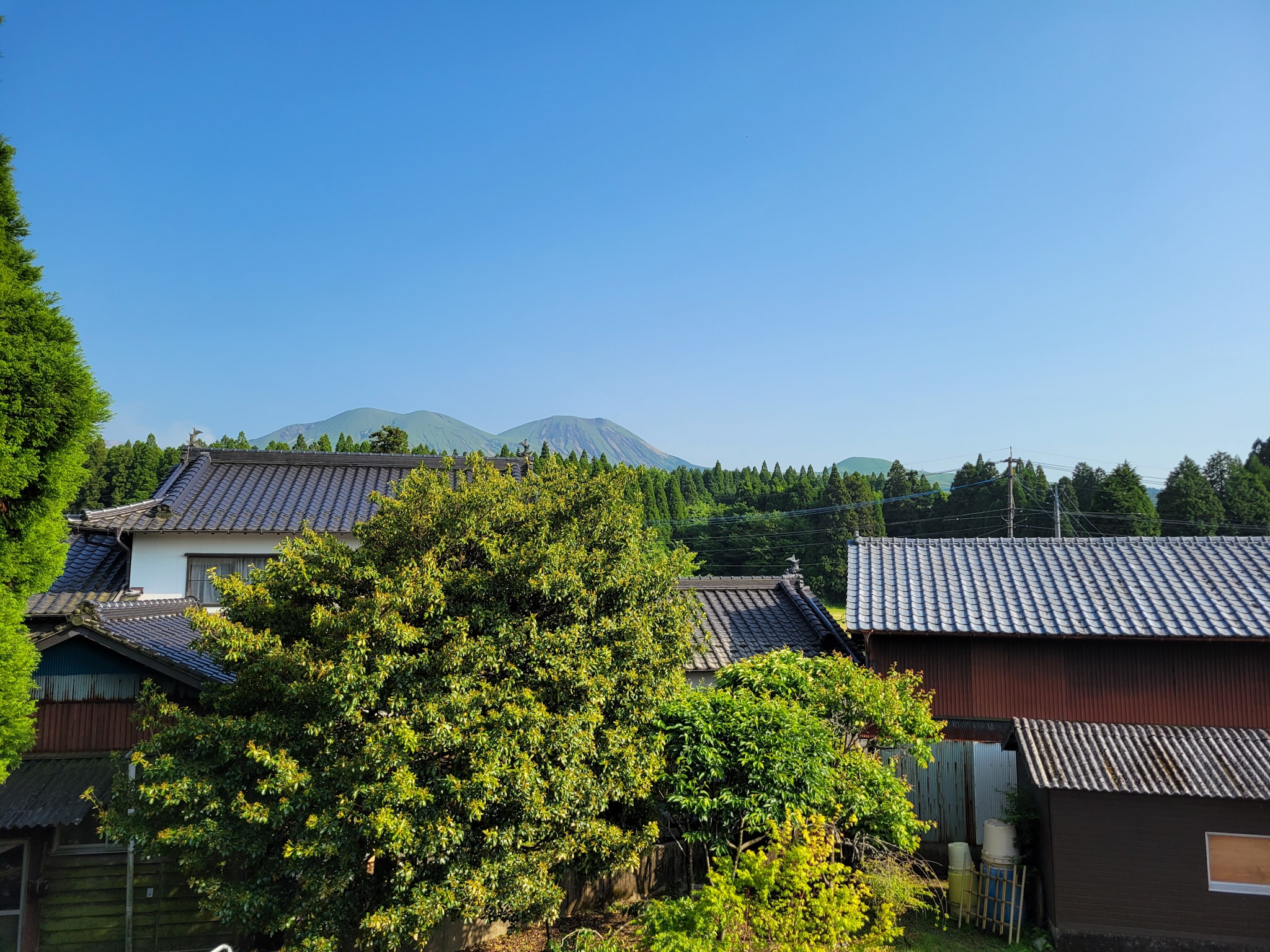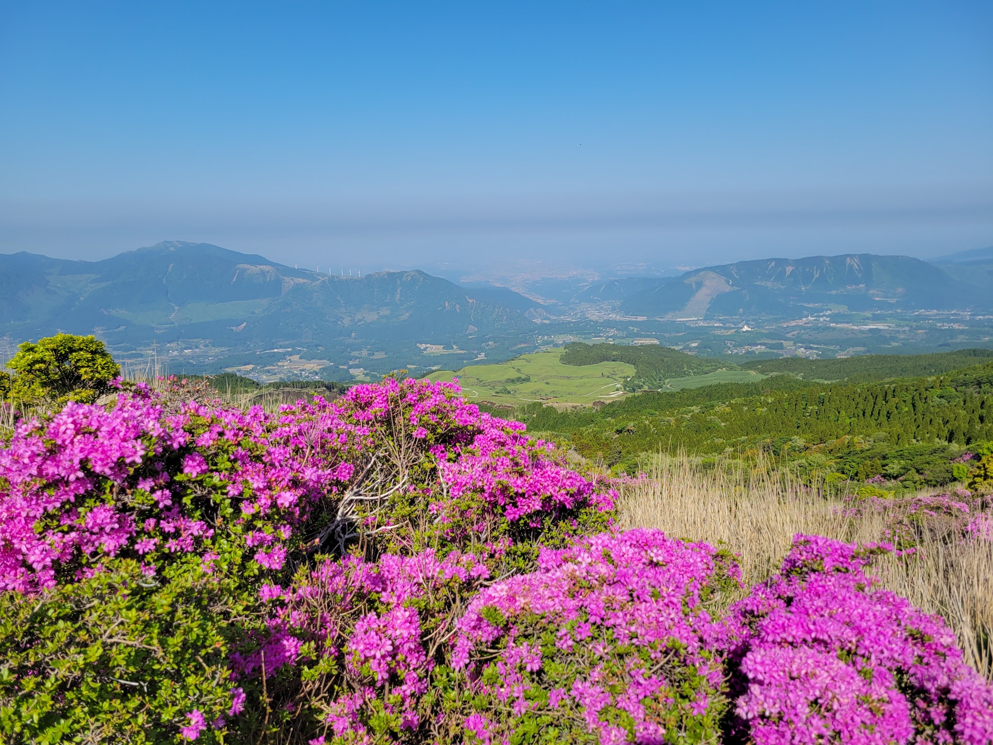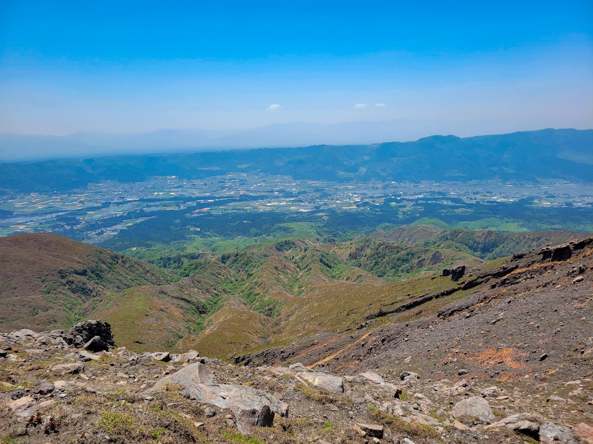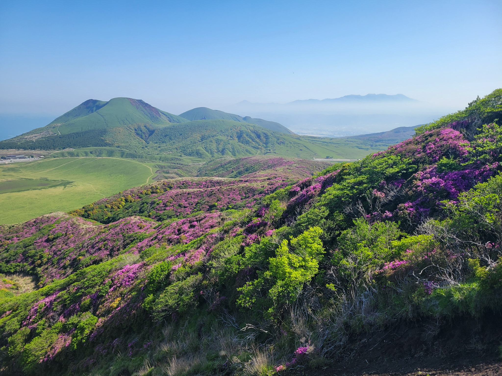 阿蘇カルデラを見下ろしながら、その奥に薄っすらとくじゅう連山が見えます。