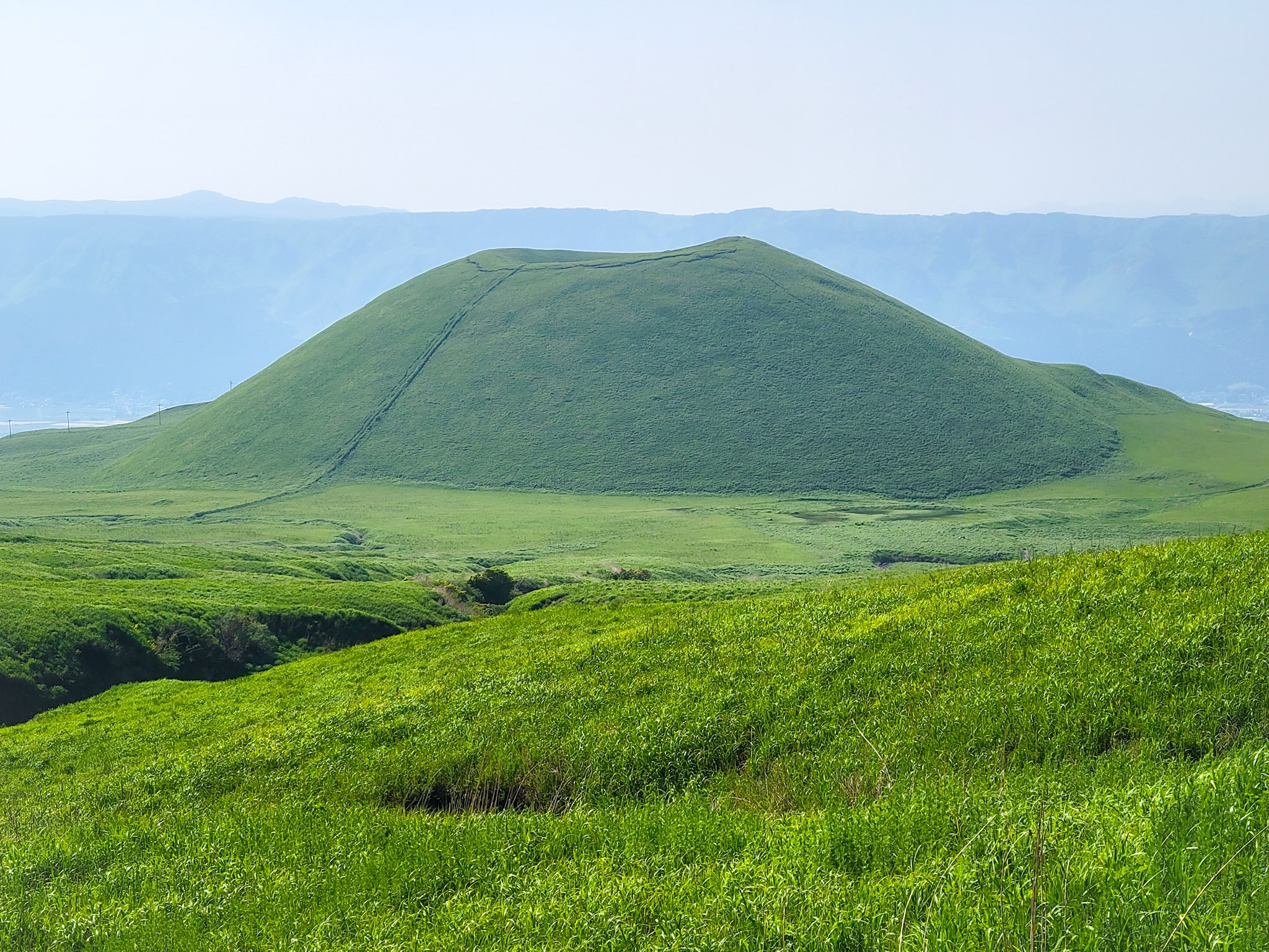 阿蘇の南斜面に特徴的な円錐形の山は米塚。