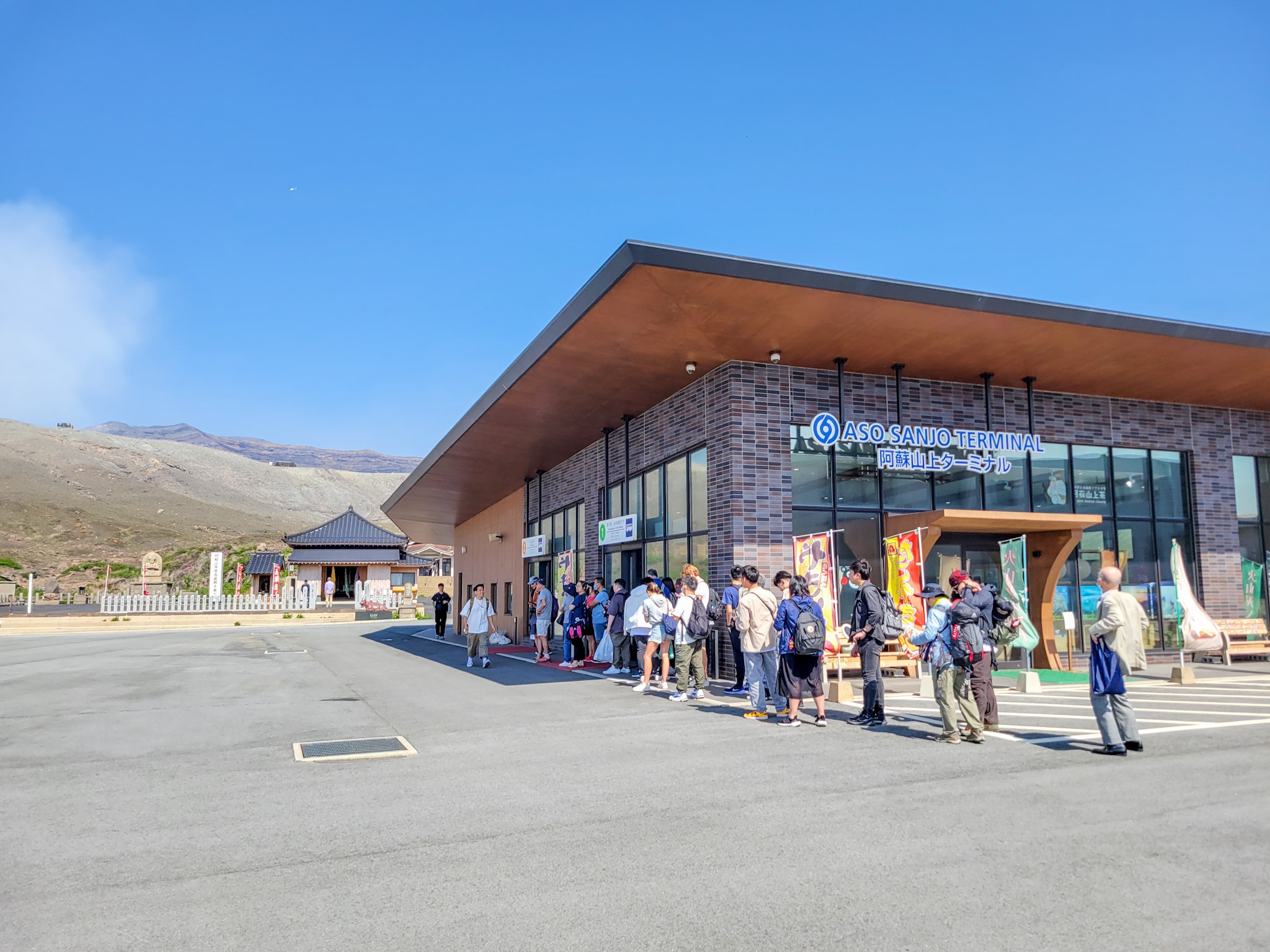 阿蘇カルデラの宮地行きのバス待ちの行列。