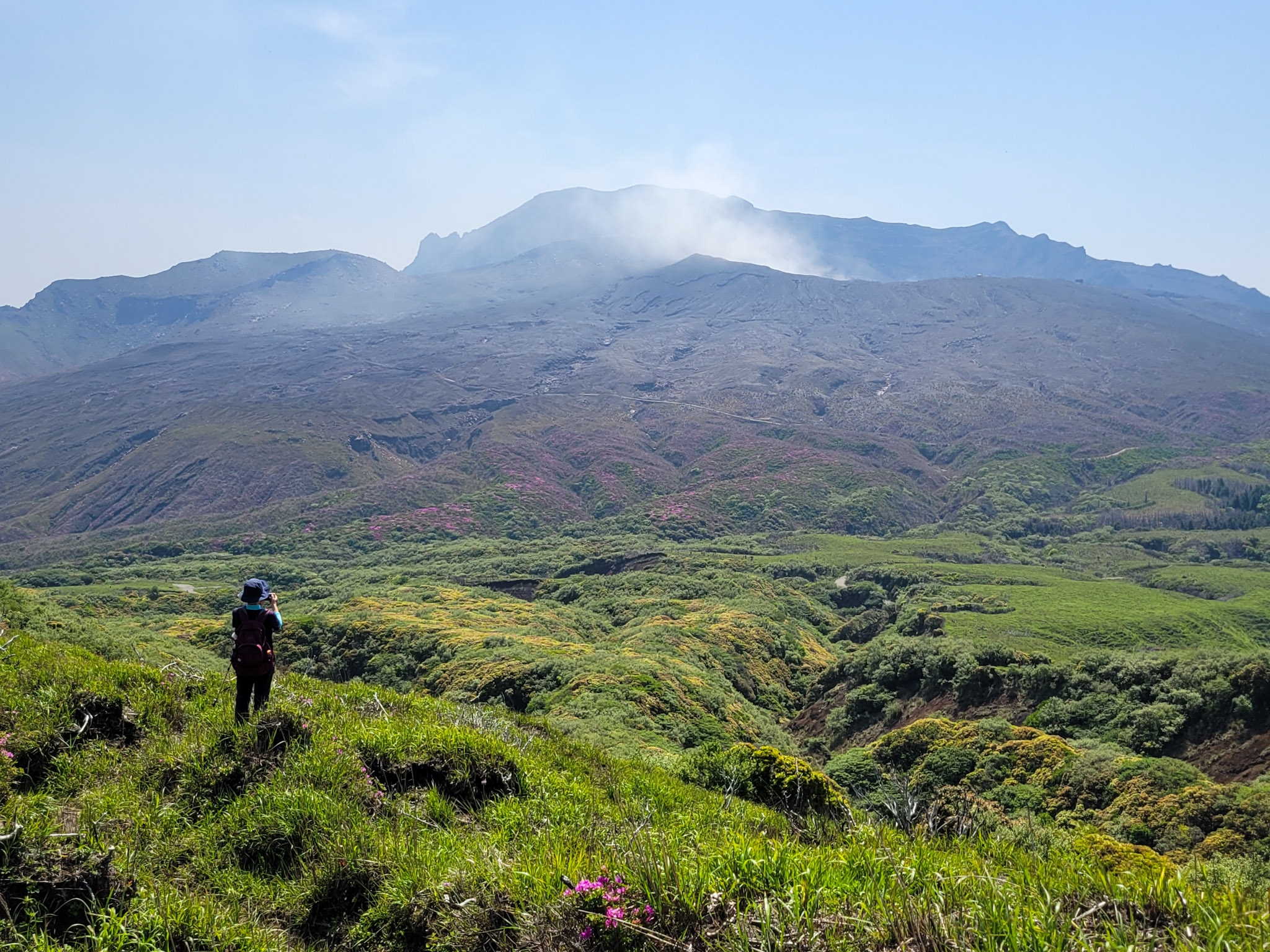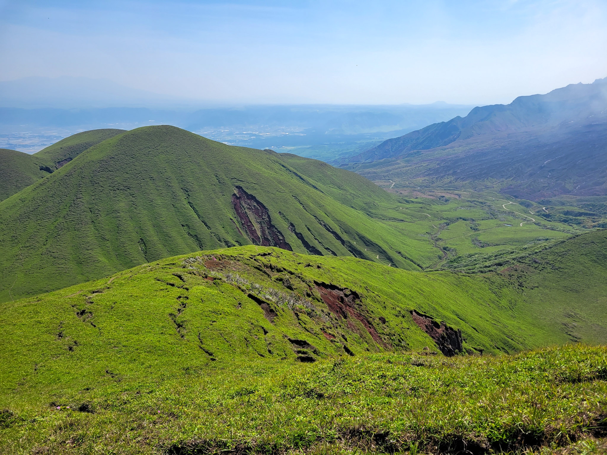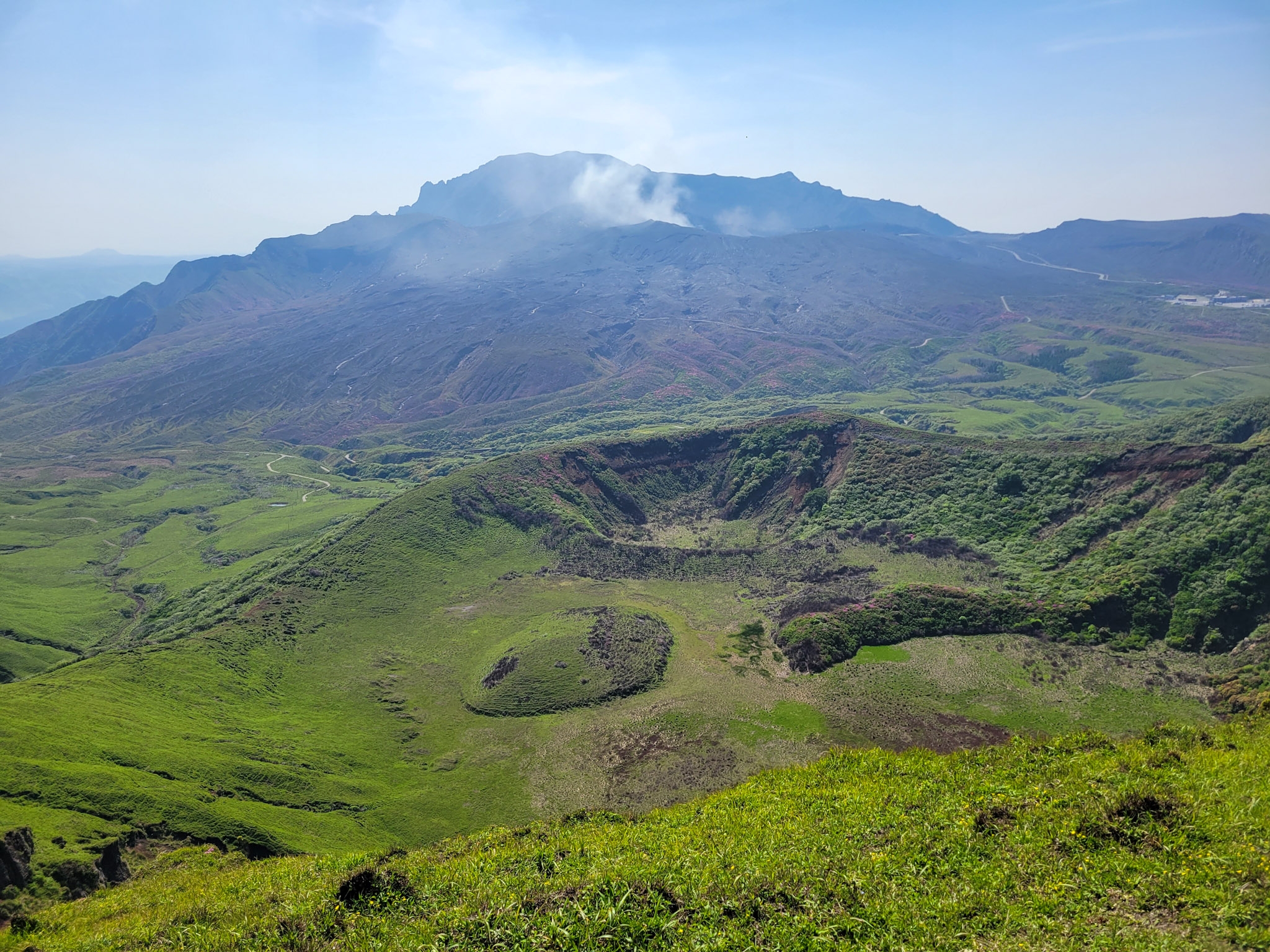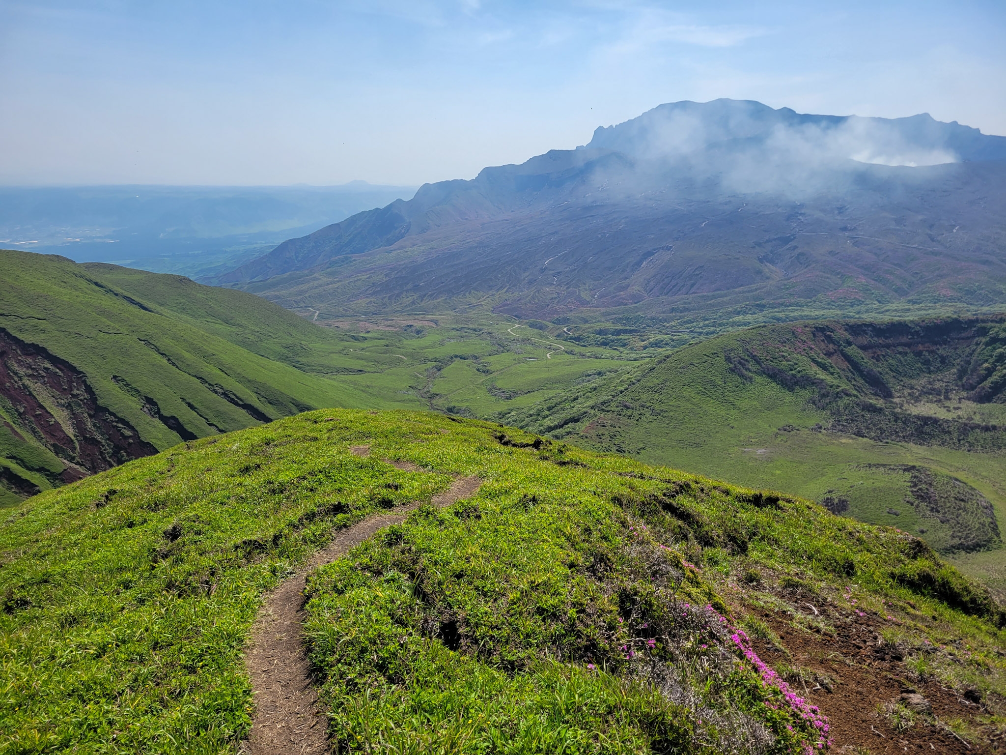 山頂付近に来ると南側のカルデラ、高森方面の眺望がひらけます。