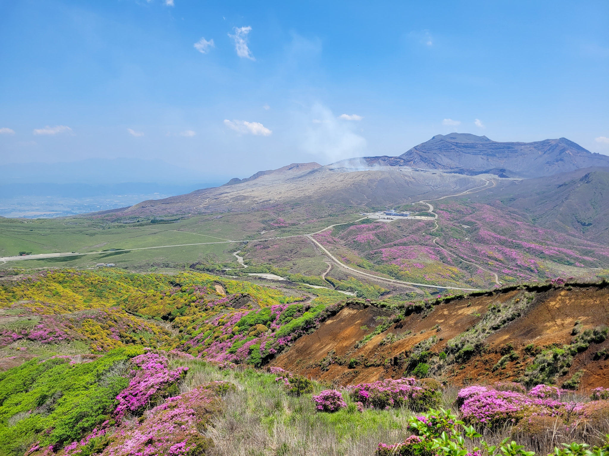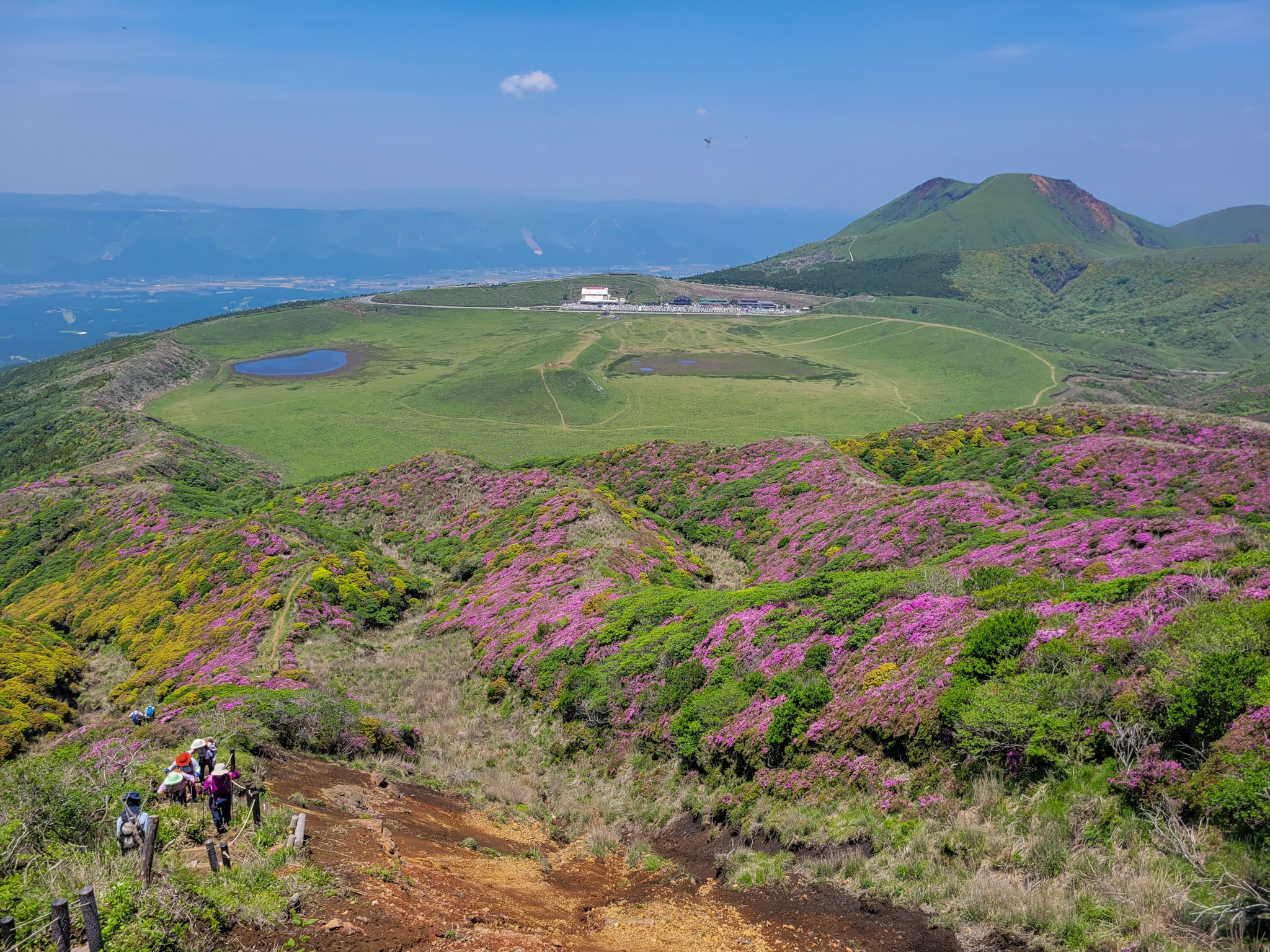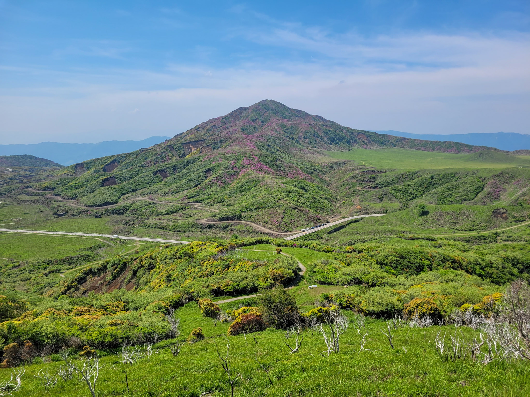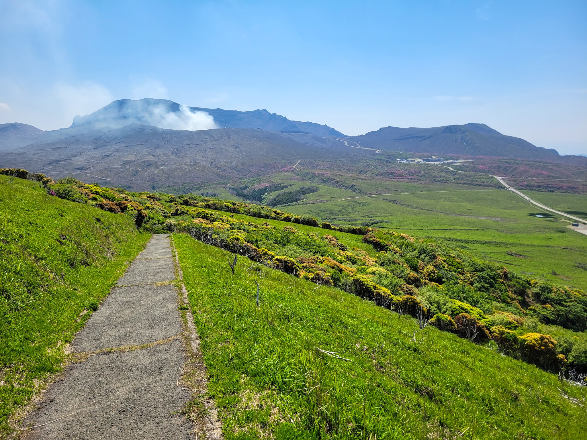 山頂付近に来ると南側のカルデラ、高森方面の眺望がひらけます。