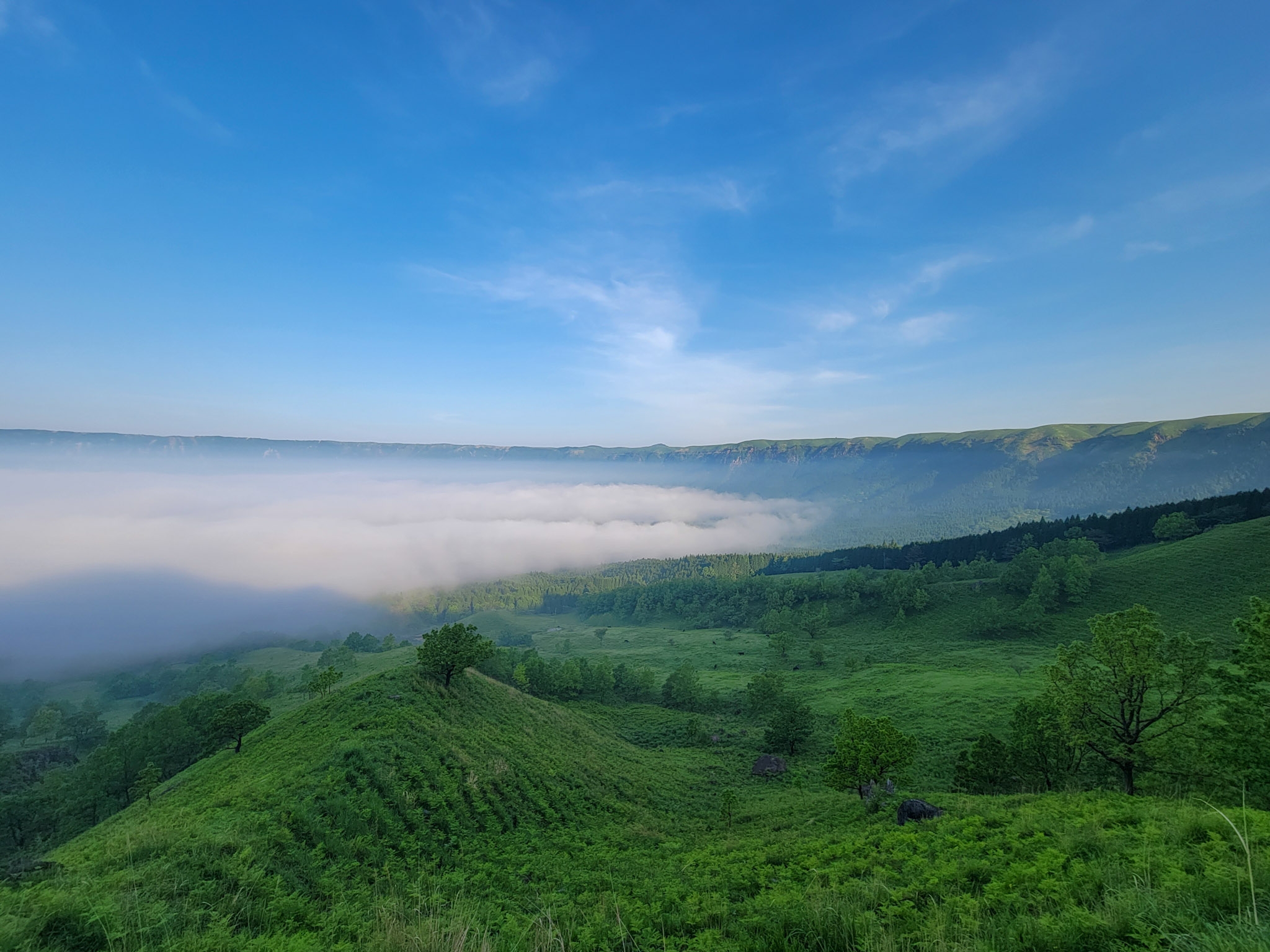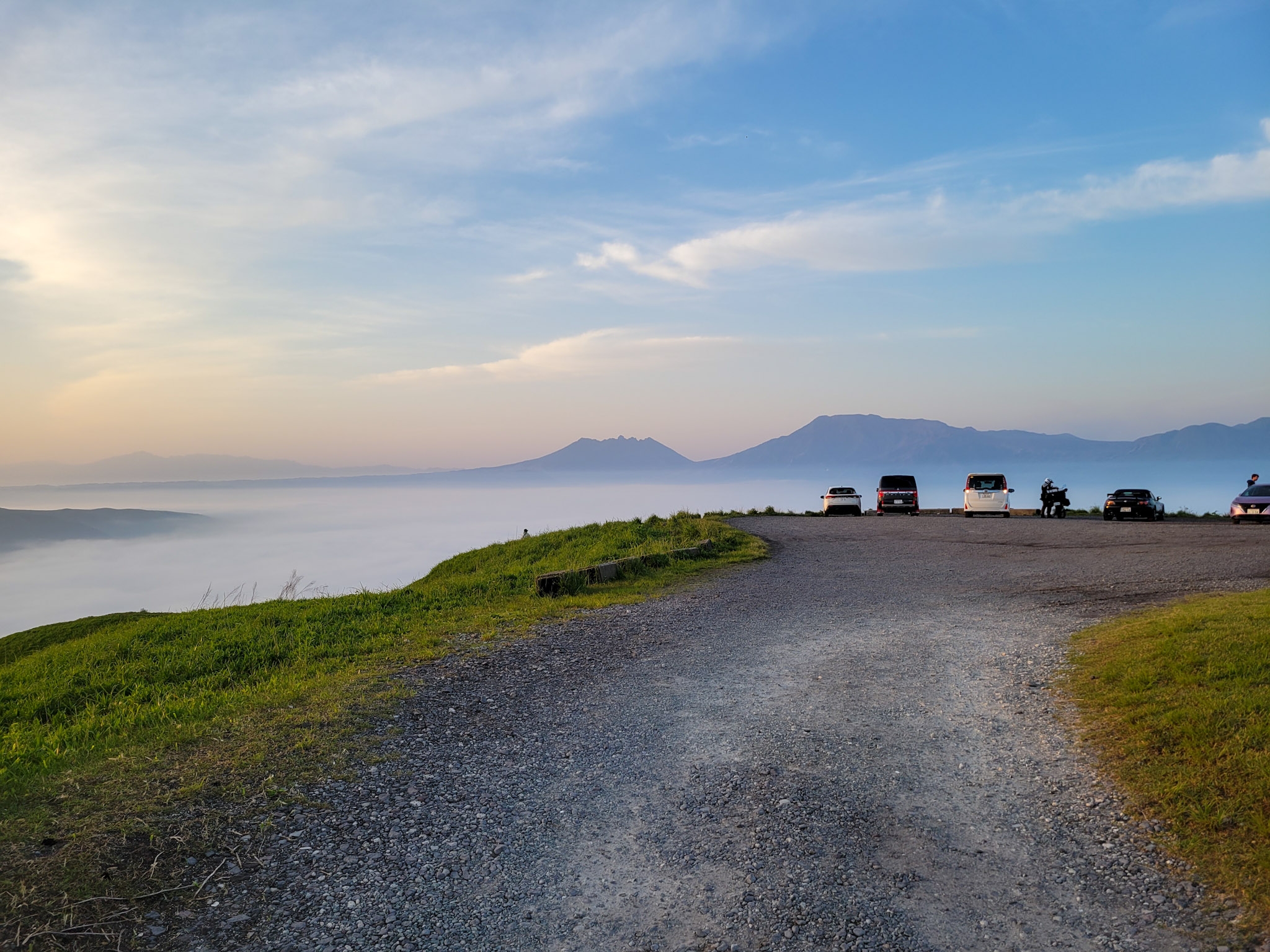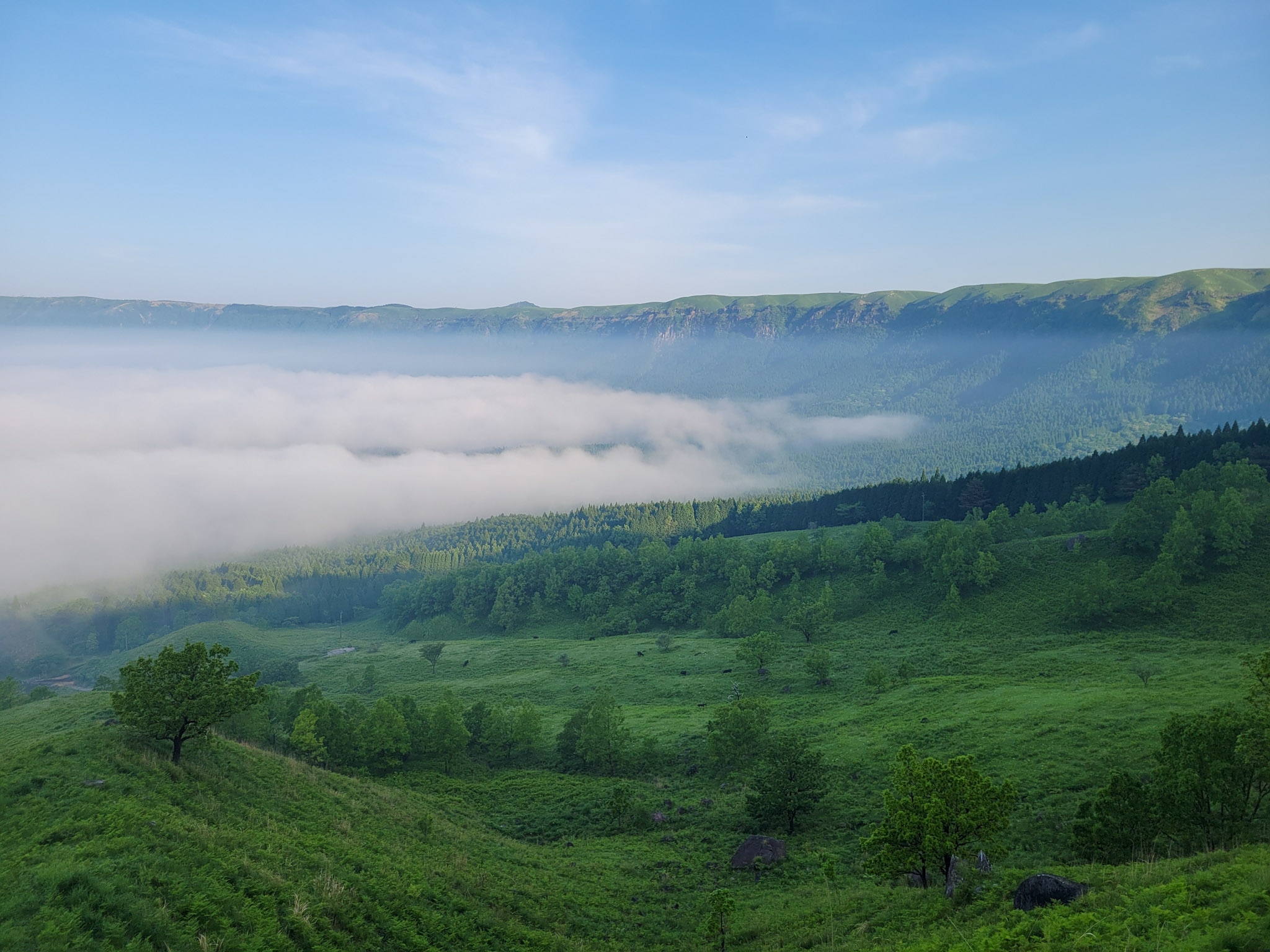 坂道を登ってきて、大観峰付近にくると霧から抜けて、快晴。