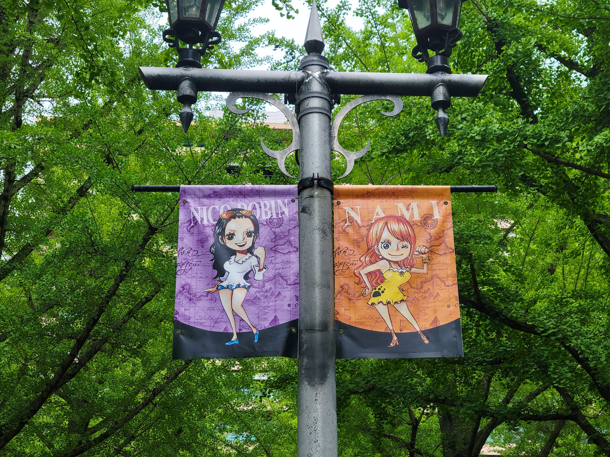 通りから玄関へと続くプロムナードにワンピースのフラッグ。