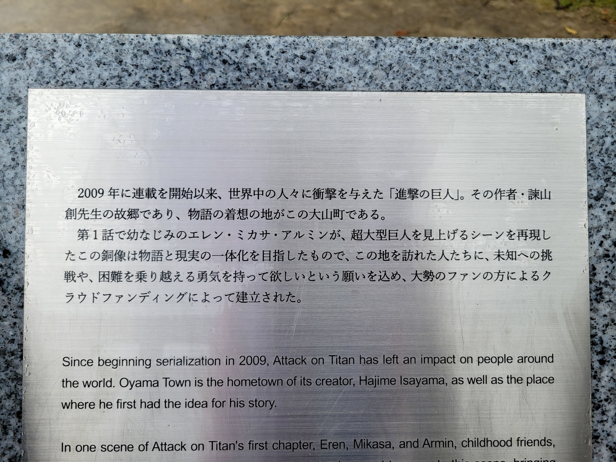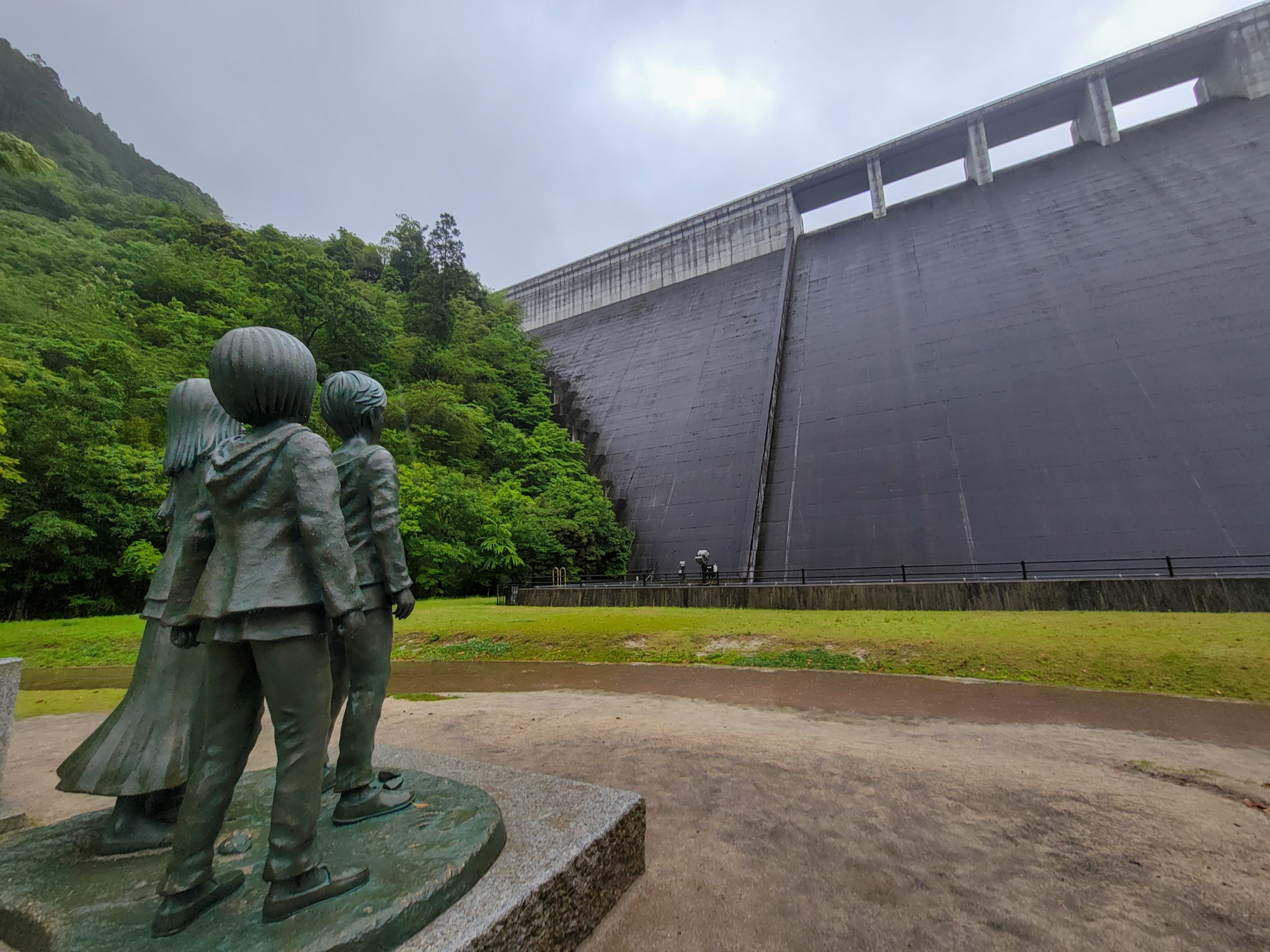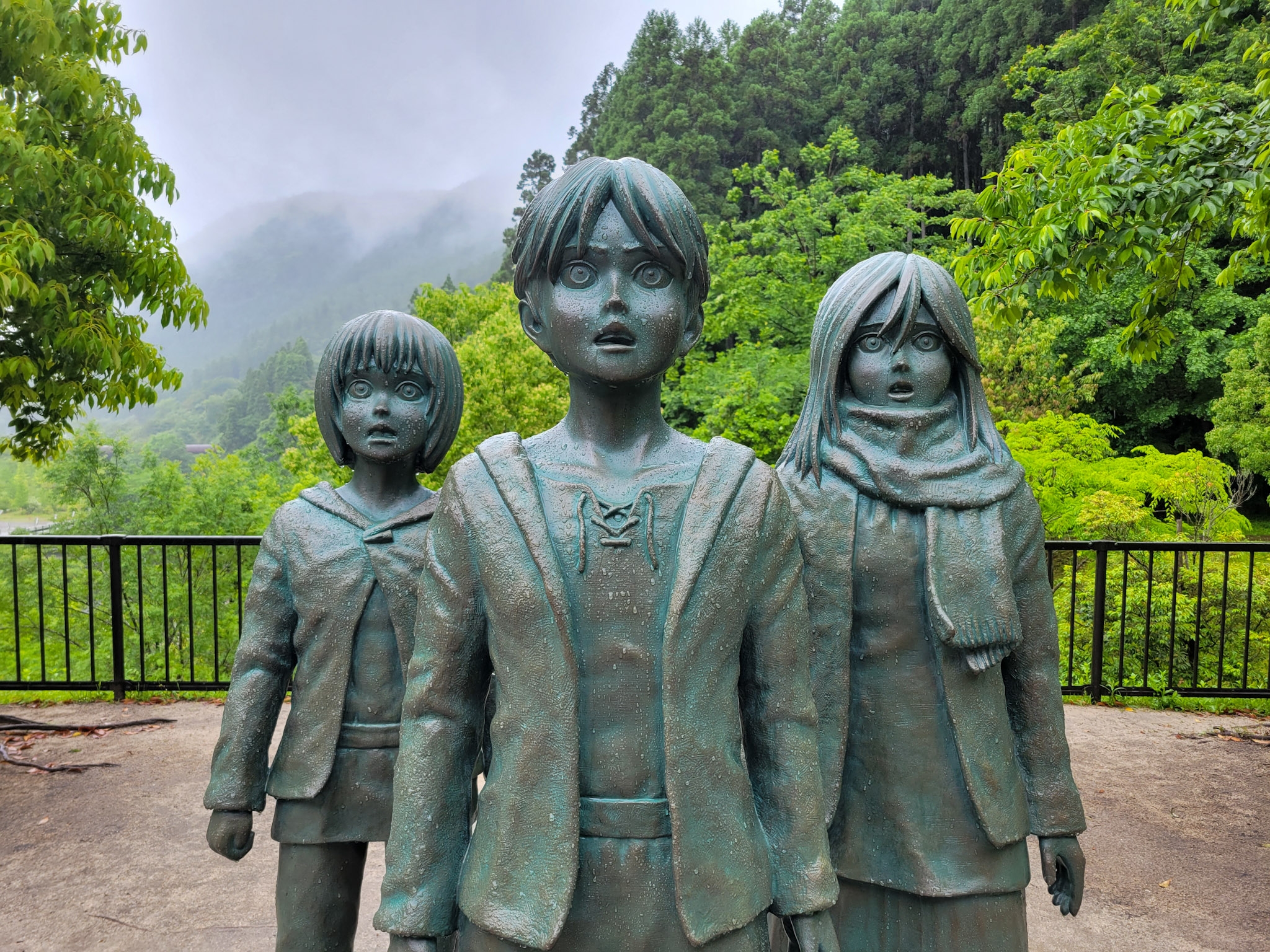 作者の諌山創さんはこの大山ダムのある日田市大山町出身。地元の有志がクラウドファンディングでこの銅像を立てたそうです。
