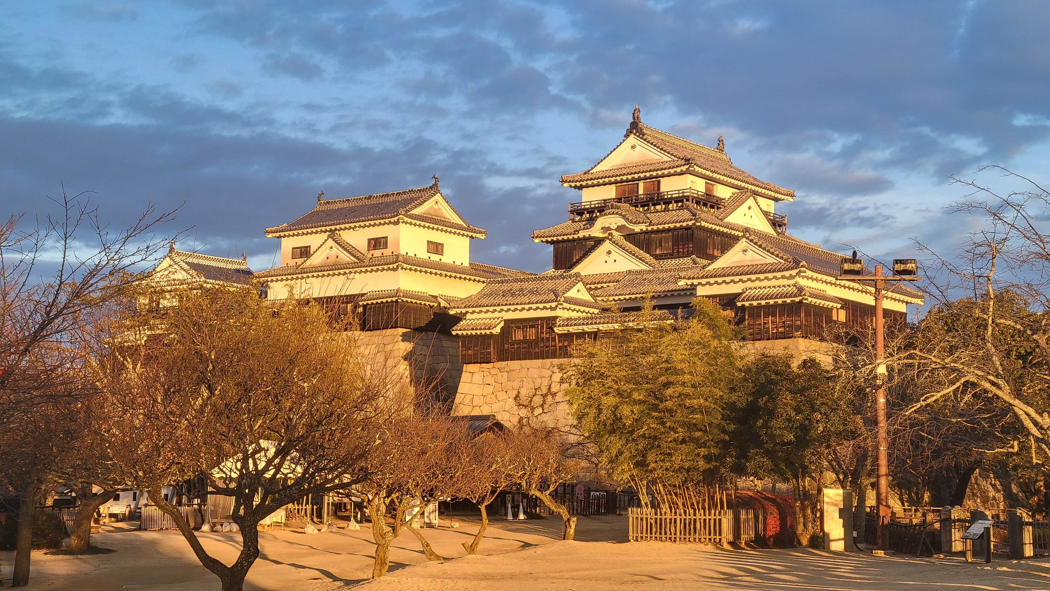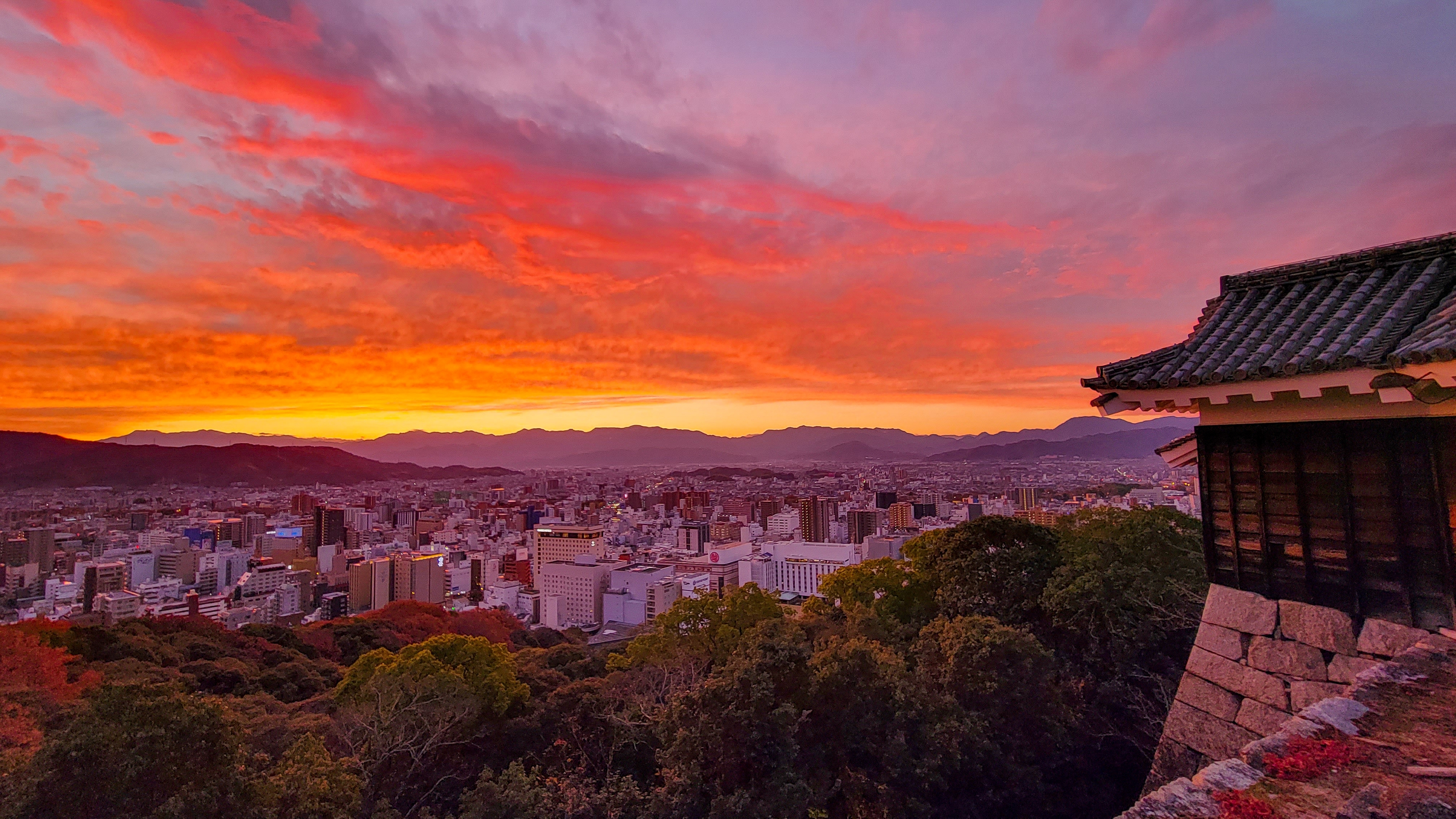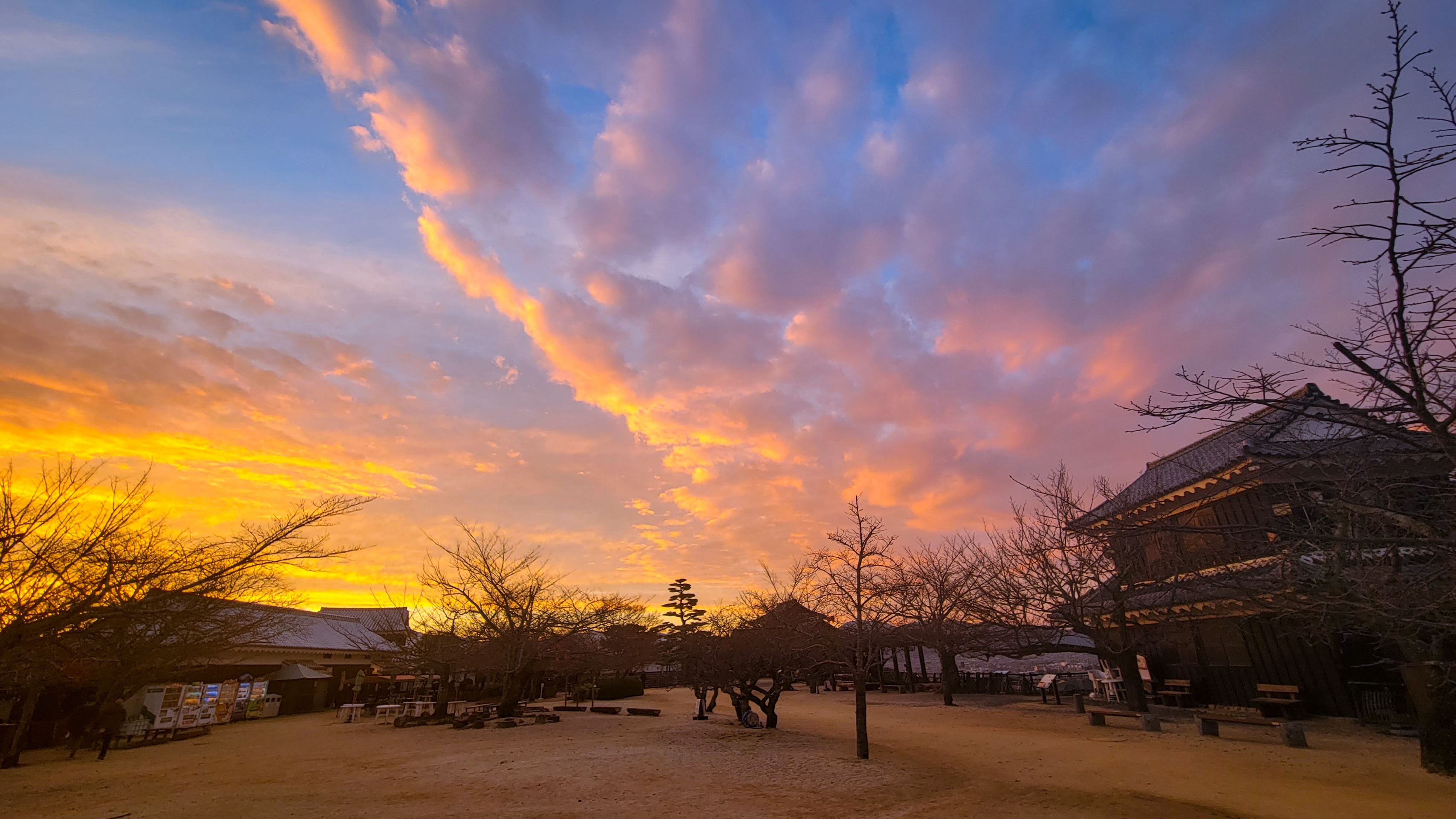 朝焼けの天守閣は綺麗かなと思ったけど、空に灰色の雲がかかっていたので、いまいちな感じでした。