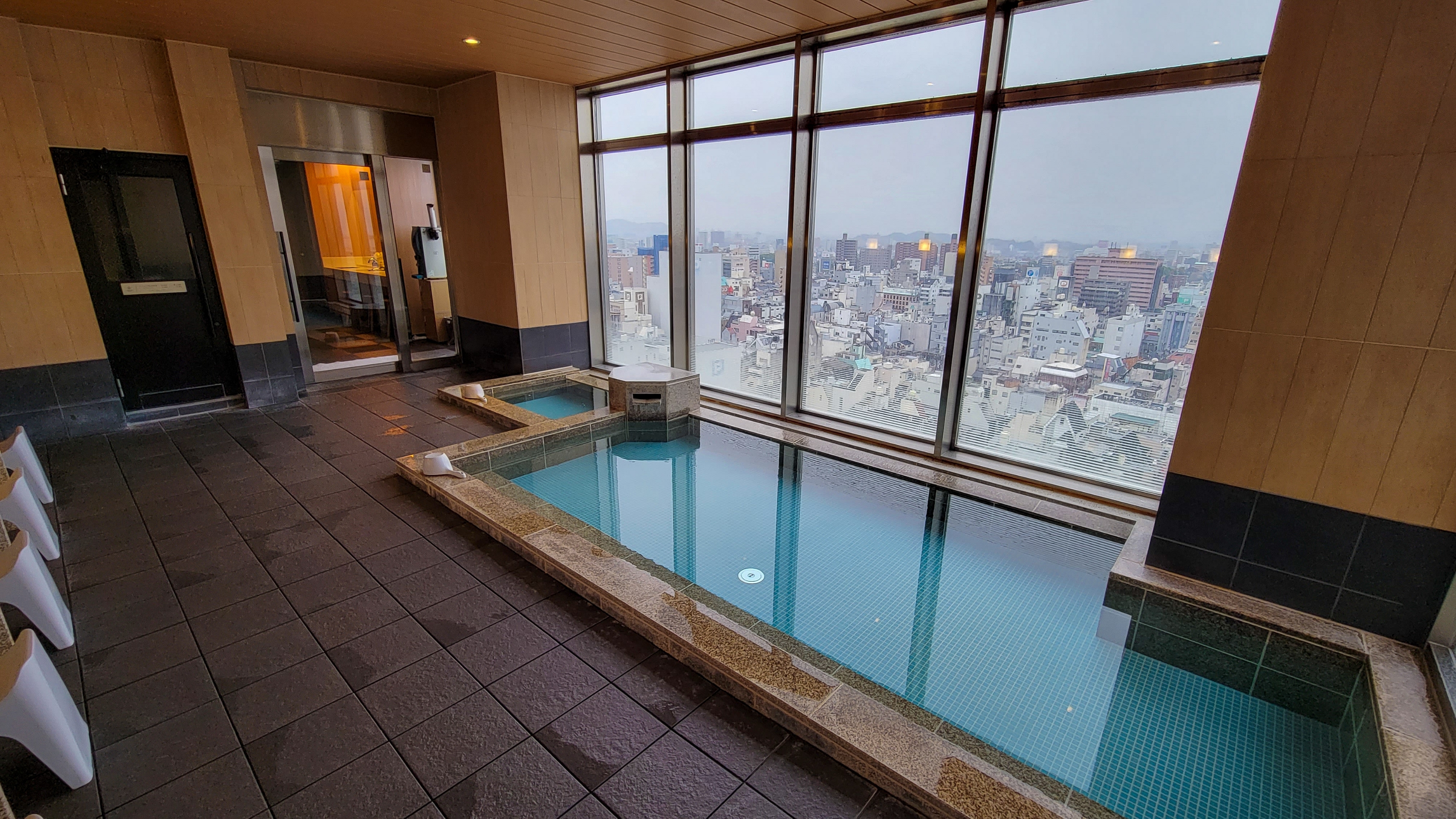 フロントと同じ最上階の13階にあります。男性が南側の繁華街エリア、女性が北側の松山城。