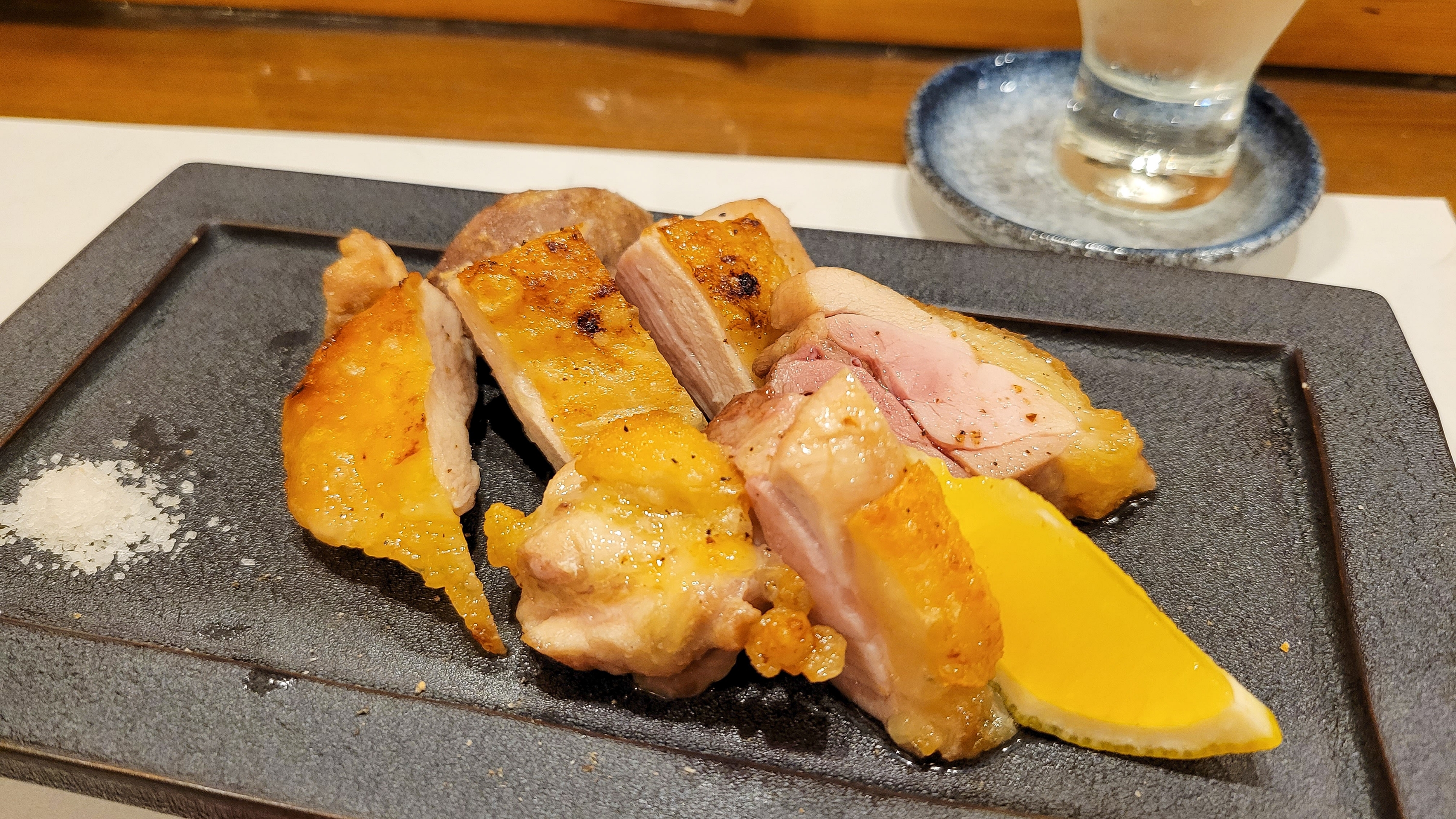 結構時間かけて焼いてくれてたみたいですが、半端ない旨味の塊みたいな肉でしたね。皮がパリッと破れ、噛むほどに肉汁と旨味が口のなかに溢れていく。程よい歯ごたえ。そこに大好きな石鎚グリーンを注ぎ込む。