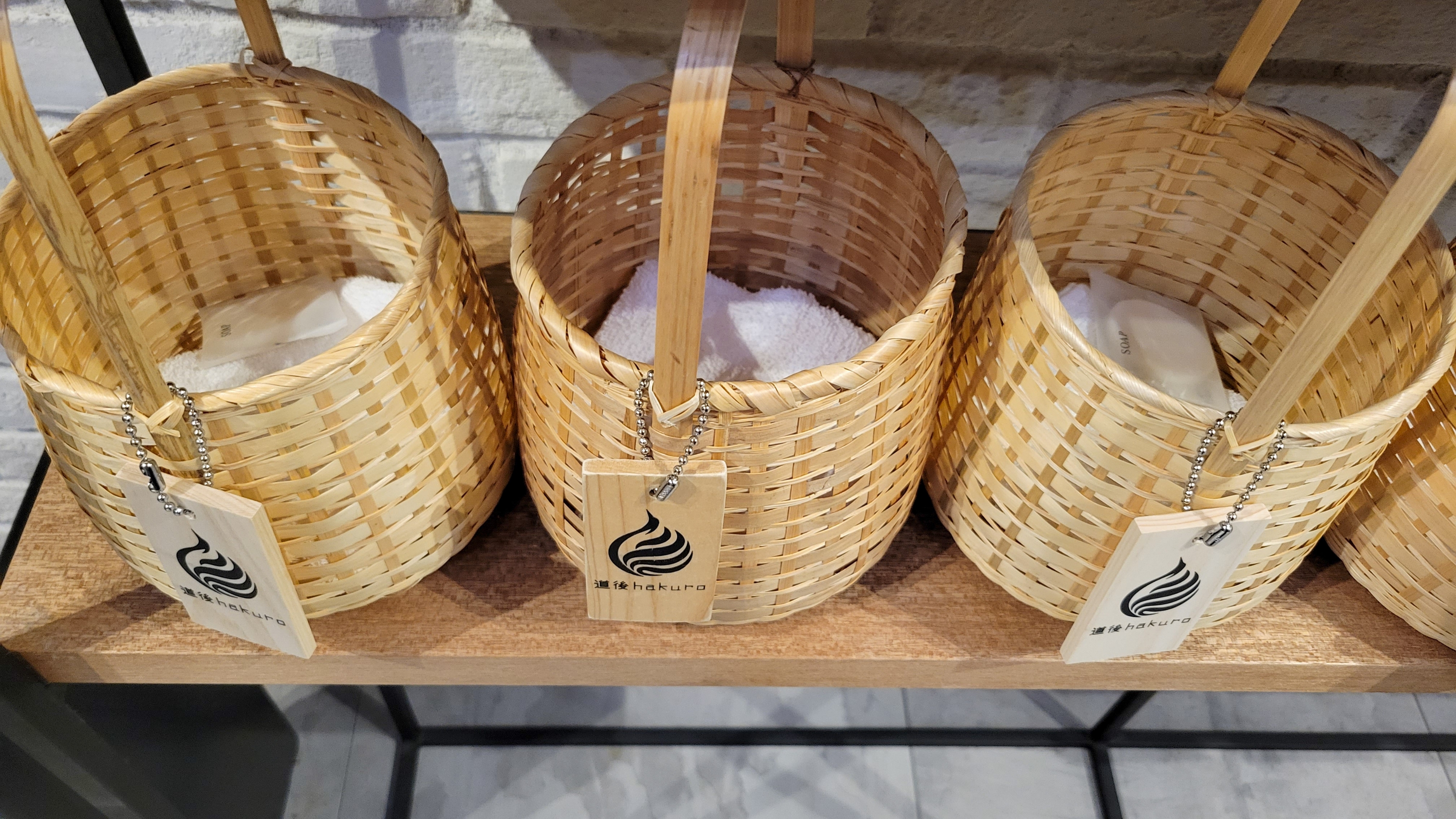 外湯めぐり用に小さいタオルが入った貸し出し籠がおいてあります。