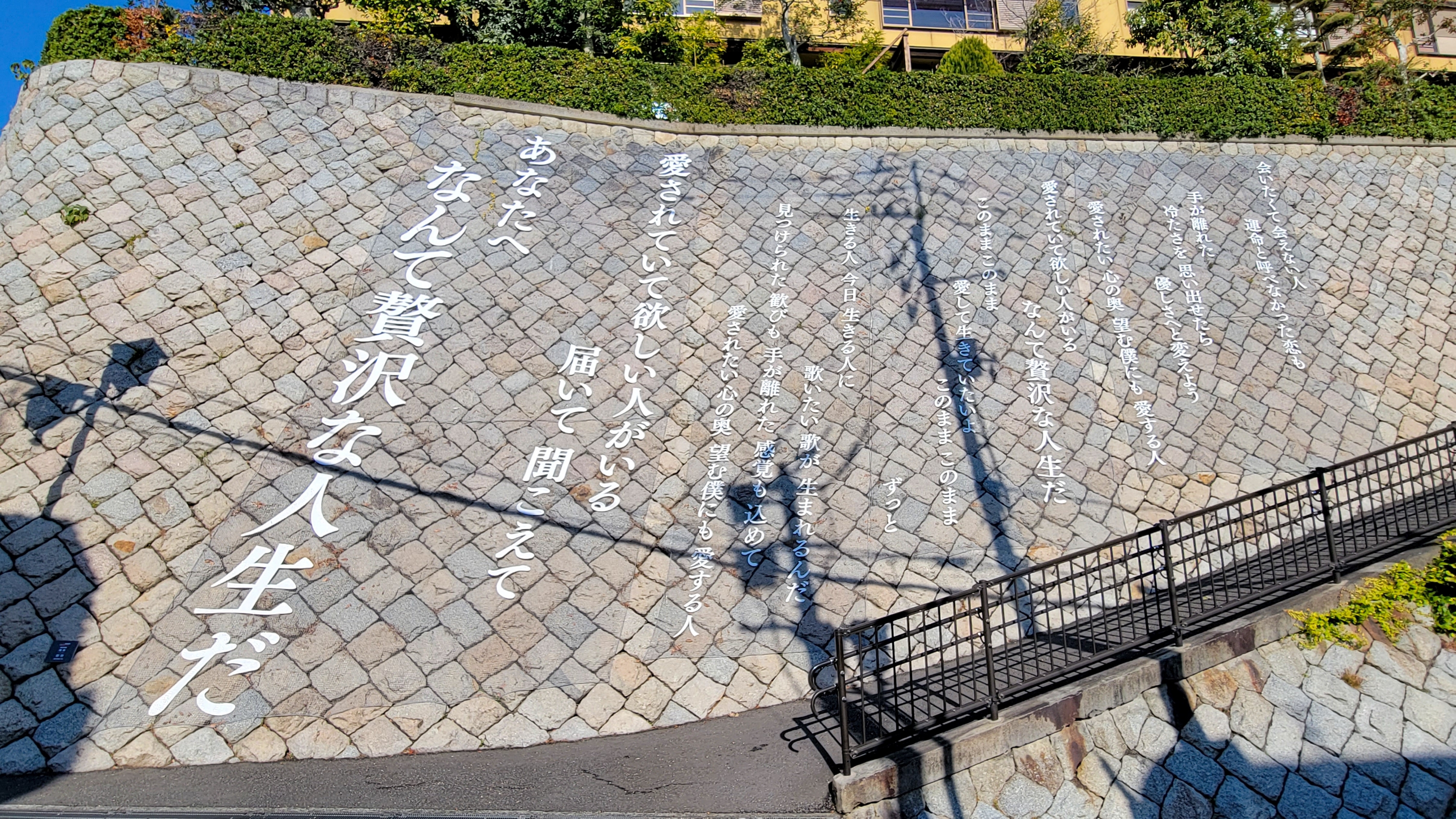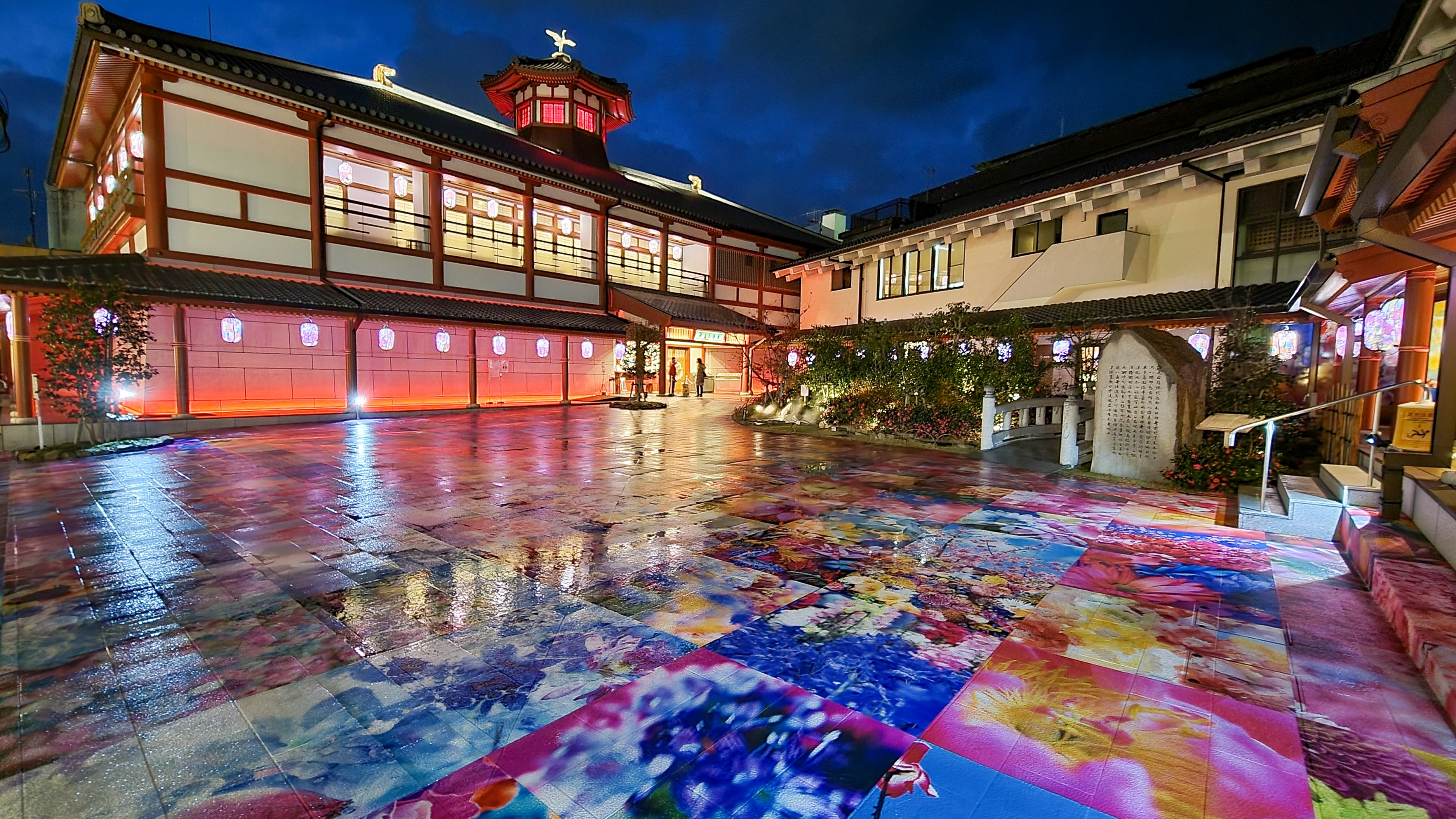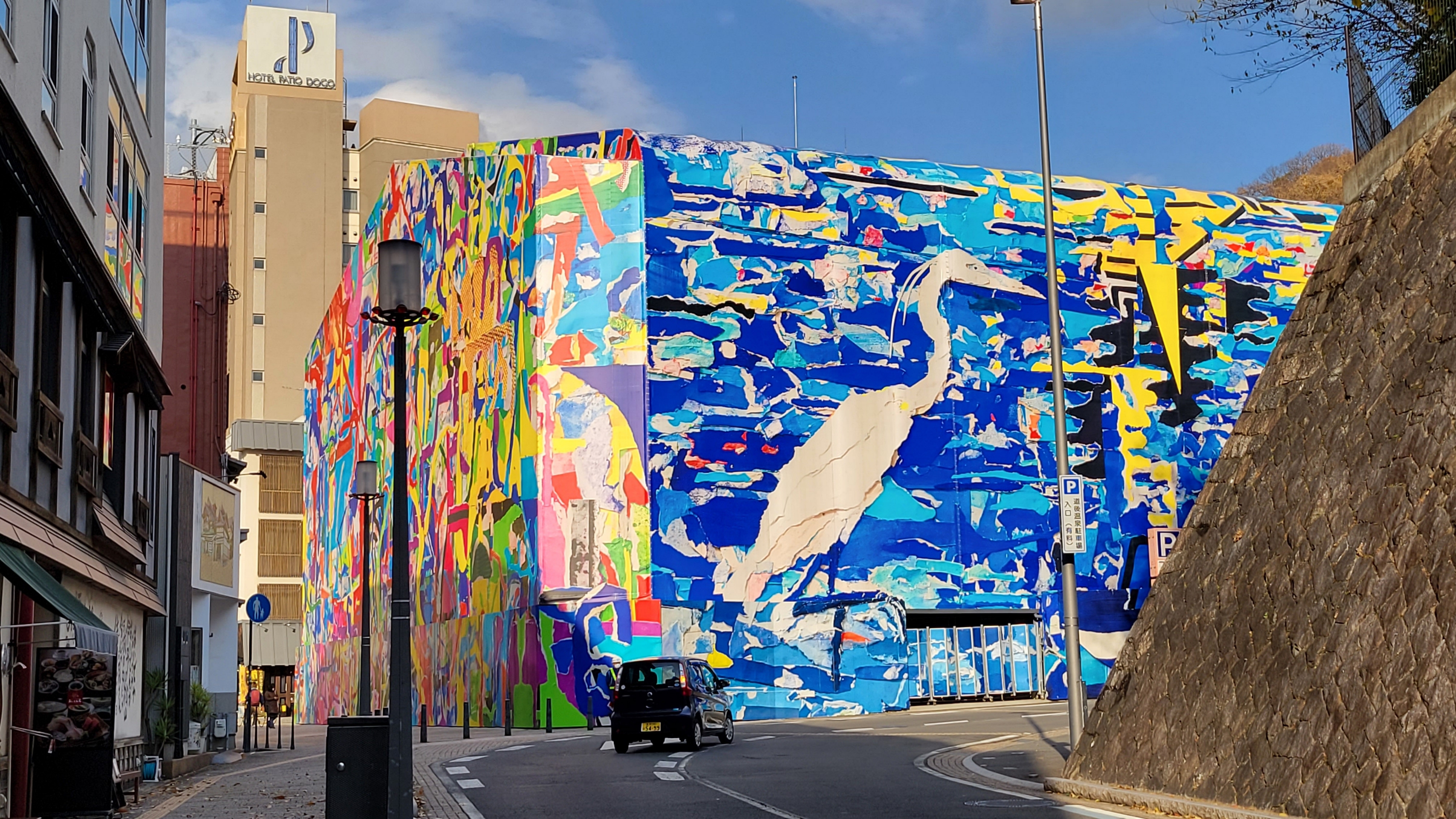 道後温泉は山あいの斜面にあるので、坂道が多いけど、それを利用してのオンセナートの作品。