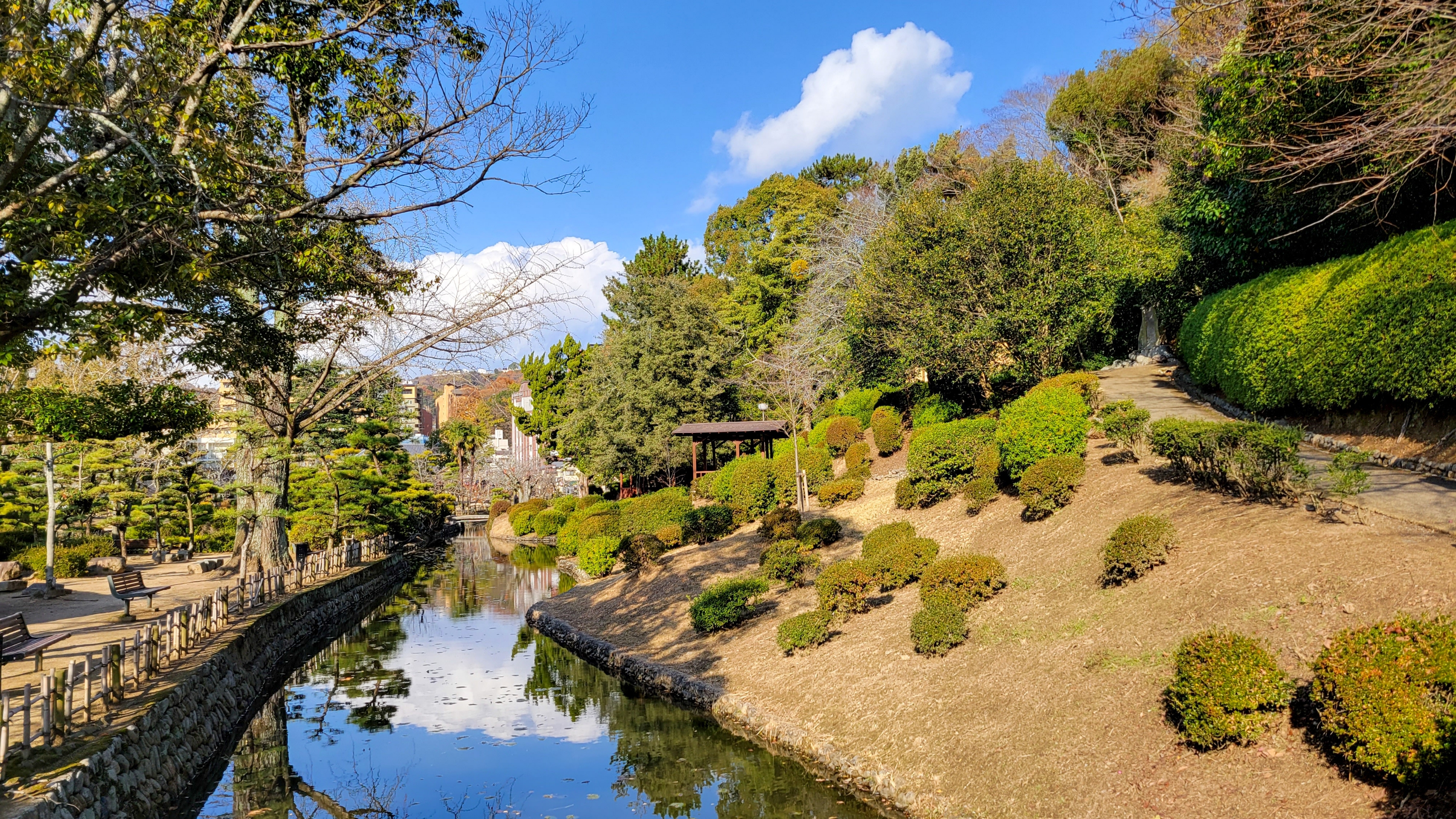 二重の堀に守られていて、写真は内堀。右の坂をあがっていくと高台に展望台が設置されている。