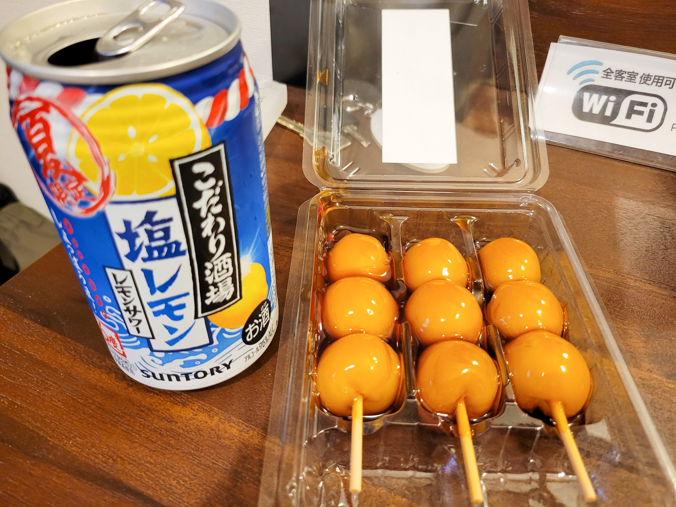 早めのステーキの昼食でお腹が満たされてたので、近くのイオンで買ったみたらし団子とレモンサワーで〆です。