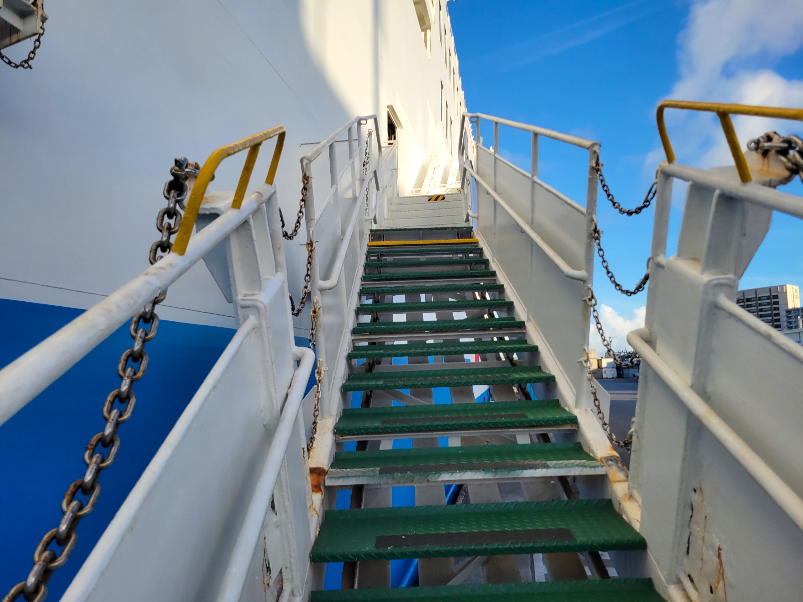 船外に備え付けられた吊り下げ階段を上って乗船です。