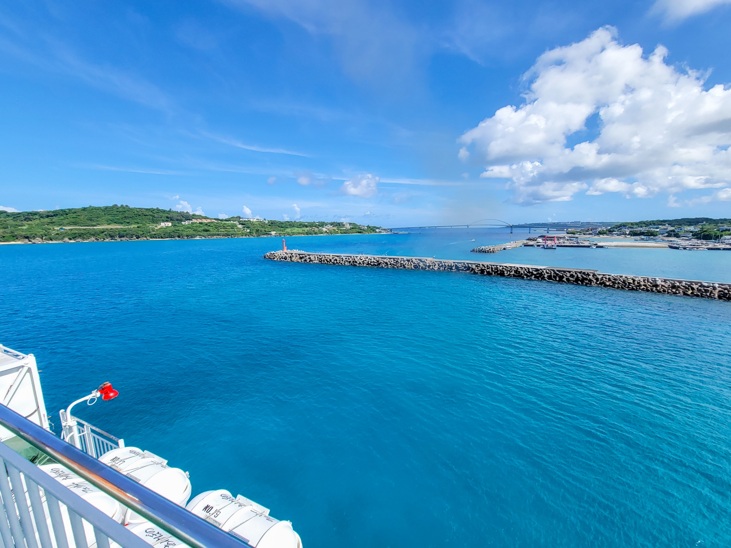 フェリーはくぐれないようなので、瀬底島を迂回していきます。