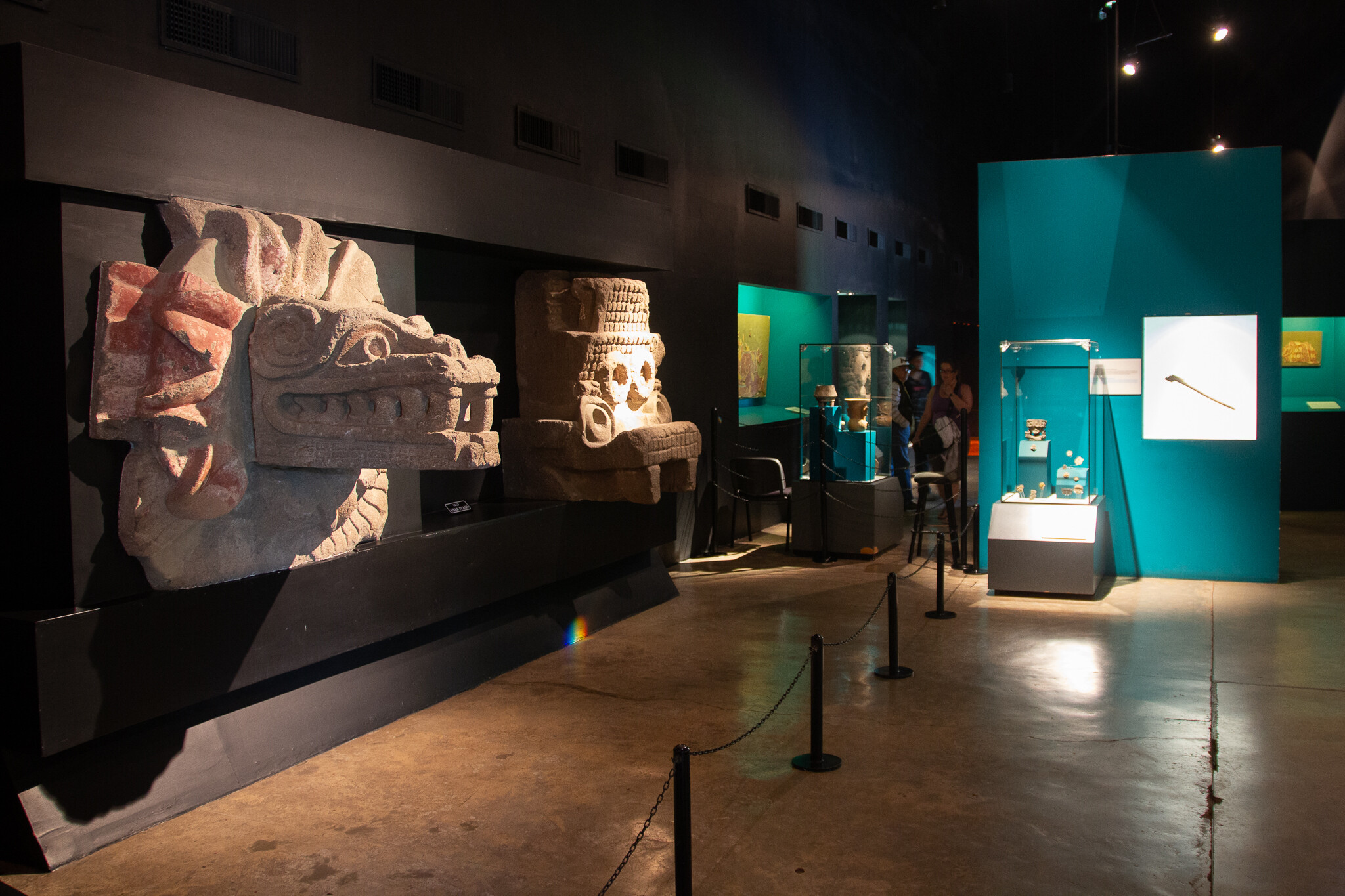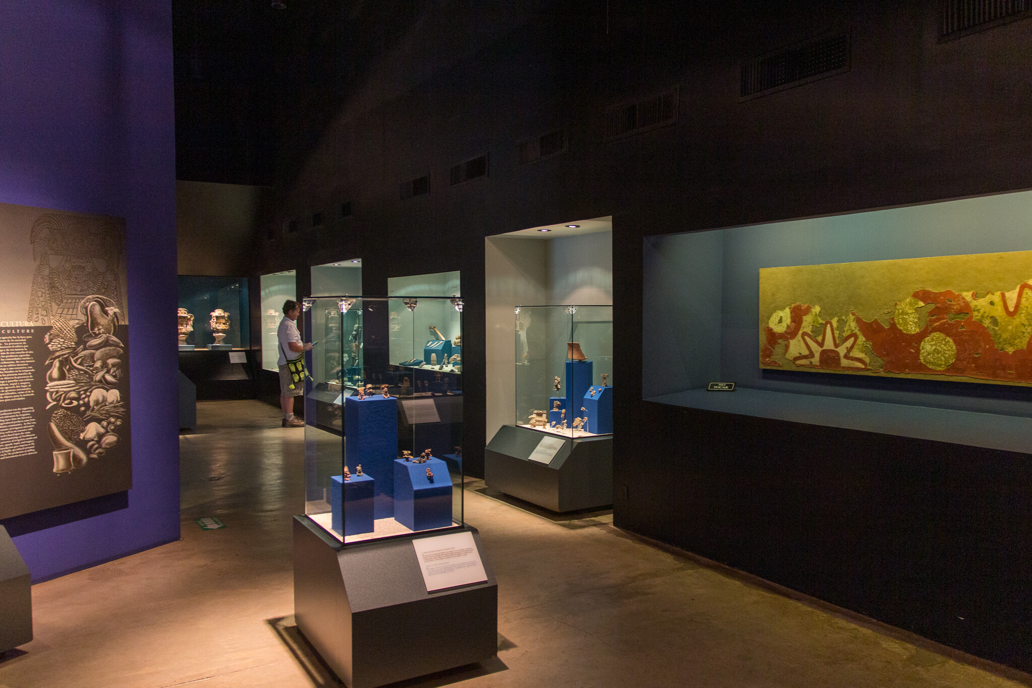 遺跡の模型の奥のガラス越しに見える太陽のピラミッド。