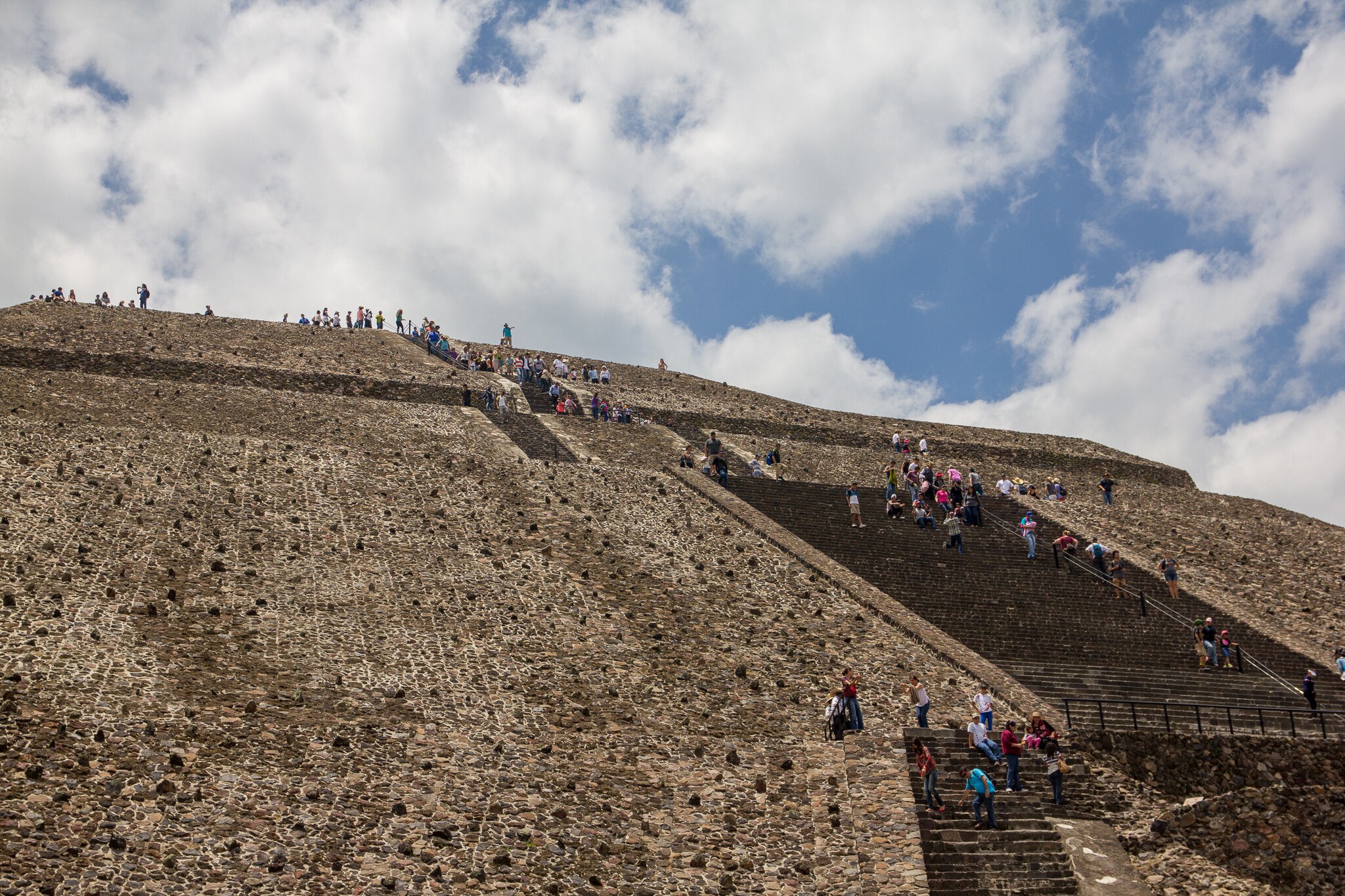 ケツァルコアトル神殿を拝むためにはまず手前のピラミッドを登る。