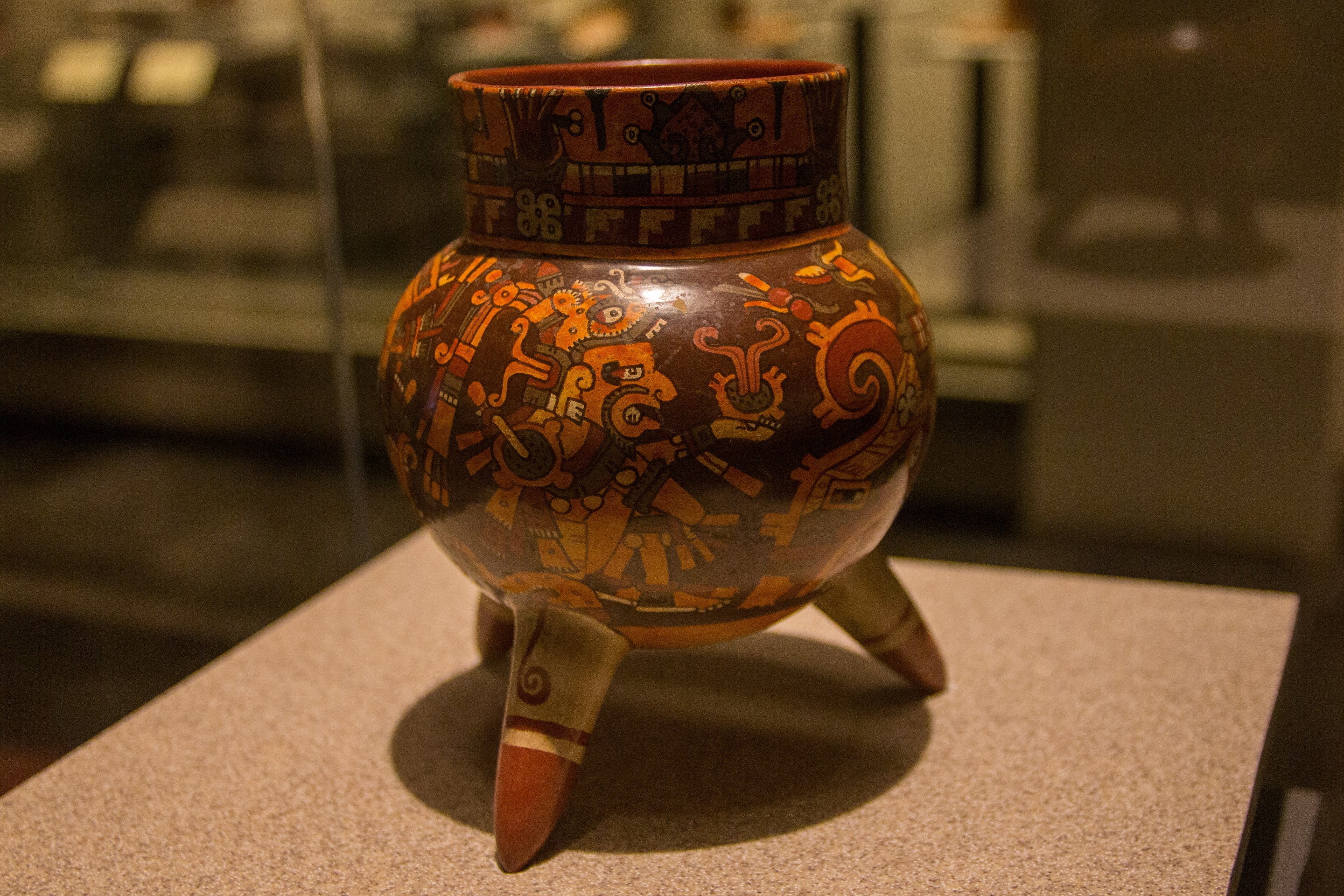 ミシュテカ文明の芸術は特に素晴らしく、陶芸や金細工は高い技術と美しさで知られています。彼らの陶器には、彩色された三脚壺や細密な彫刻が見られ、豊かな色彩や神話的なシーンが描かれています。