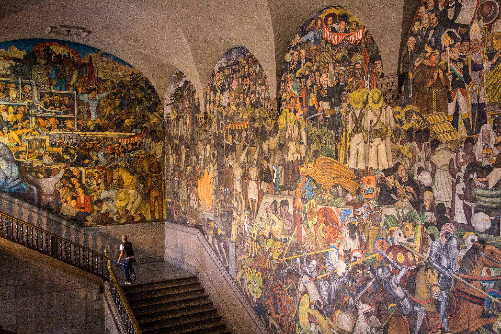 壁画には、アステカ帝国の滅亡、スペインの征服、メキシコの独立、革命時代の指導者たちなど、メキシコの歴史の重要な出来事や人物が豊富に描かれています。また、リベラの壁画は、彼の独自の芸術的スタイルと政治的メッセージが見事に融合されており、メキシコの文化的アイデンティティや社会的問題に対する彼の見解を反映しています。