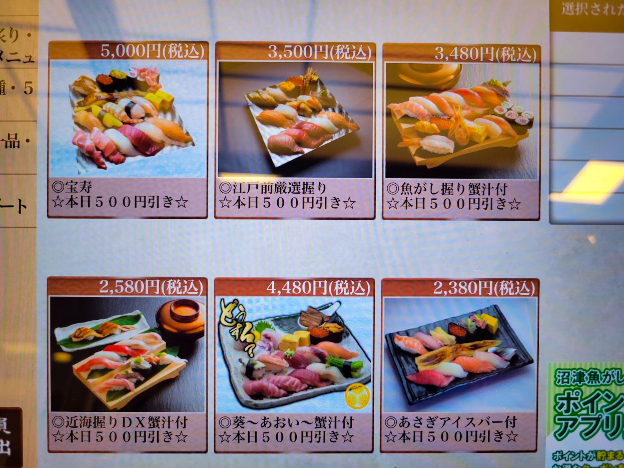 曜日によってサービスが変わるそうですが、今日、火曜日は高級握り寿司が500円割引になる日です。表示されている価格は値引き後の価格です。ポイントが2500円分あるので、奮発して…