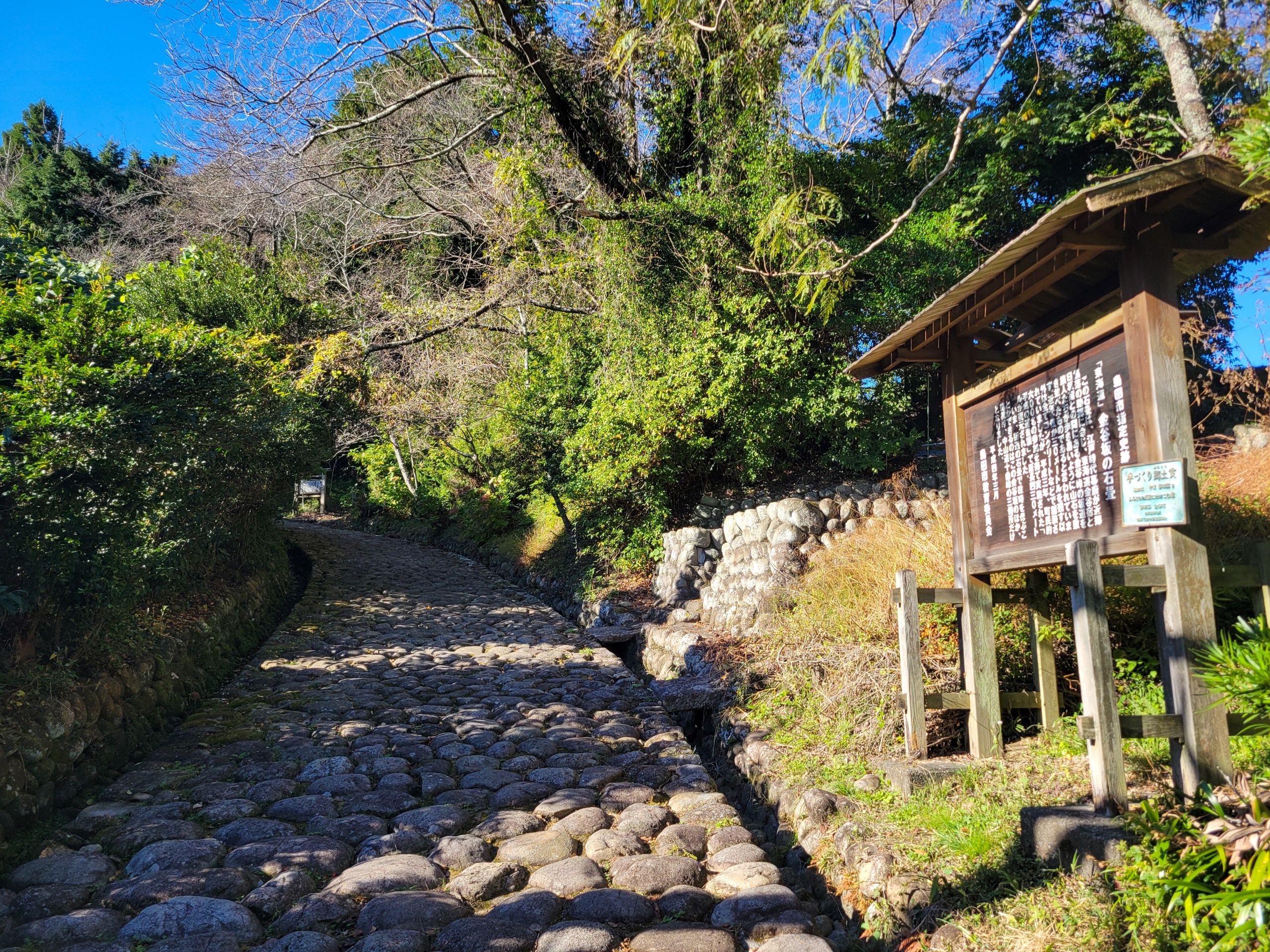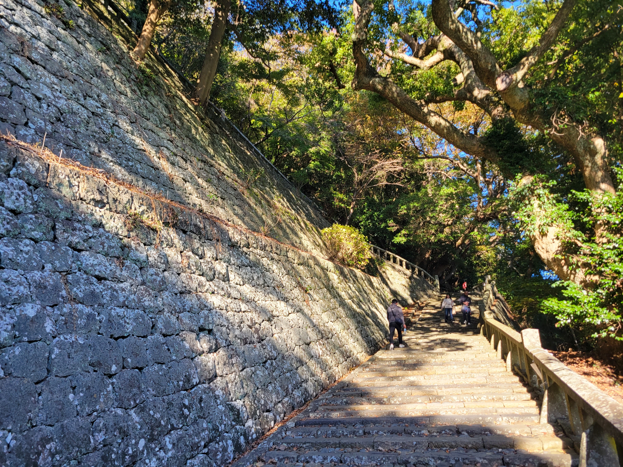 歴史を感じる参道。江戸時代からこの参道を使っていたわけですから、しっかり整備されているはずですね。立派で大きな石垣が目に止まります。九十九折に登っていきますが、緩やかな階段なのでそれほど疲れませんが、思ったより暑い…