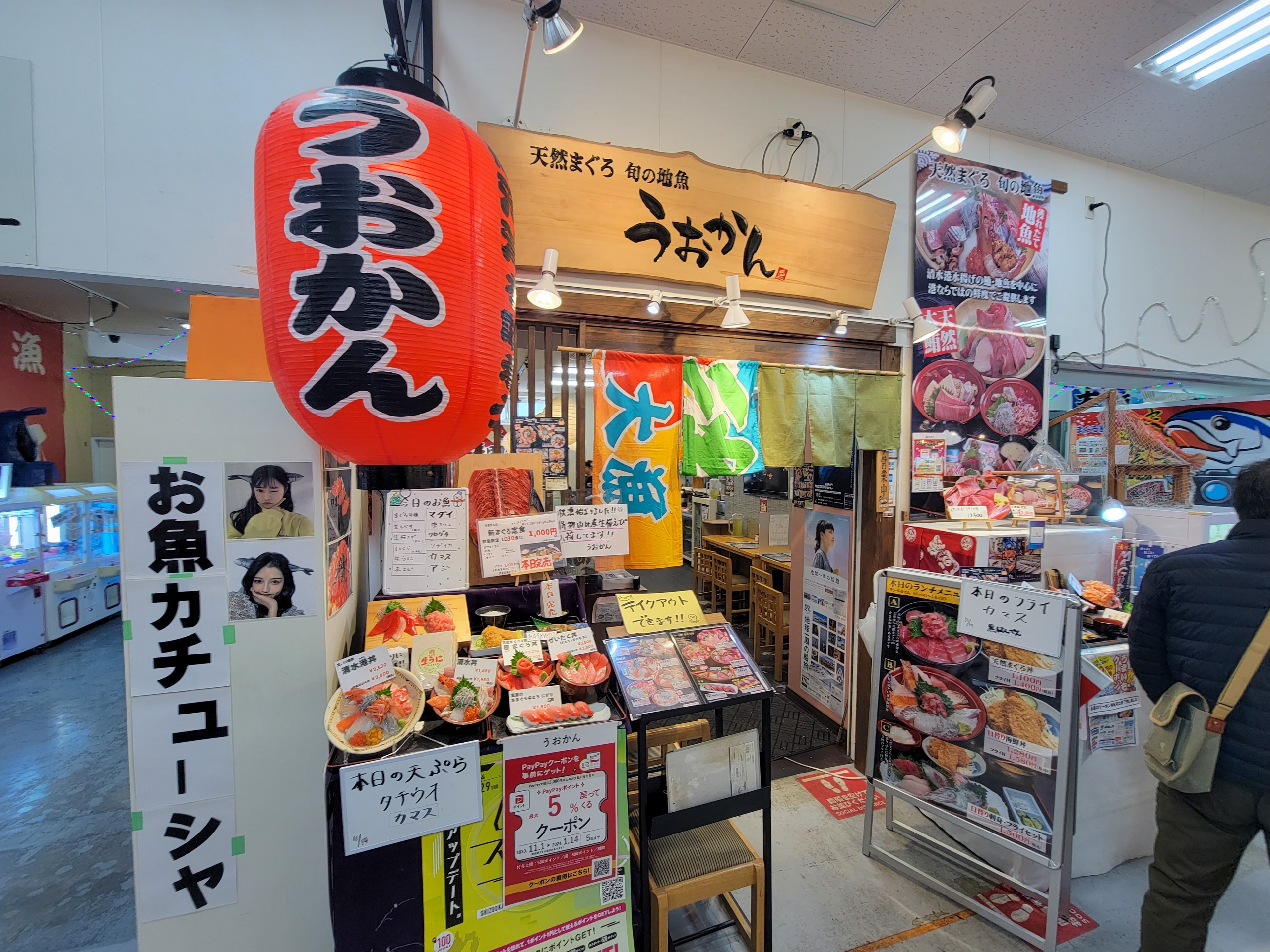 グーグルの口コミを信じて、まぐろ館1階の「うおかん」に入店。空いていたので、4人席のテーブルに案内されました。