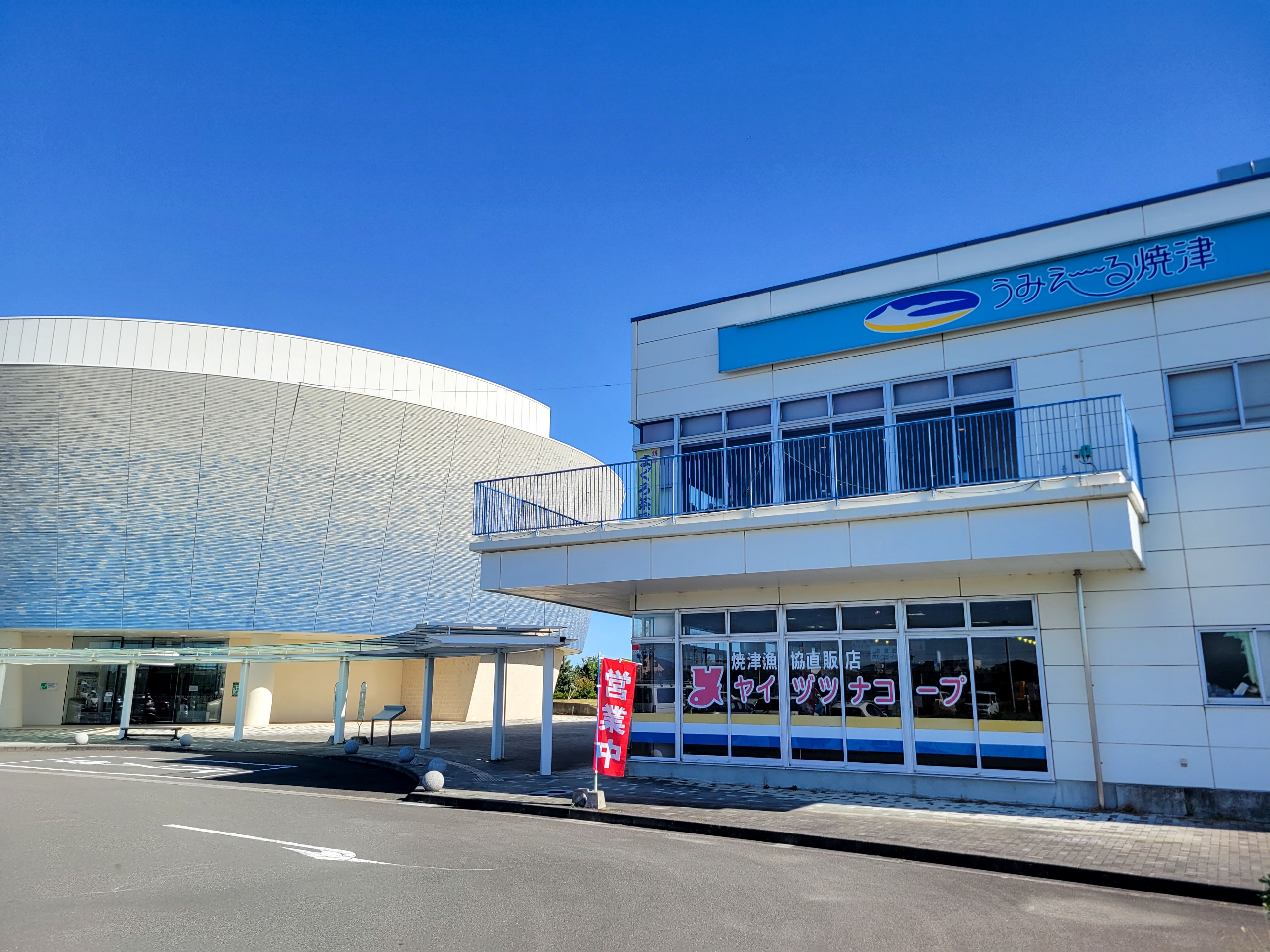 焼津港にあるお買い物や食事処がはいった施設。左は深層水を使ったプールやスパのあるアクアスやいづ。