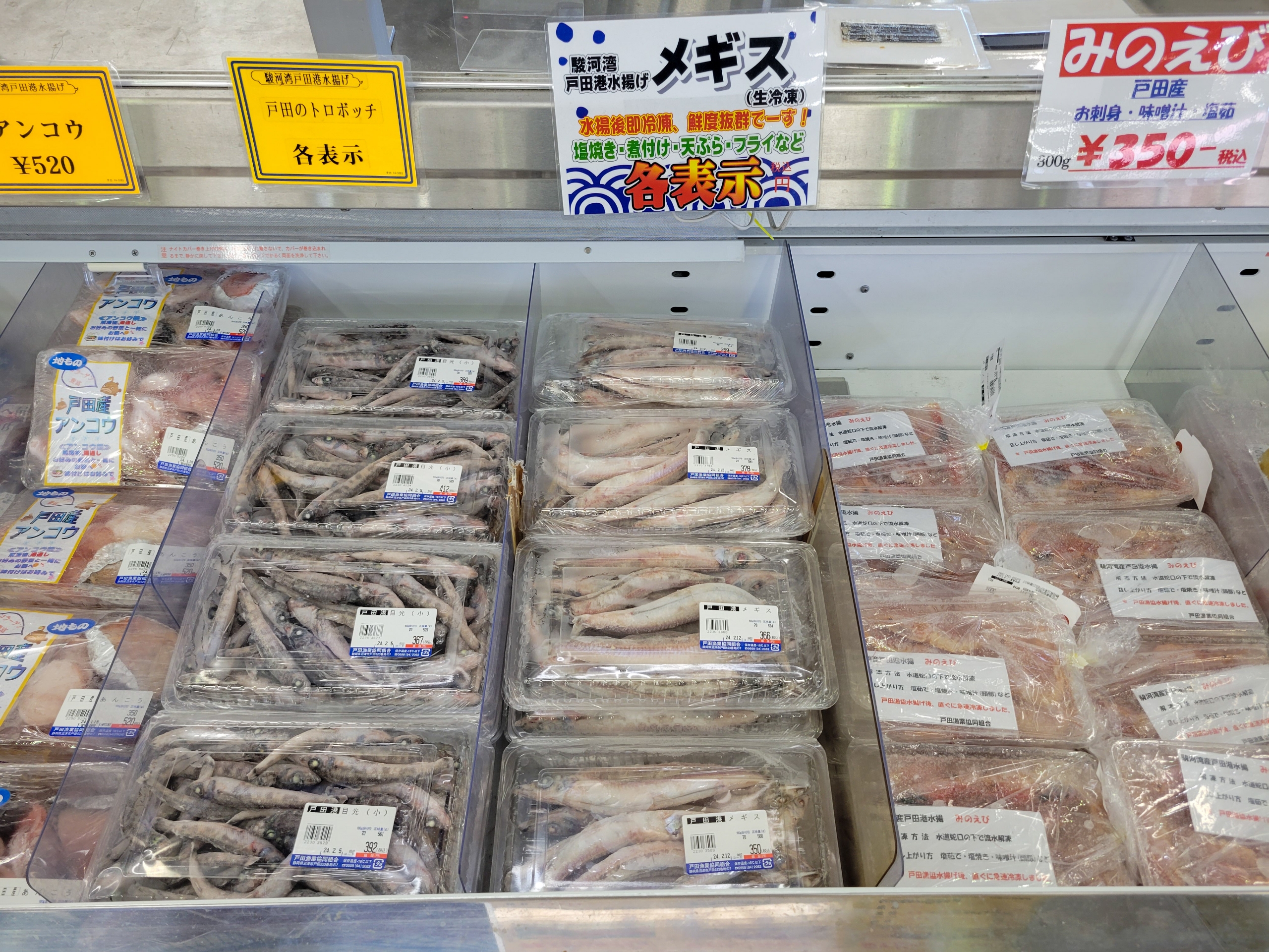 鮮魚は扱っていなく、冷凍物が多かったです。禁漁期間もあるので、この売り方がベストなんでしょうね。あと深海魚は水圧の強い中で泳いでるので、水揚げした後は身が劣化しやすそうですね。