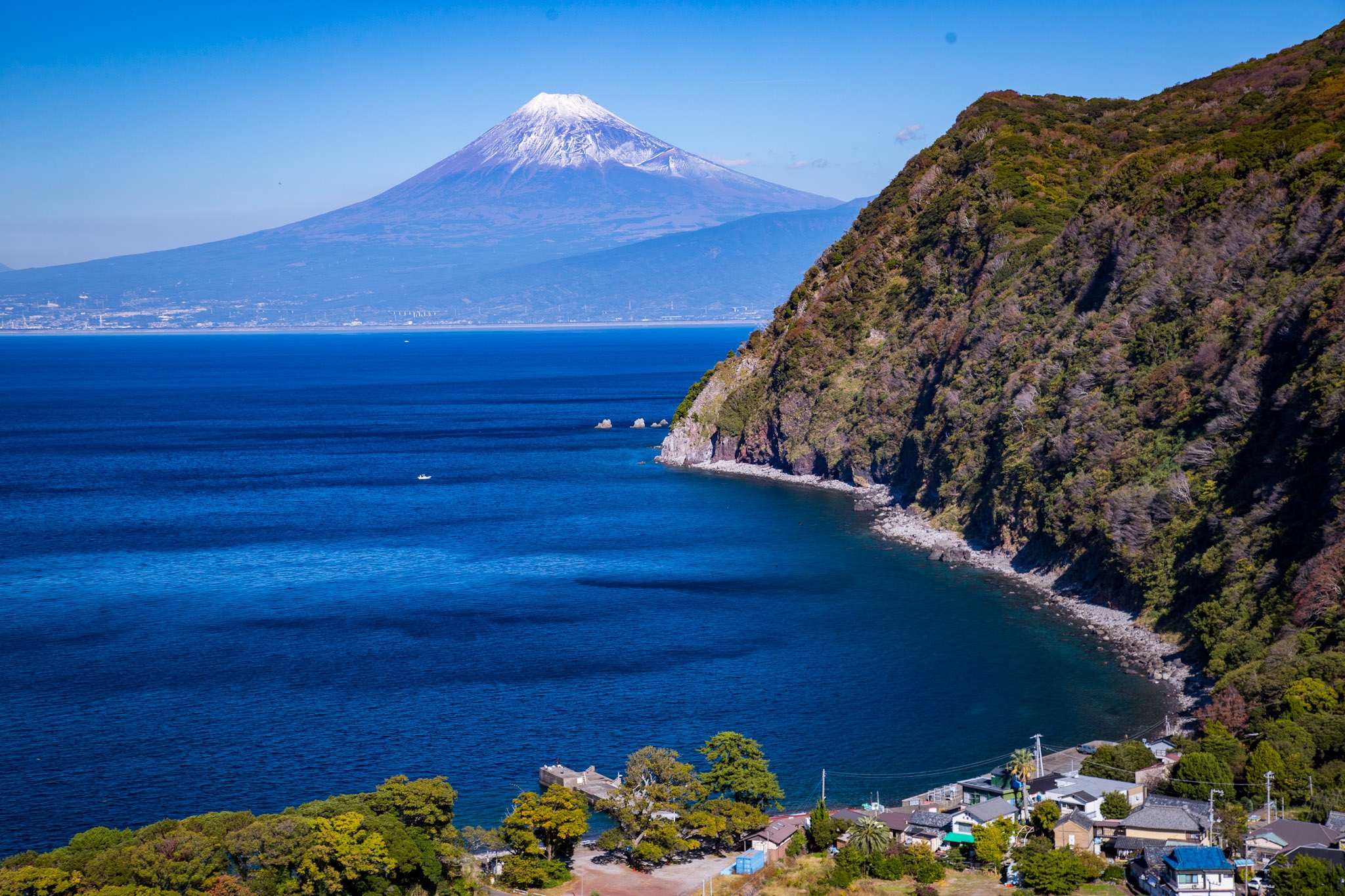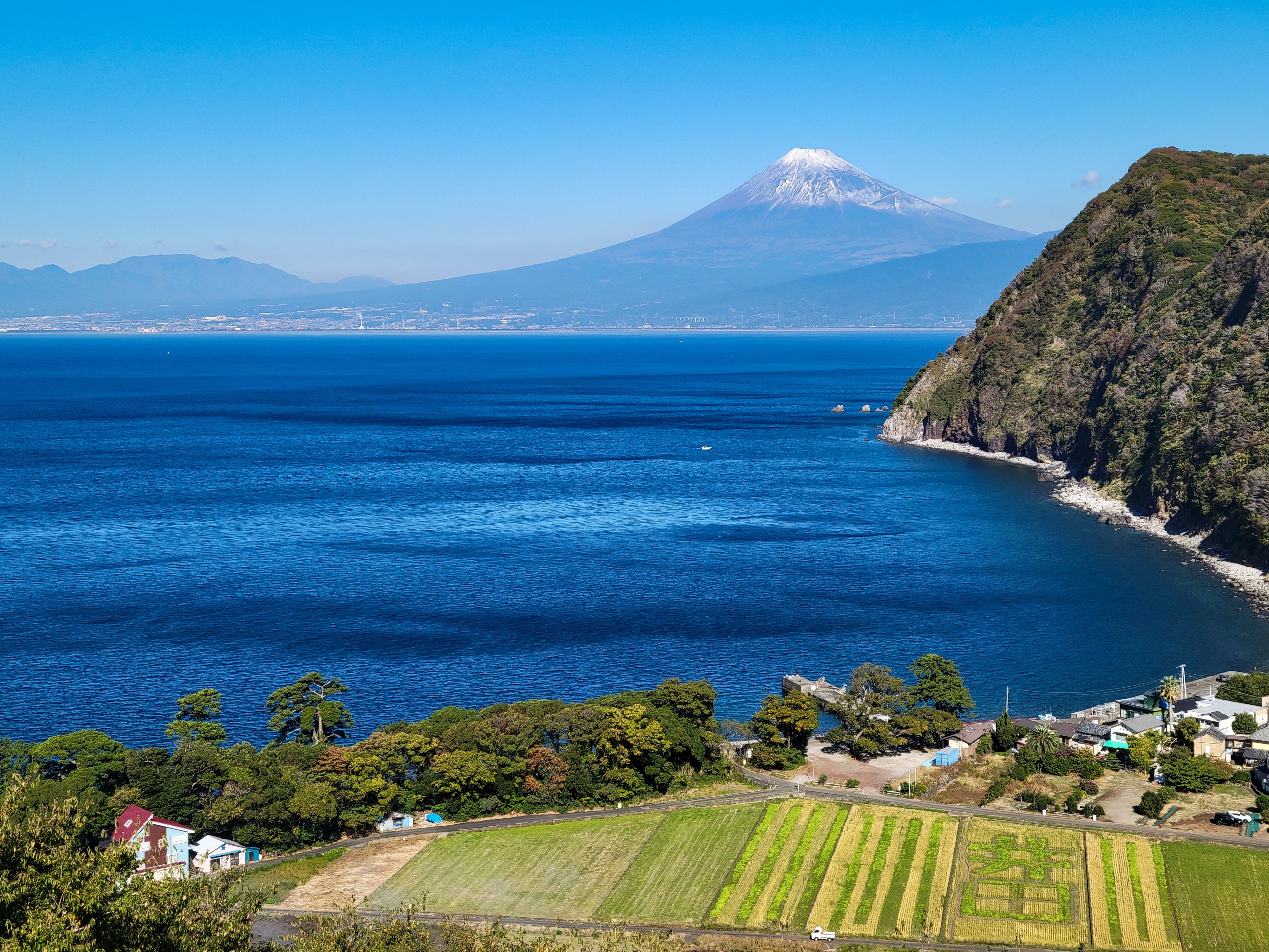 煌めきの丘より。振り返るように、富士山と井田の集落を眺められます。海岸沿いは断崖になっているので、この前後では山の中に道路が建設されています。