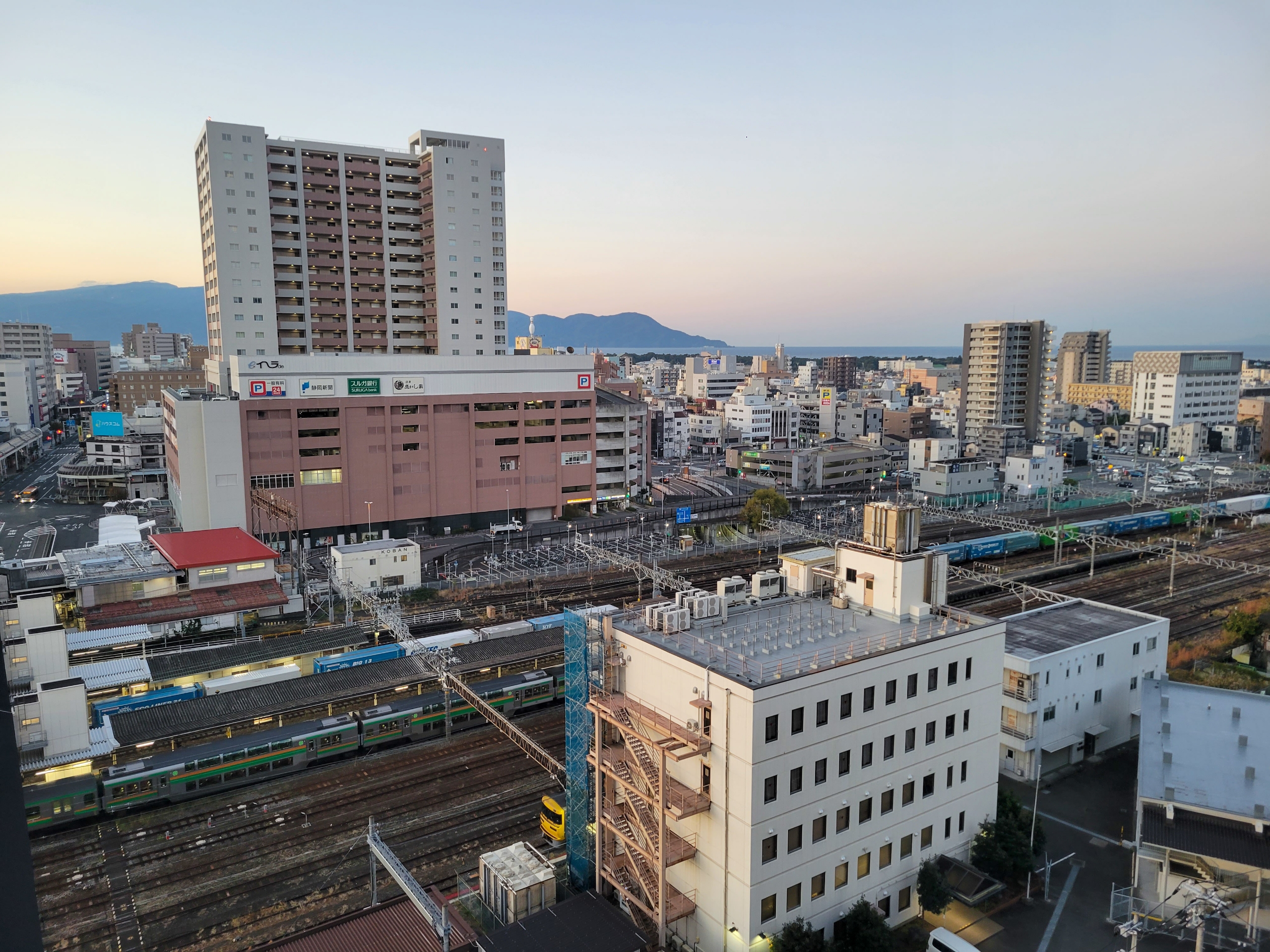始発は4:55分と地方都市にしてはかなり早いので、すでに駅のホームは明るい。首都圏への直通列車も5時台からある。同じくJR東海、滋賀県米原駅から名古屋方面への始発は6時台からなので、もう少し早くならないのかなと思うほど。