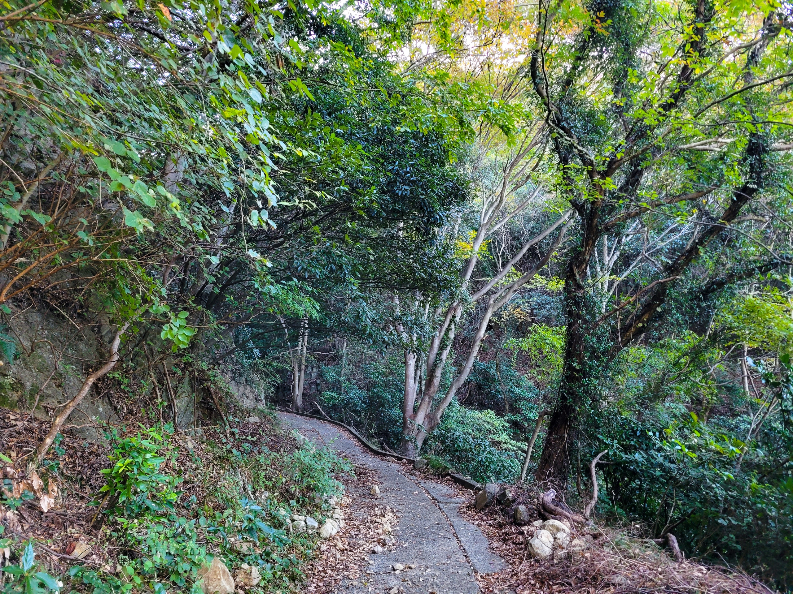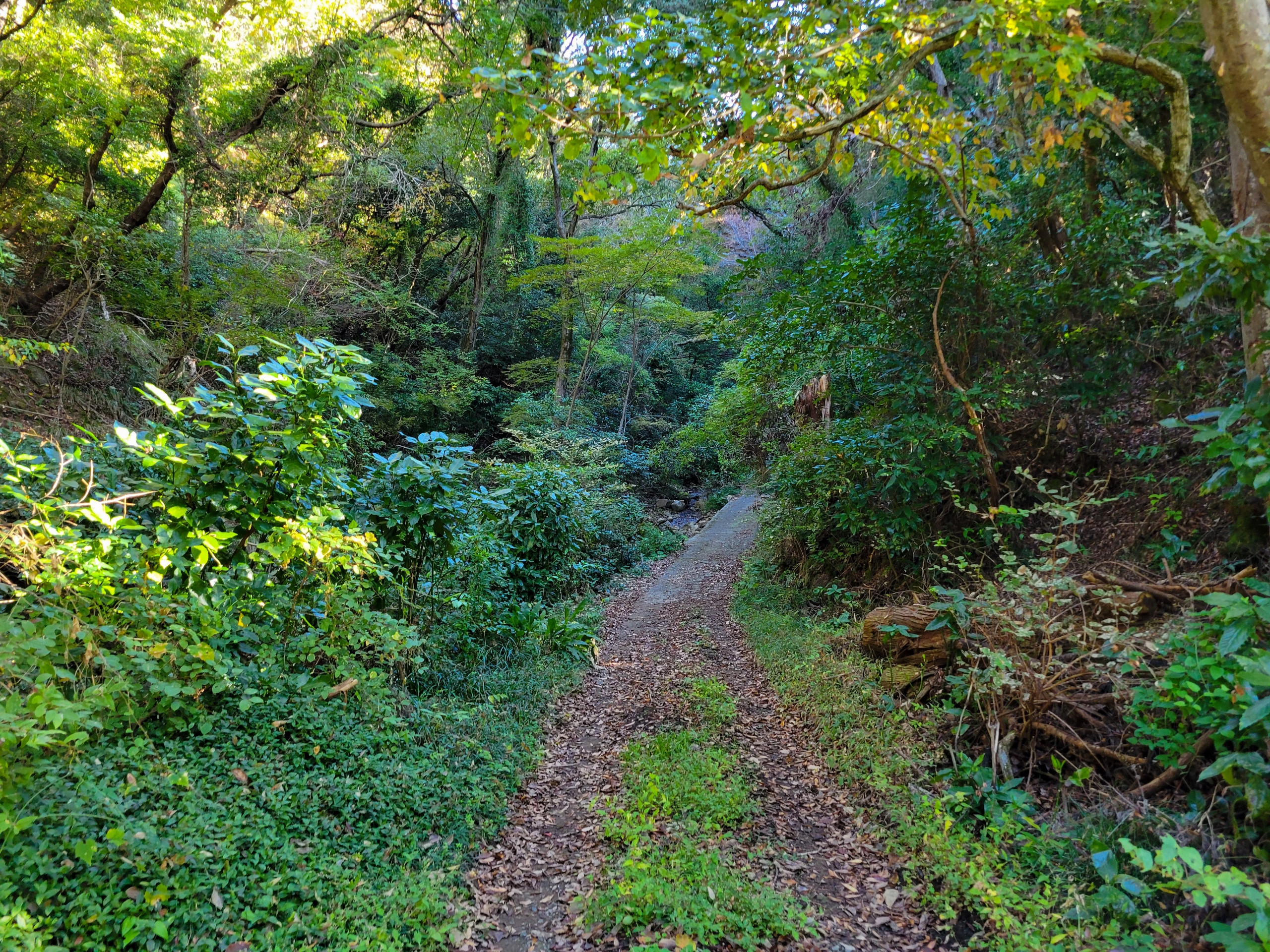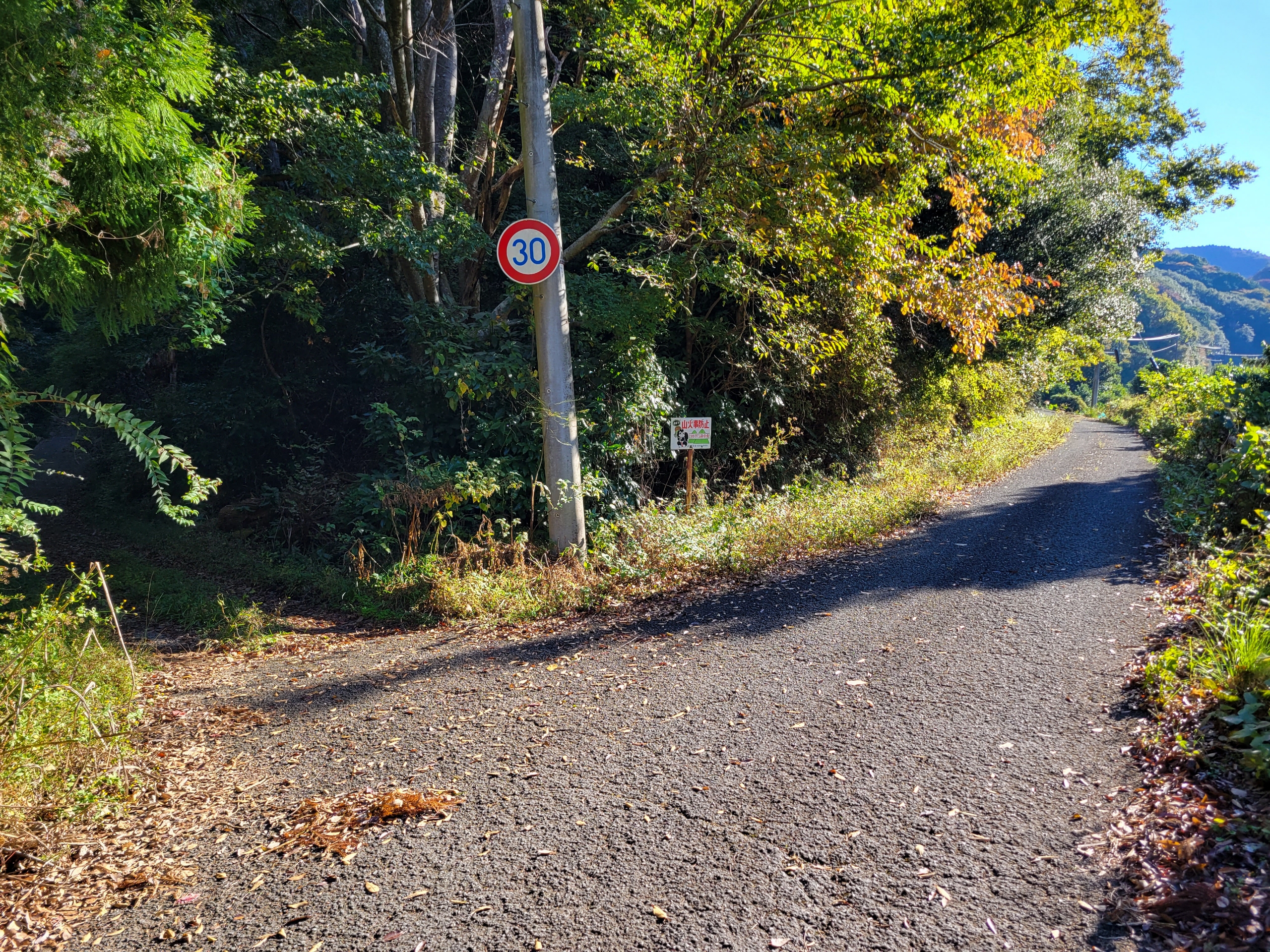 薄暗くなり一気に、不安になりました。道は細くなり、四輪車はアウト。落ち葉だけじゃなく、土砂が流れている場所もあるので、モトクロスタイプのバイクなら走れそうですが、原付ならアウトでしょう。
