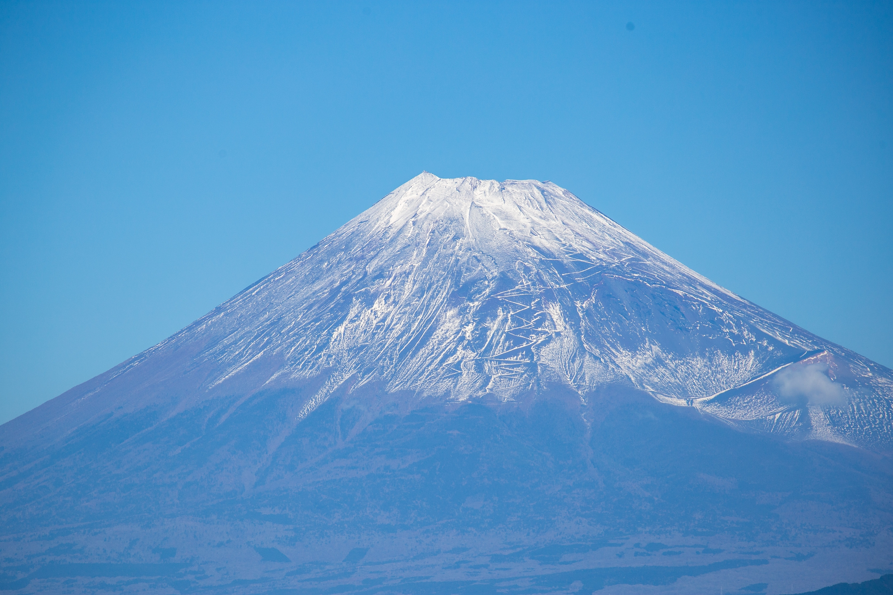 登ってきた甲斐がありました。陸地と海との絶妙なバランスがいいですね。手前の愛鷹山が富士山の裾と一体化して、ひとつの山に見えるのがポイント高いですね。ここは夕景も美しそうだけど、とても一人で来る勇気はないな。