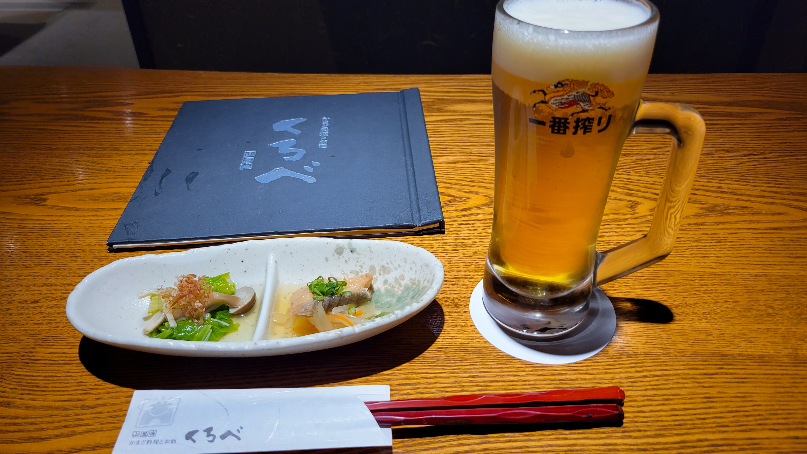 基本のくろべ御膳は宿泊代に含まれ、生ビールは無料券があるので、2,156円です。旅行支援クーポンを2,000円使って、156円のお支払です。