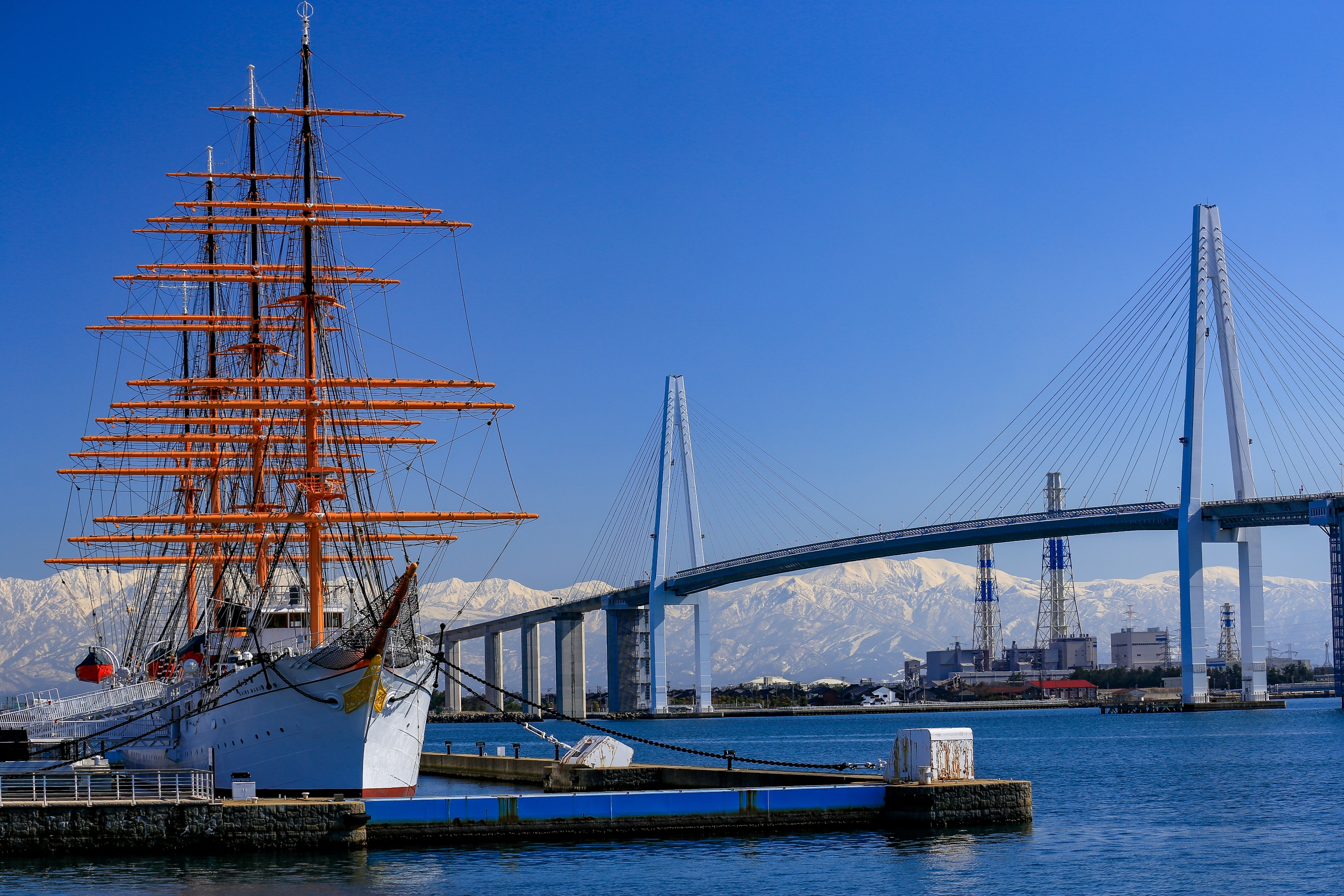 ユネスコが後援する「世界でもっとも美しい湾」に登録されている富山湾。その中央にある富山新港の入口にある海王丸パークは、係留されている帆船海王丸と高さ127mの美しい斜張橋「新湊大橋」、そして3,000m級の立山連峰が一度に望める贅沢なビュースポットです。